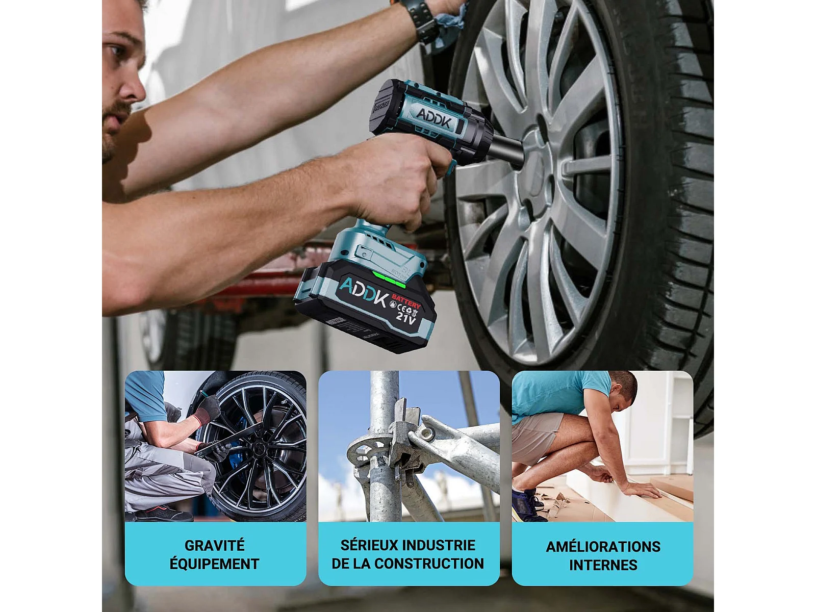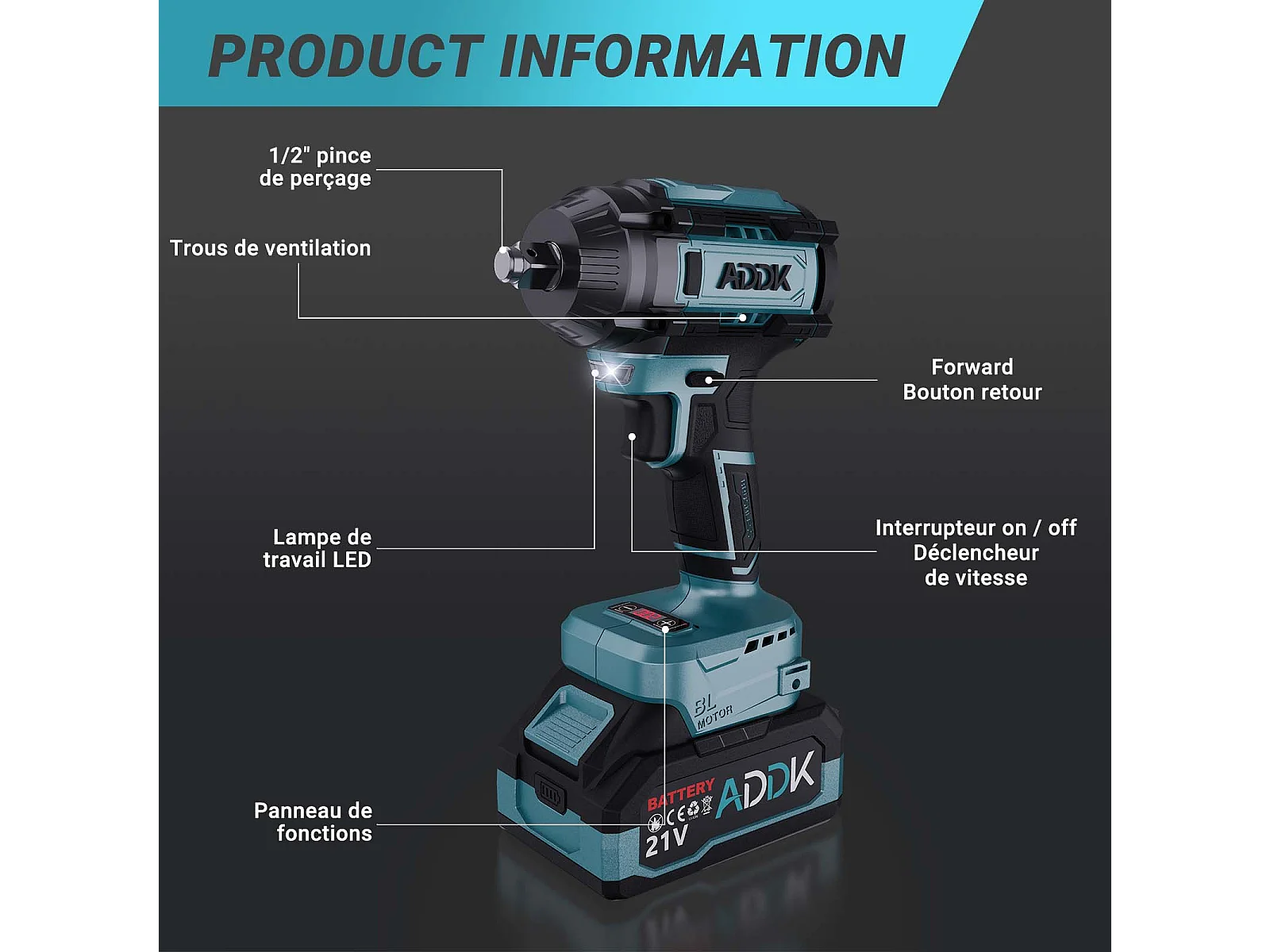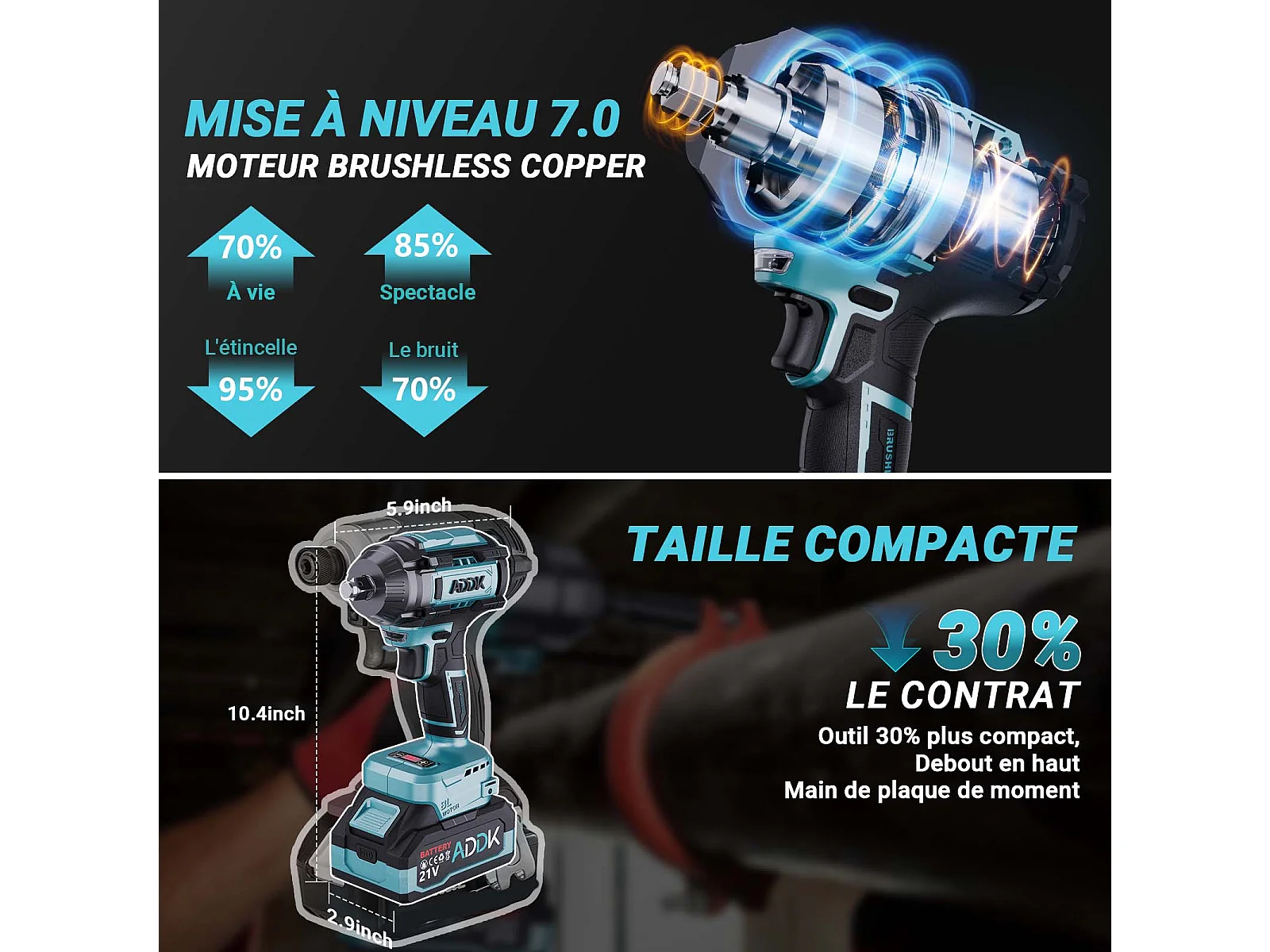 Clé à chocs sans fil Brushless, 1000Nm Boulonneuse a Choc avec 2x2.1Ah Batterie, 6 vitessse, avec 12pcs Accessoires
