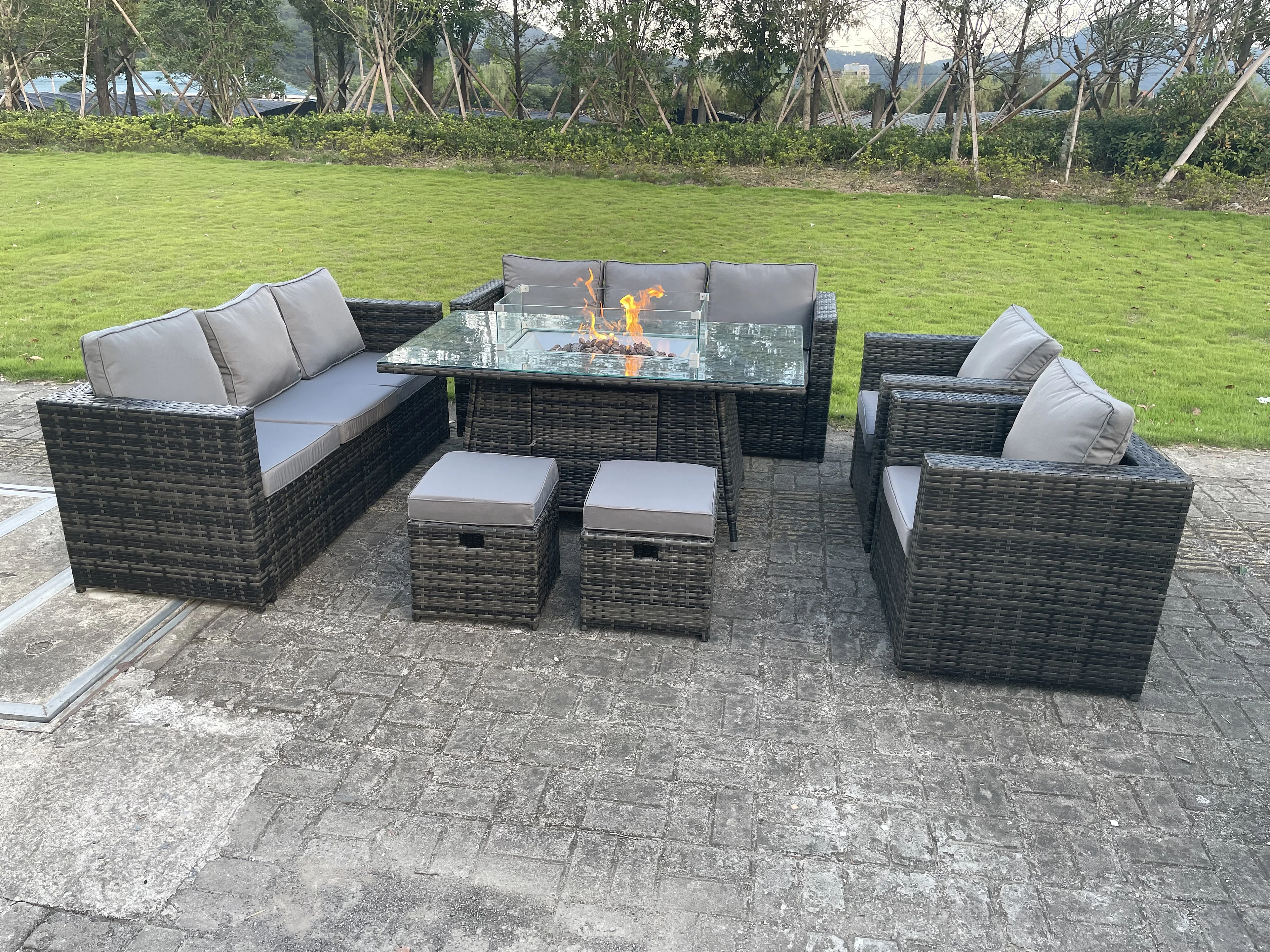 10 places Mobilier À Dîner De Jardin en rotin ave Canapé Chaises Table de foyer à gaz Tabourets Mélange gris foncé