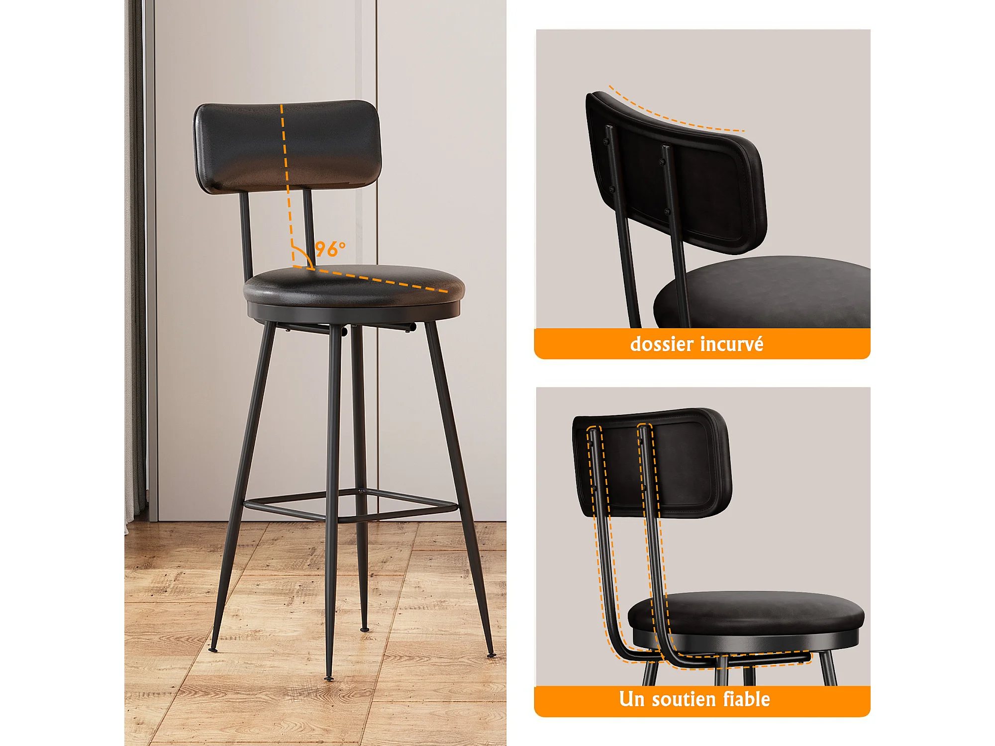 Tabourets de bar réglables pivotants 2 pièces, cuir synthétique noir, avec repose-pieds et dossier (46x53.5x85-106cm)