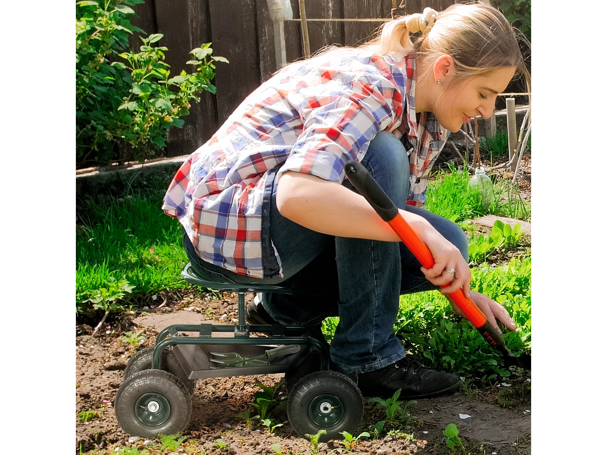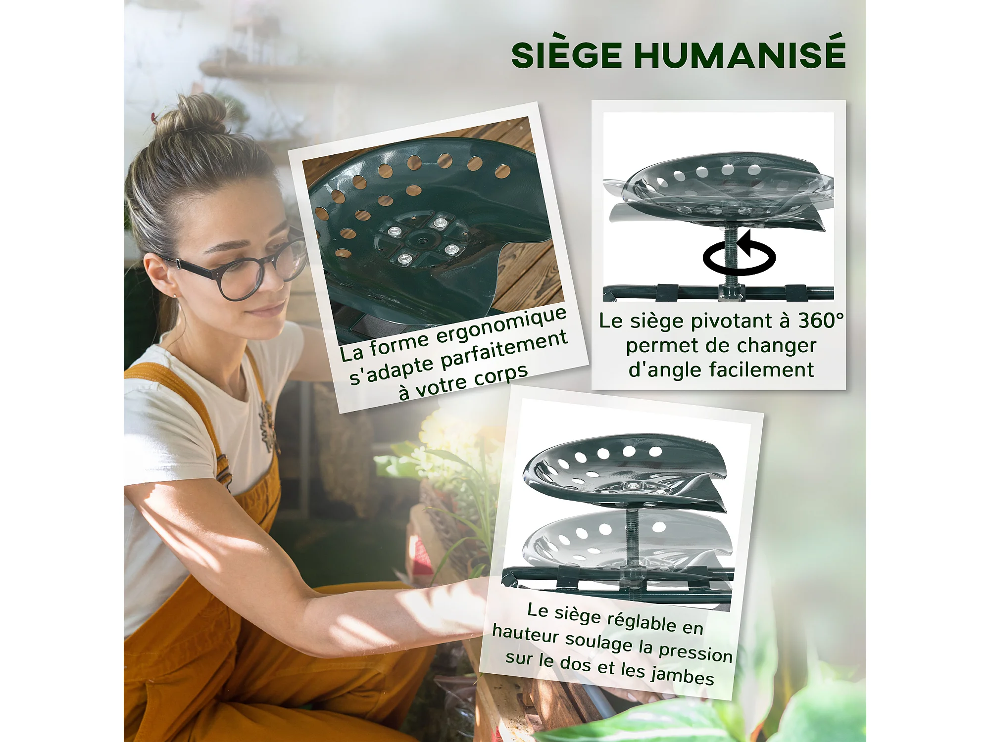 2 en 1 tabouret pivotant réglable chariot mobile de jardin charge max. 150 Kg rangement acier vert