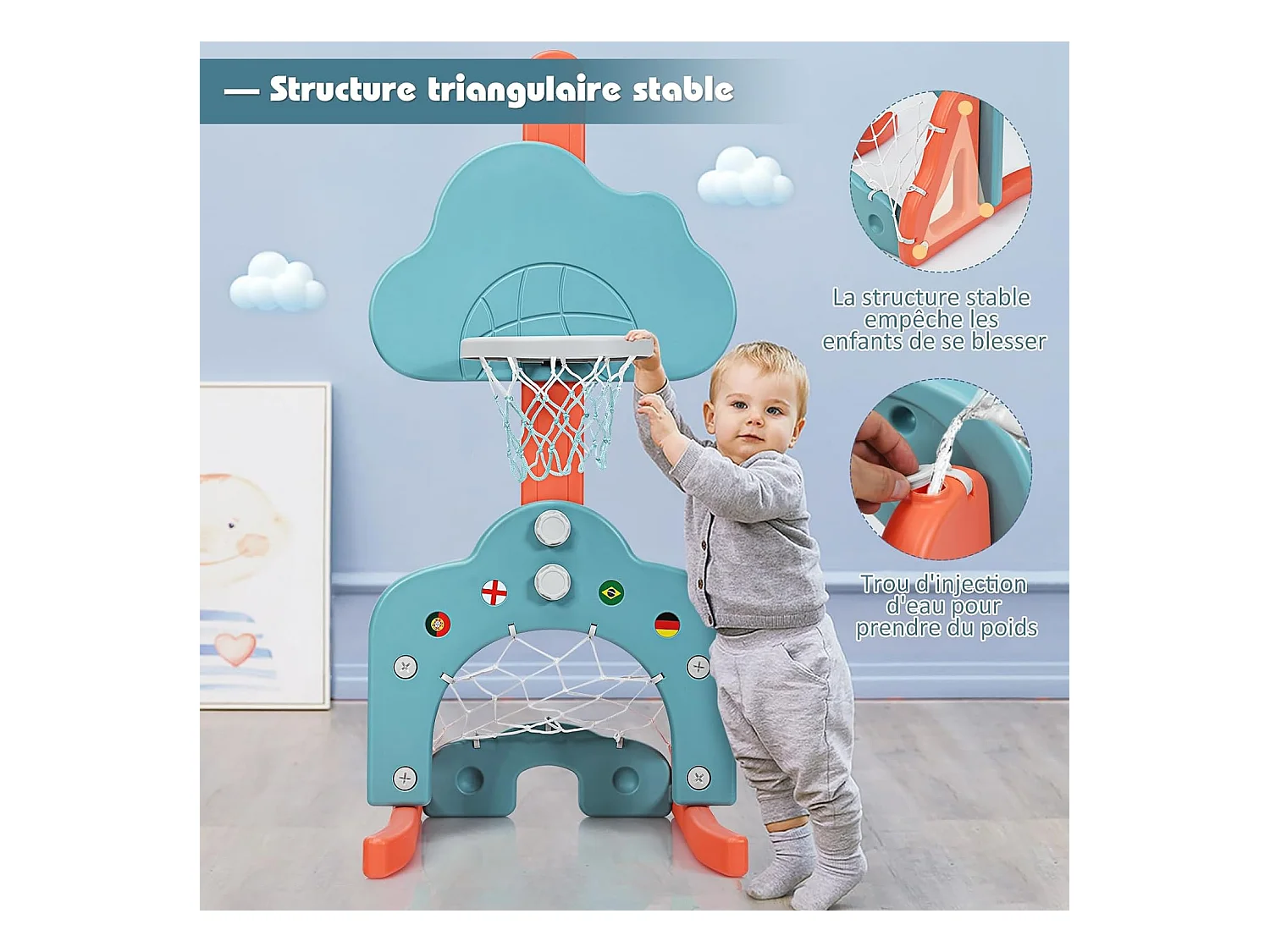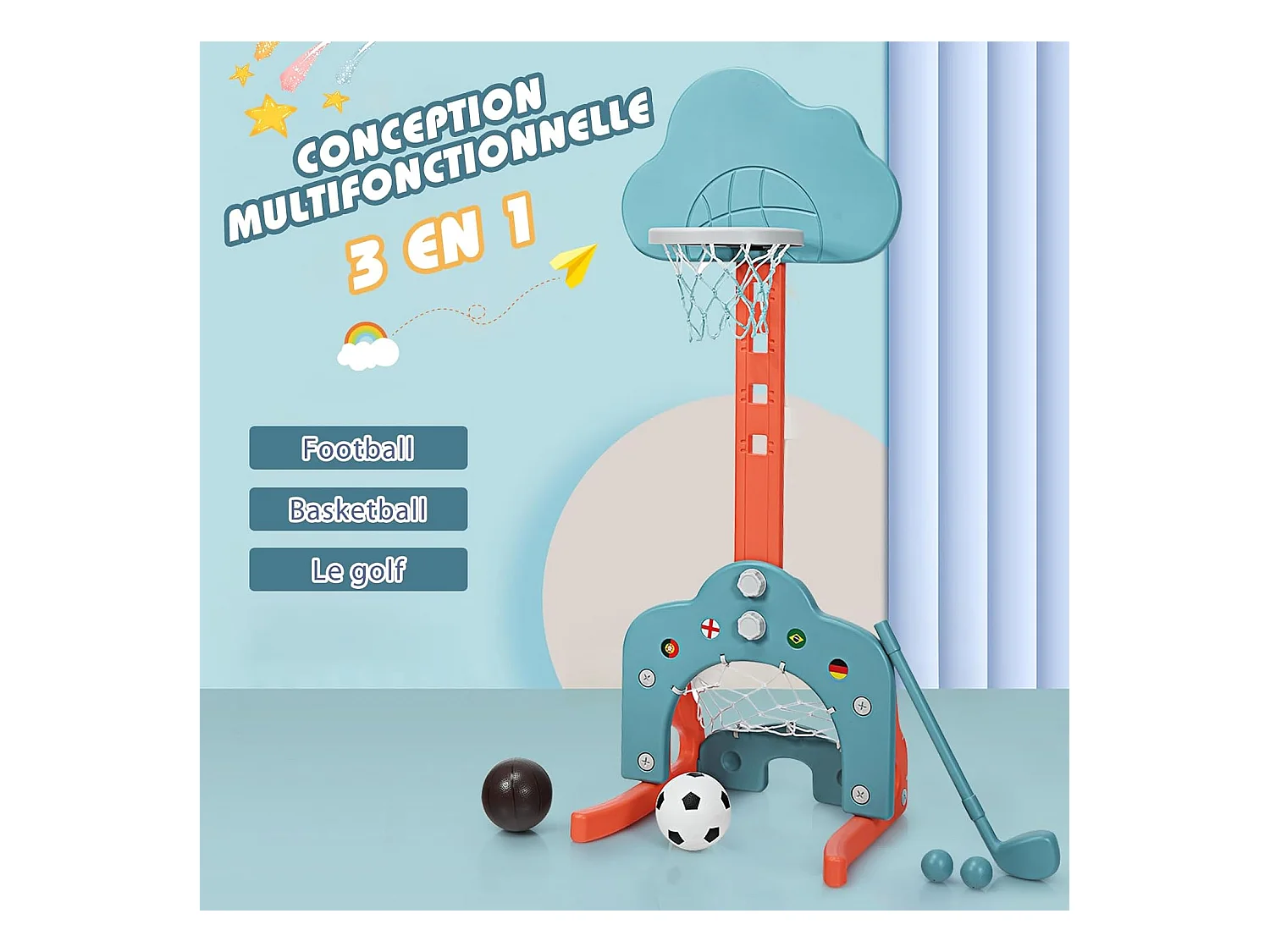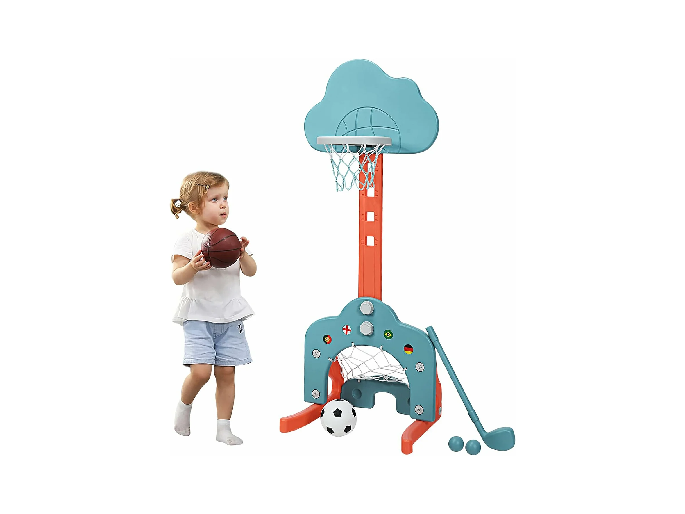 3 en 1 Panier de Basketball Enfant Hauteur Réglable 77-116cm avec Jeu de Golf et de Football, Support de Basketball avec Panneau en Forme Nuage pour Enfant 2-7 Ans