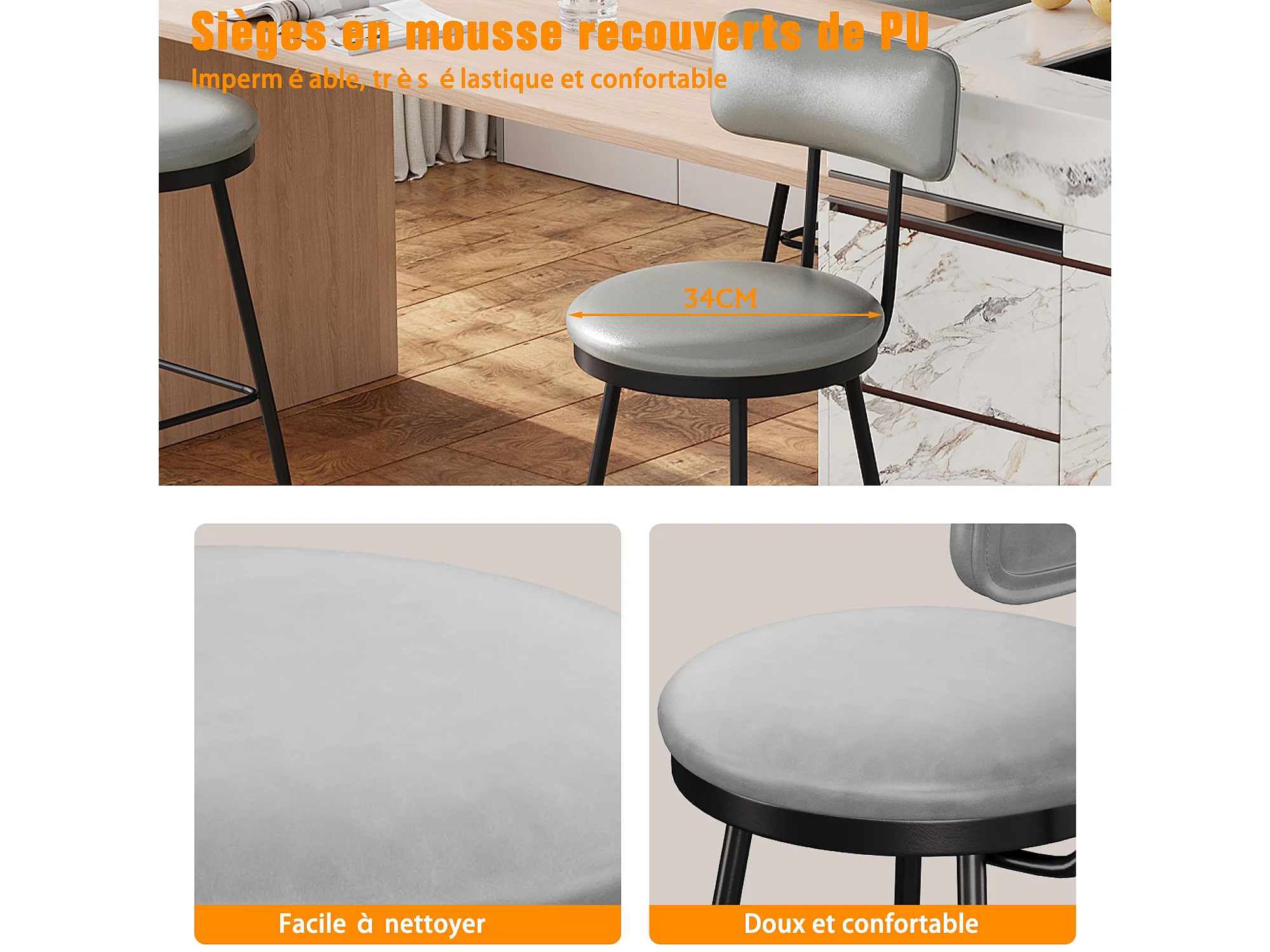 4 Chaises de Bar Grises avec Dossier, Style Industriel, 65cm Hauteur d'Assise