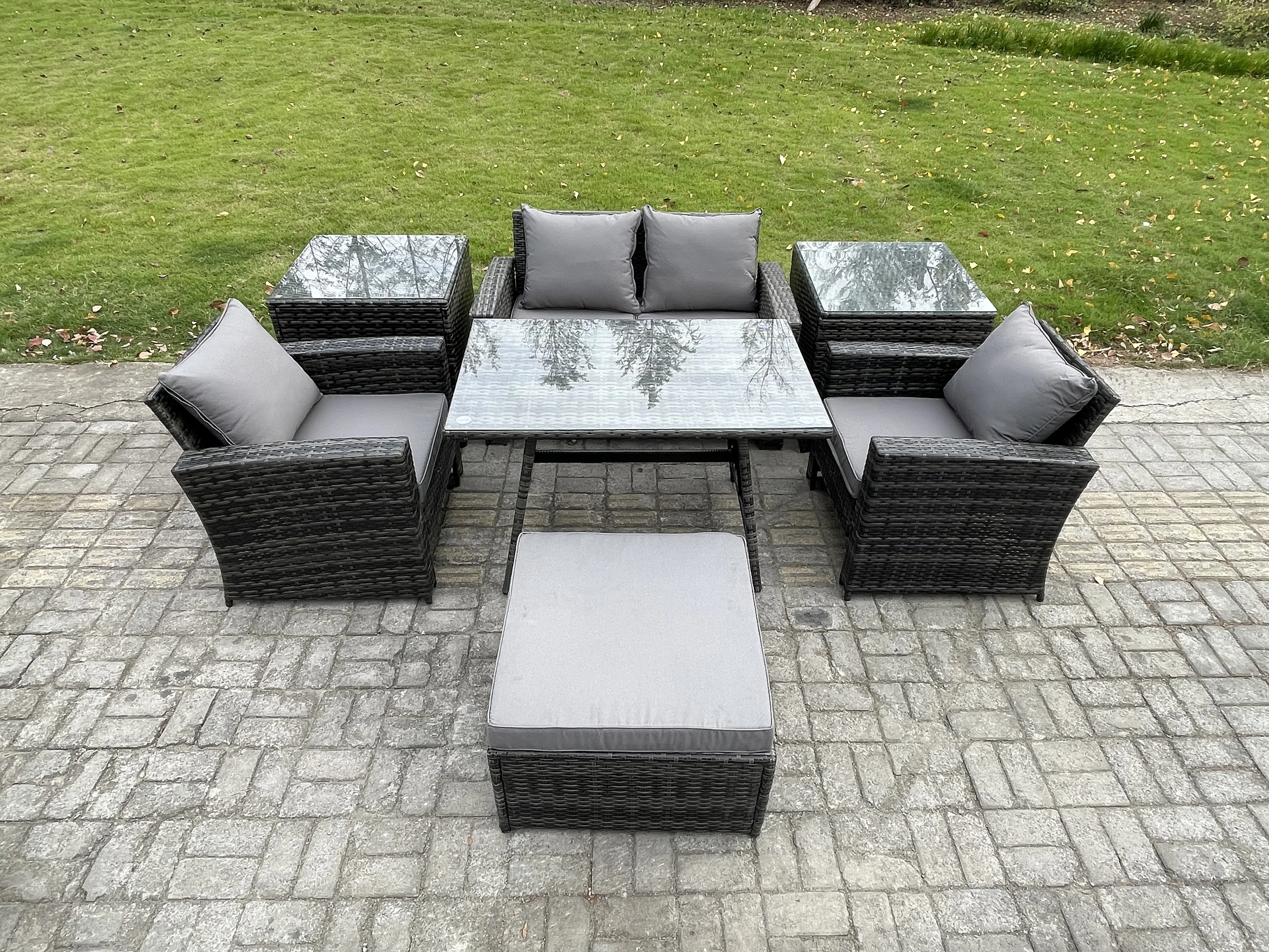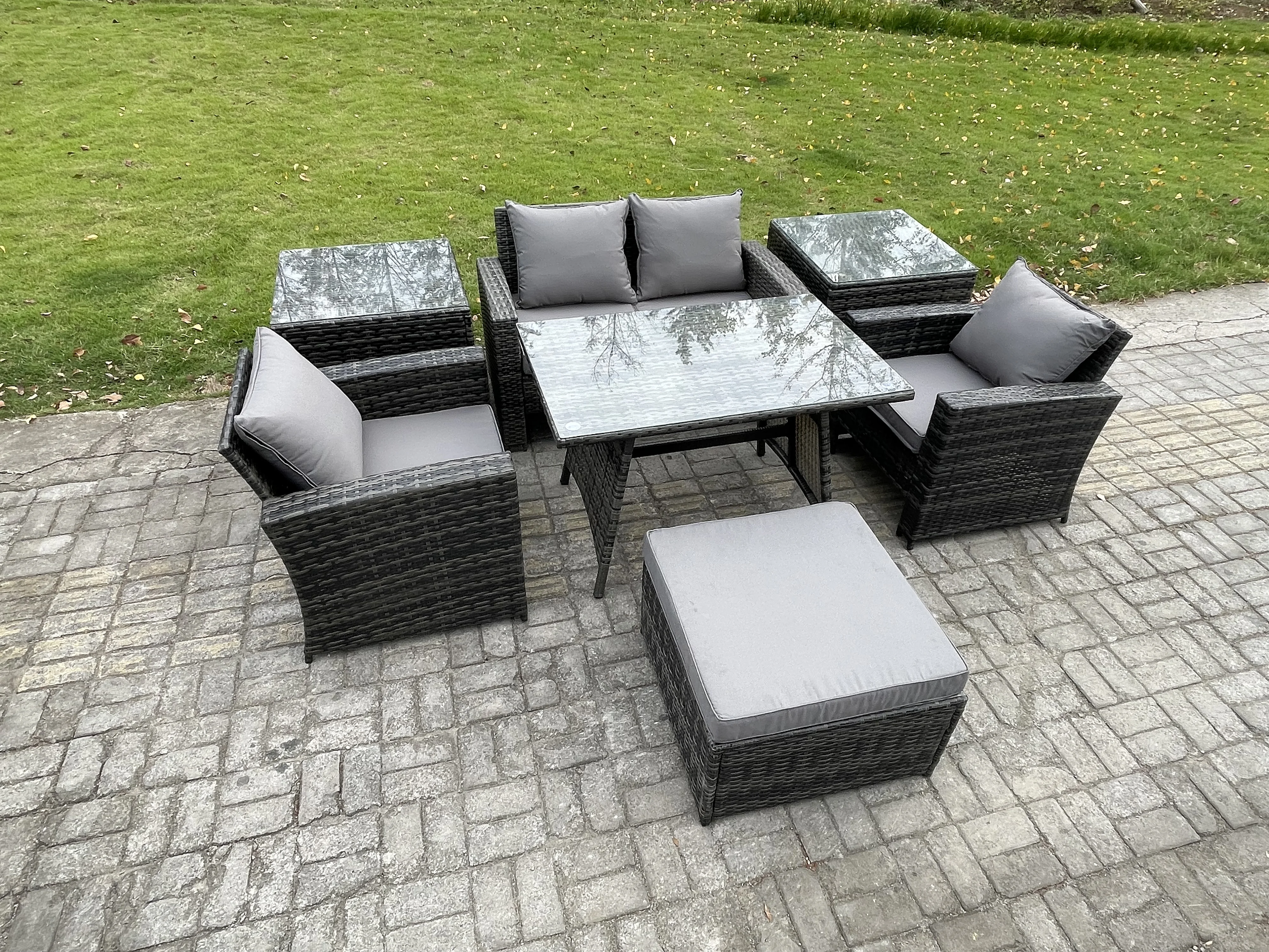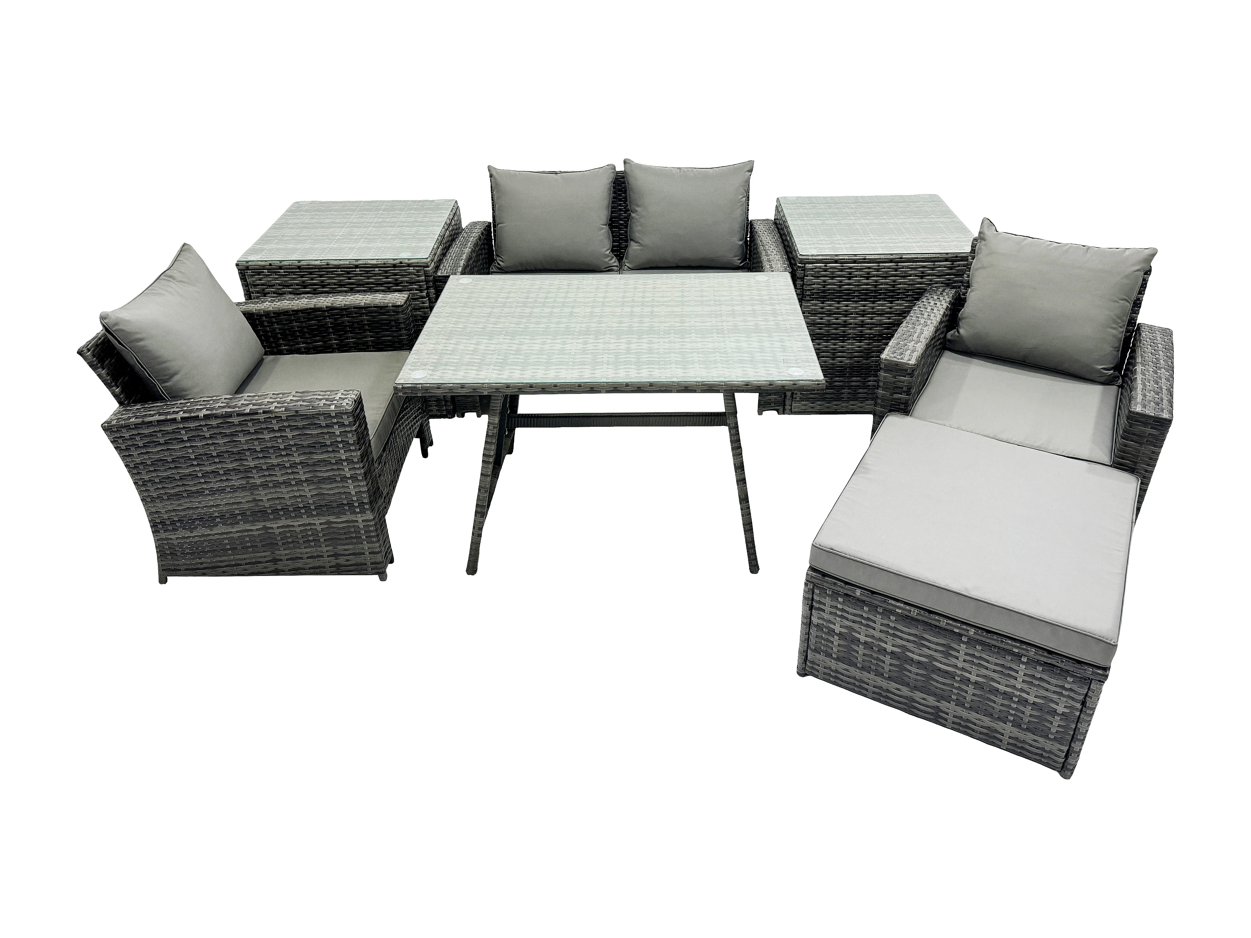 5 places Ensemble de canapé en rotin extérieur avec Table à manger 2 Tables d'appoint Grand tabouret Gris foncé mixte