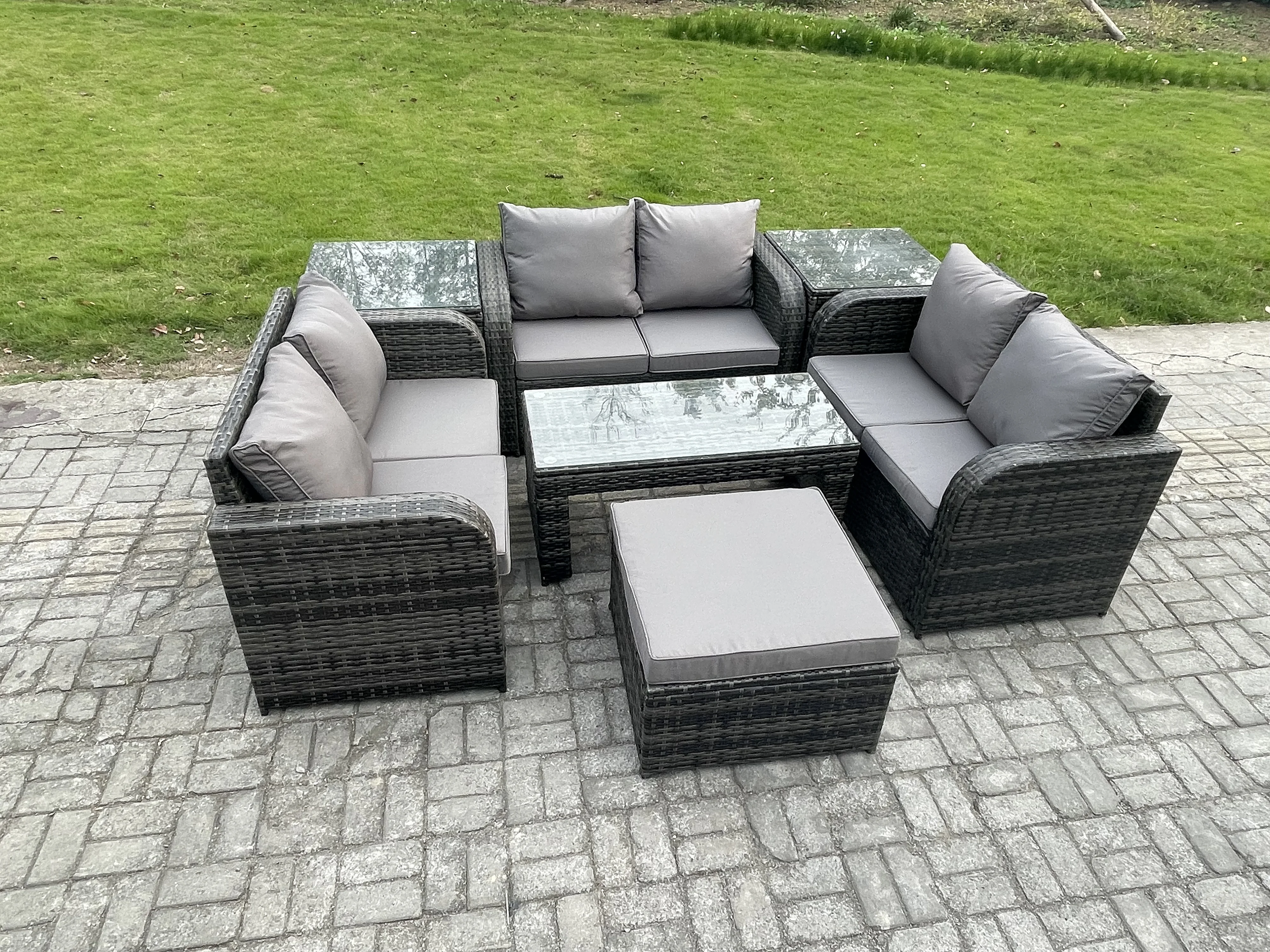 7 places Salon de jardin Meubles de jardin avec Table basse Canapé à deux places 2 Tables d'appoint Grand tabouret Gris foncé mixte
