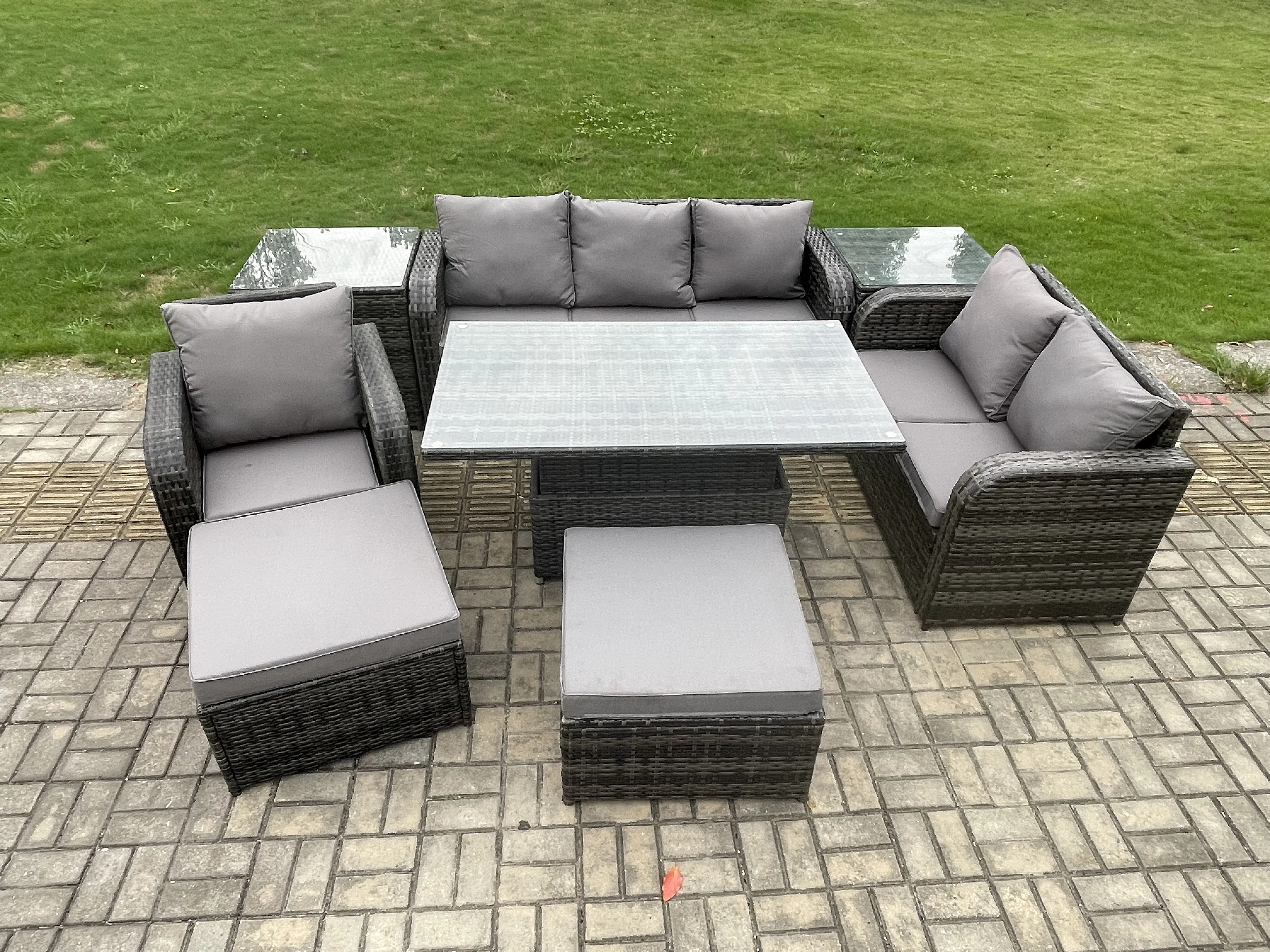 8 places Salon de jardin exterieur Table à manger réglable en hauteur Canapé d'amour Fauteuil avec 2 Tables d'appoint 2 Grand tabourets Gris foncé mixte