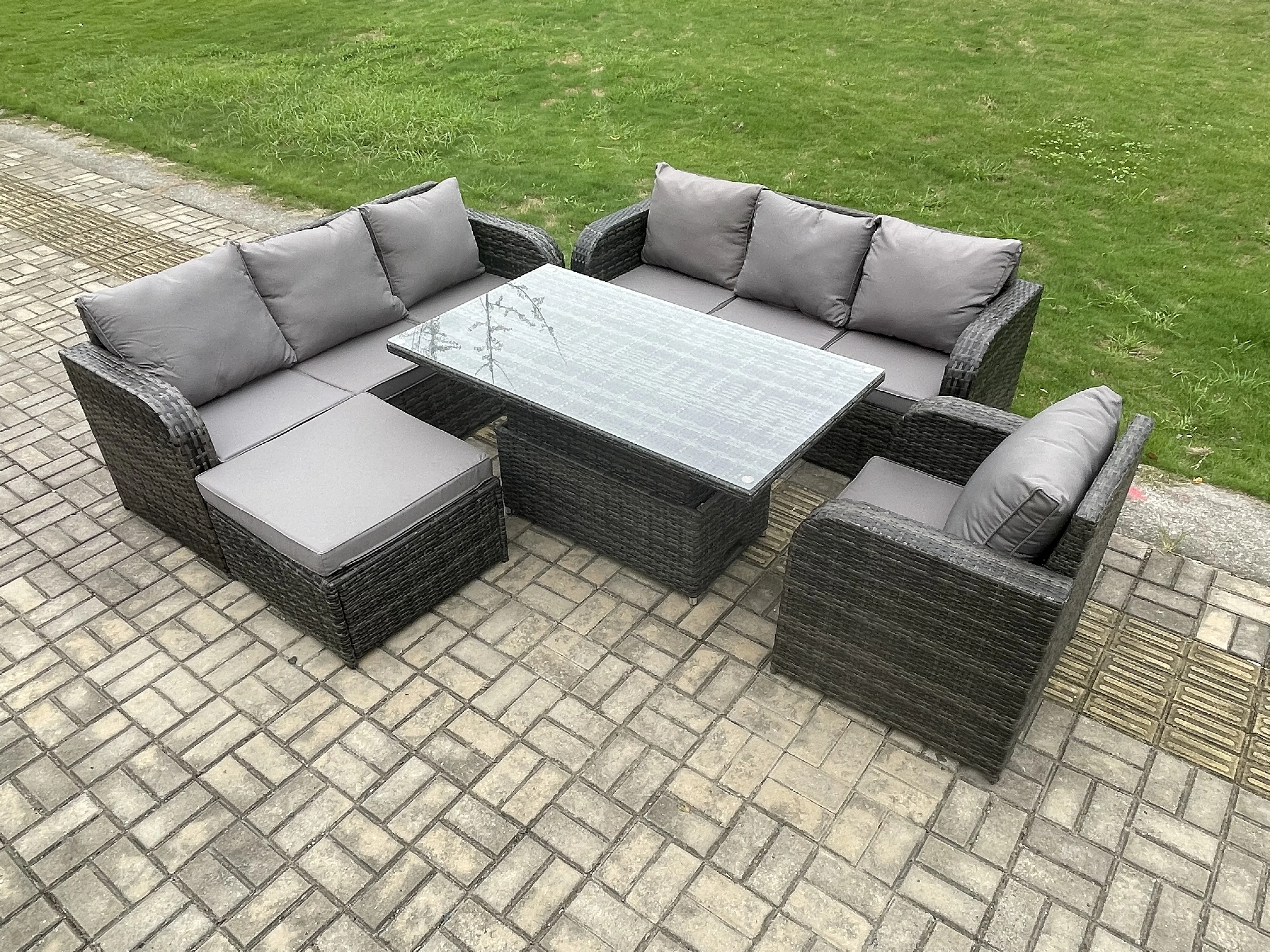 8 places Salon de jardin Table à manger réglable en hauteur Canapé avec Chaise inclinable Grand tabouret Gris foncé mixte