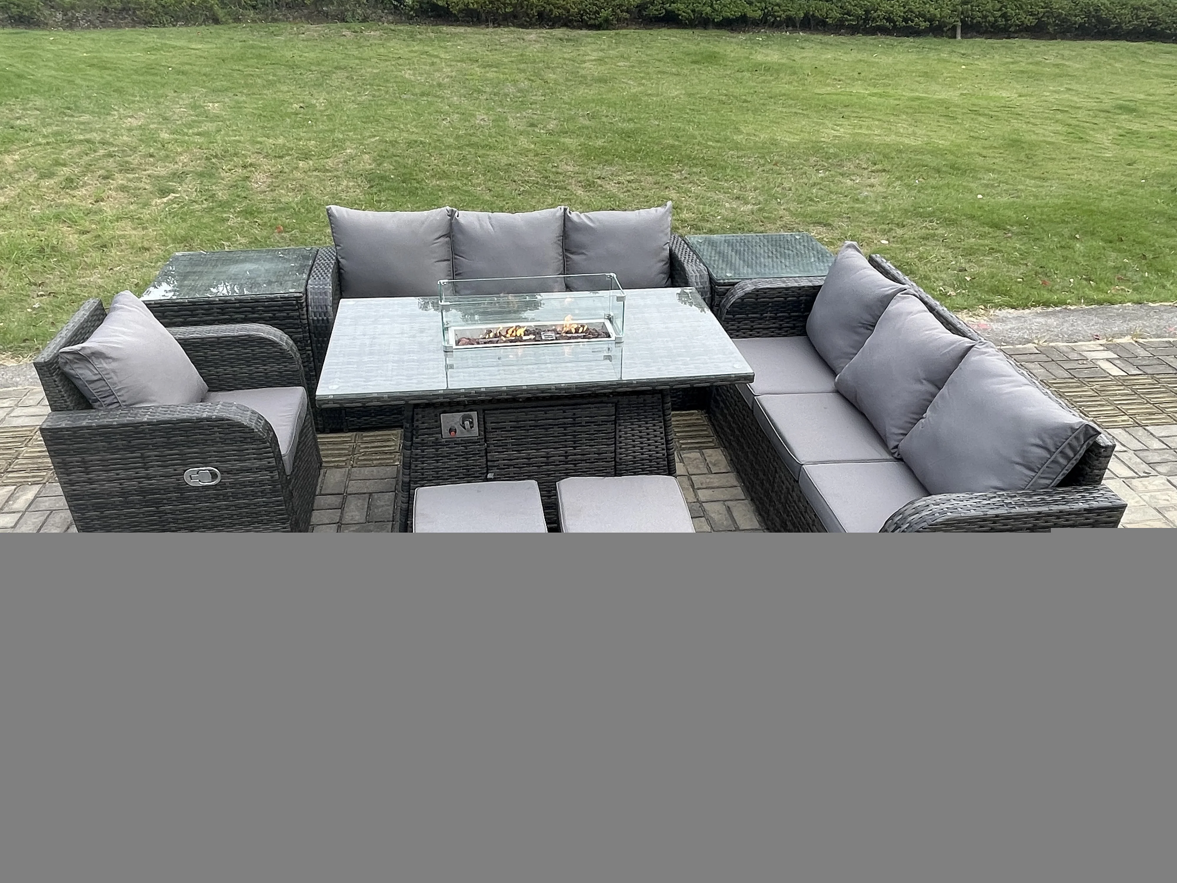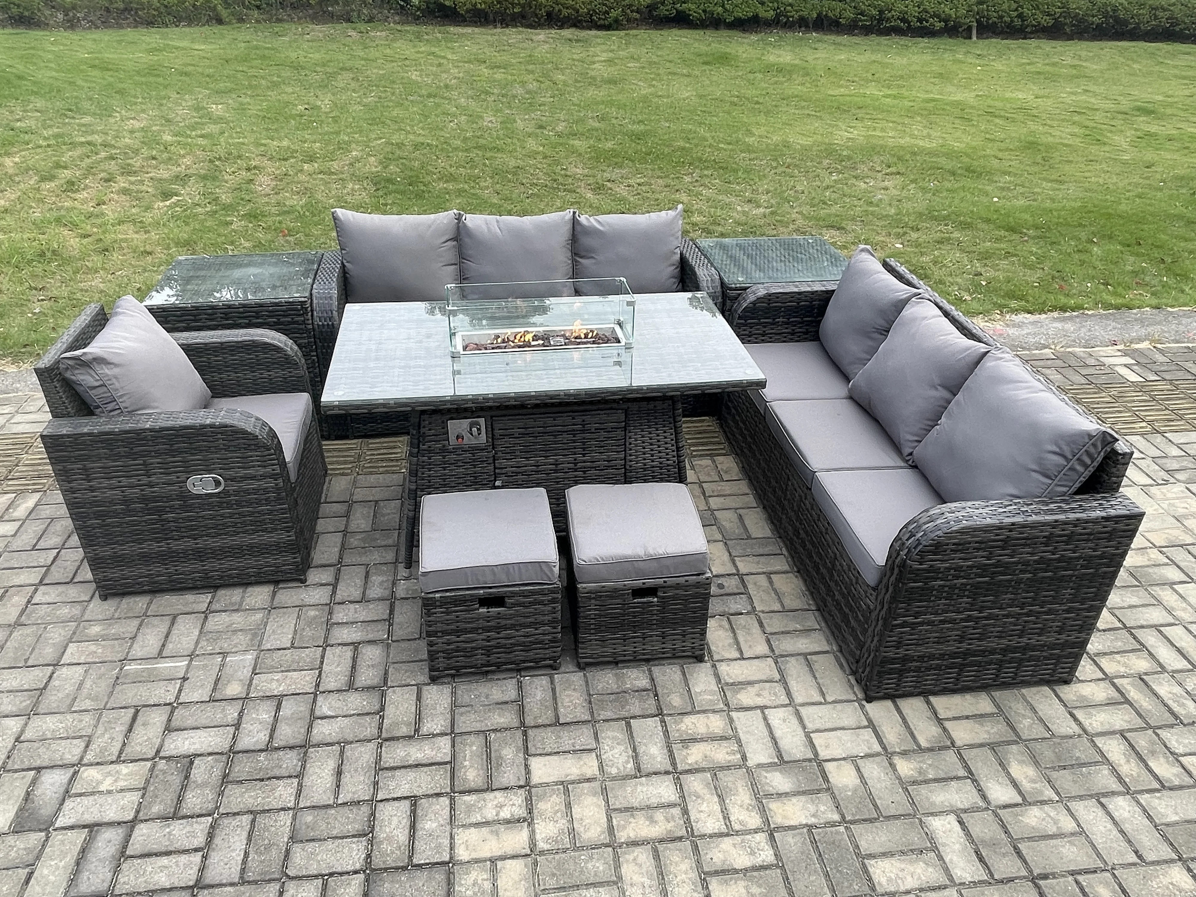 9 places Salon de jardin Table de foyer à gaz Chaise inclinable Canapé 3 places Intérieur Extérieur avec Table d'appoint 2 Petits tabourets