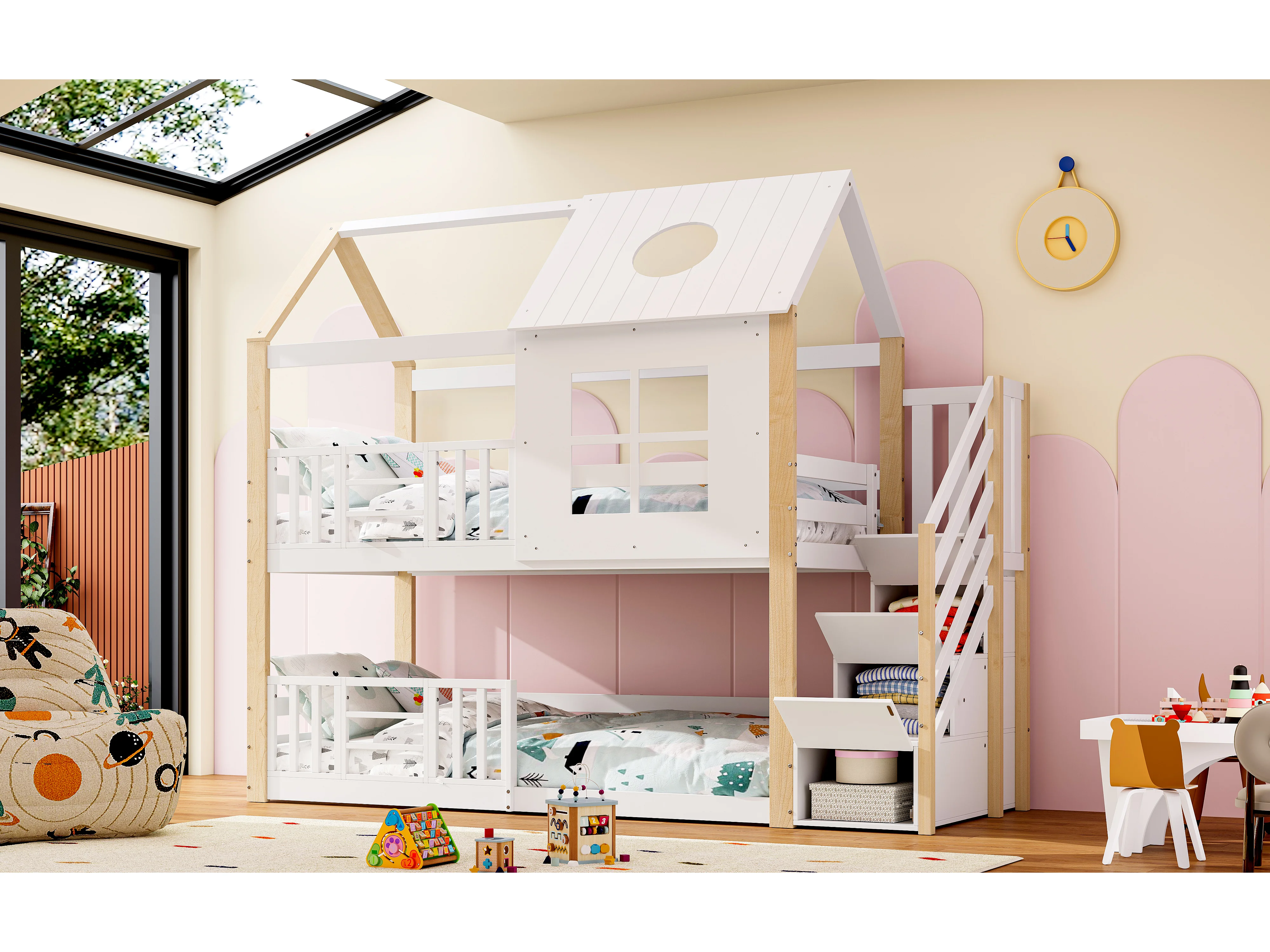 90x200cm Lit superposé avec échelle de Rangement, lit d'enfant avec barreaux Anti-Chute, Blanc