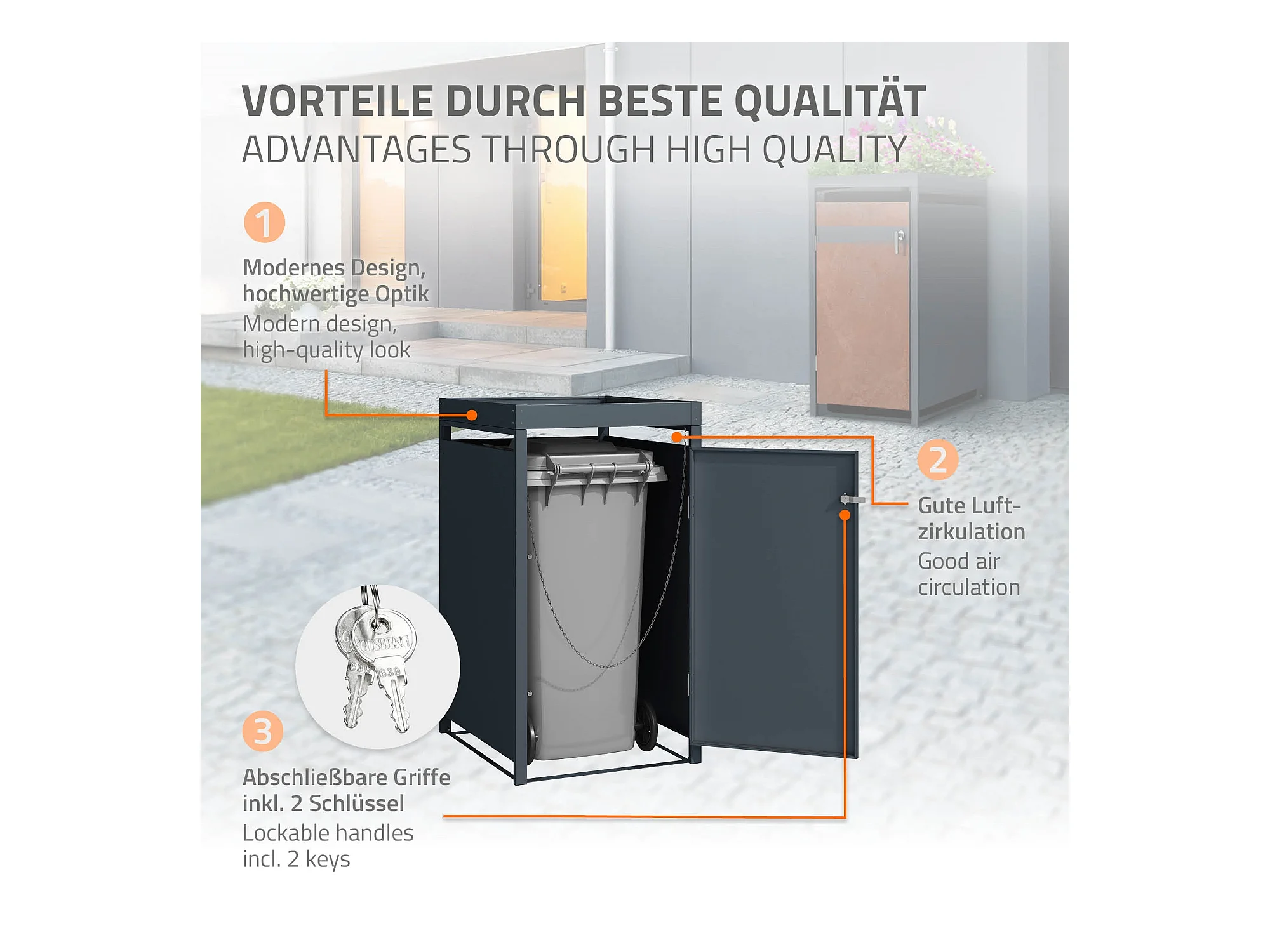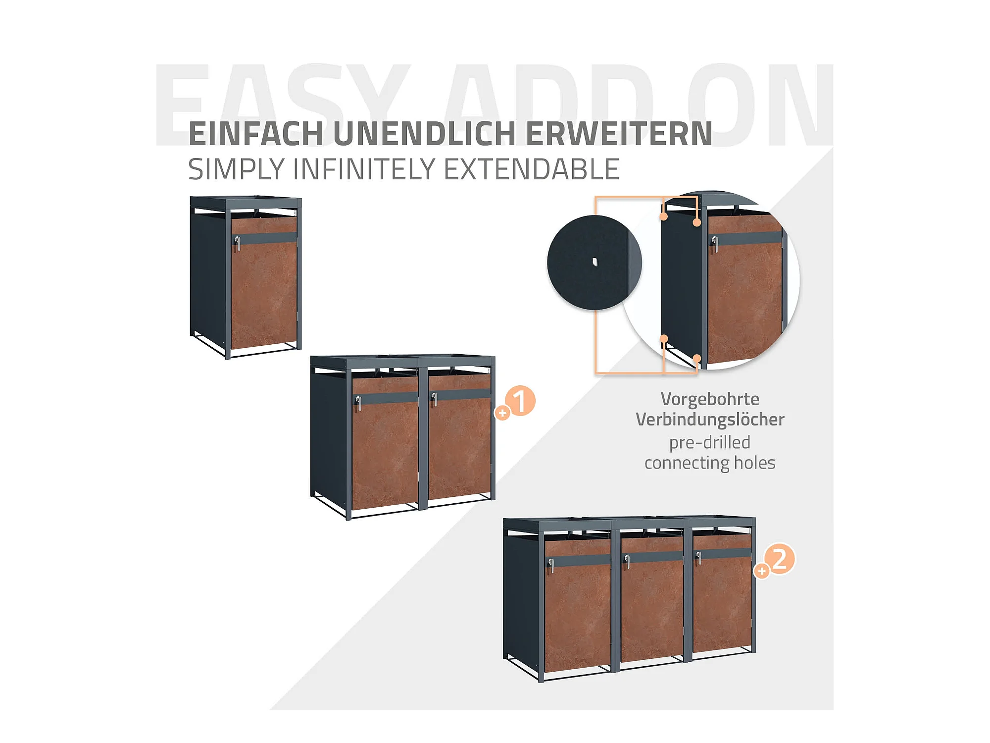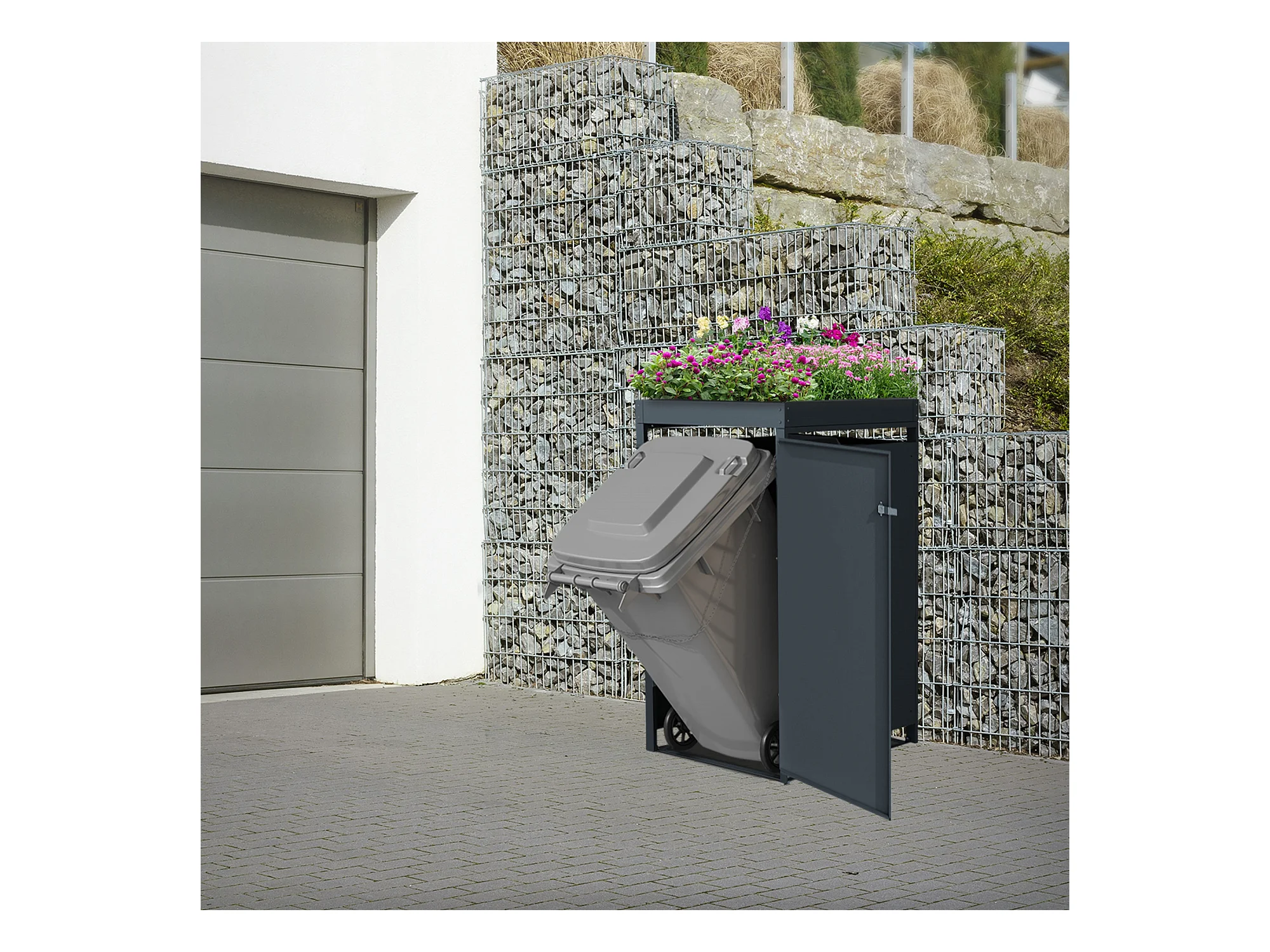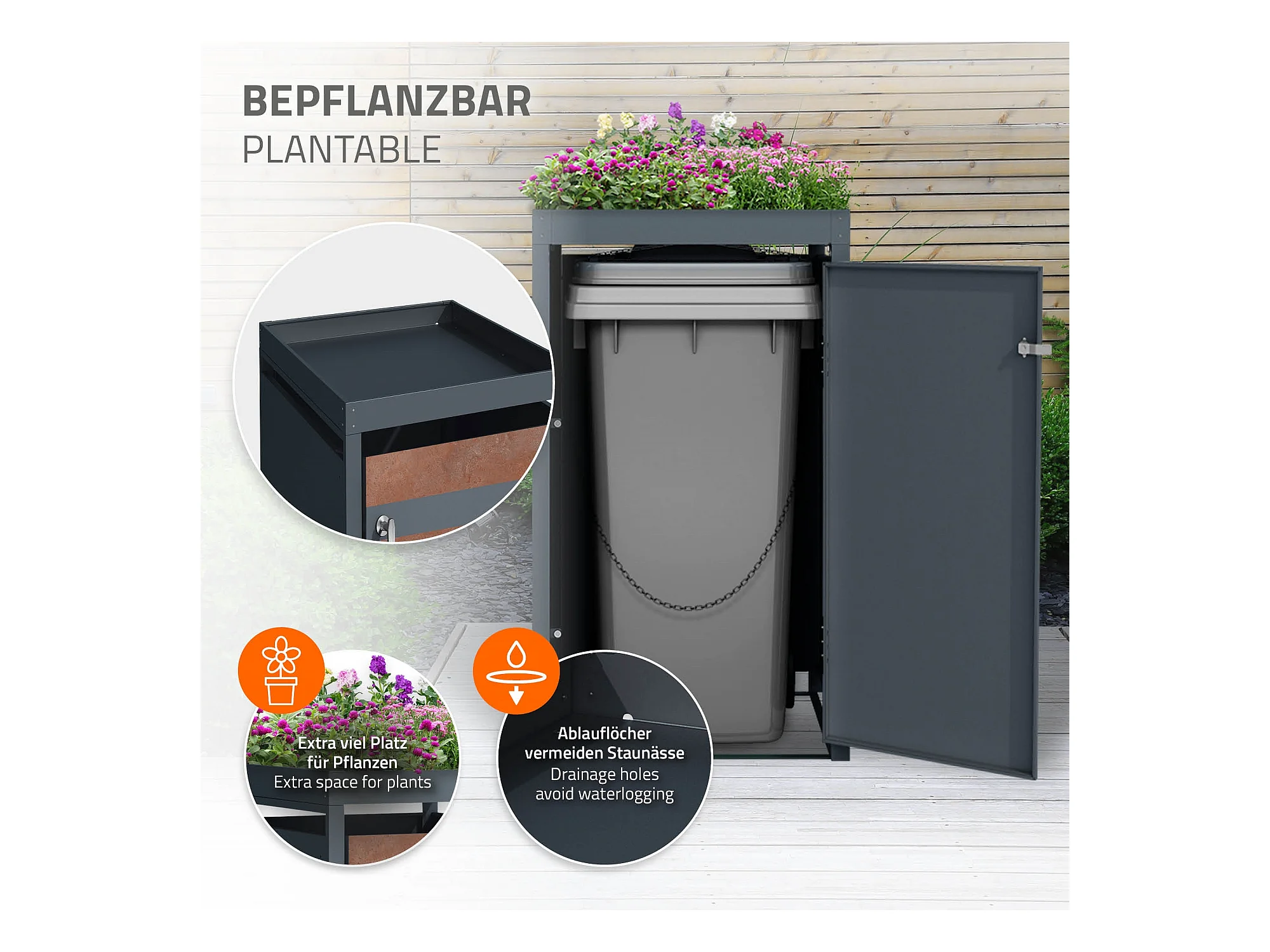 Abri pour 1 poubelle 68x80x124 cm capacité de 60L à 240L anthracite/aspect rouille en acier avec toit pour plantes et porte résistant aux intempéries
