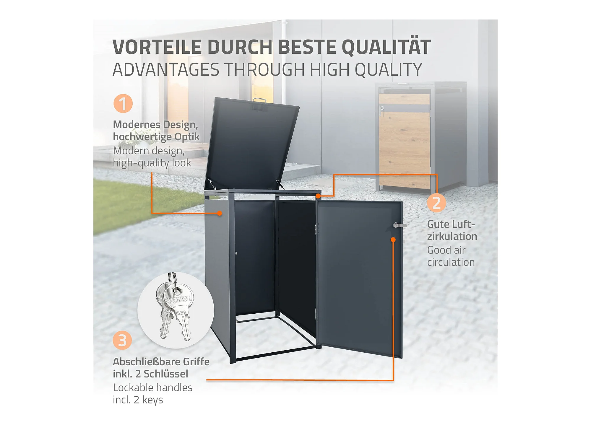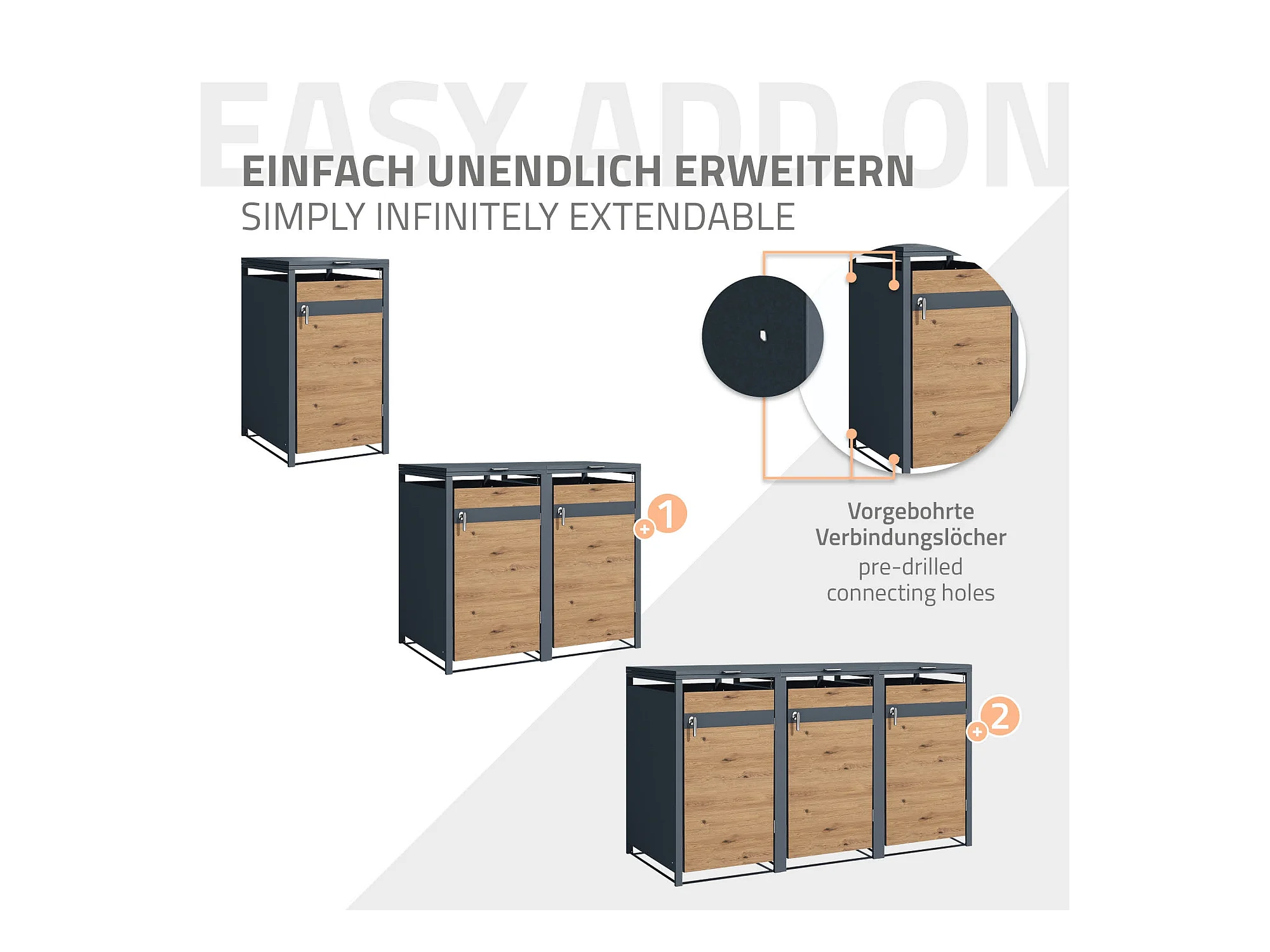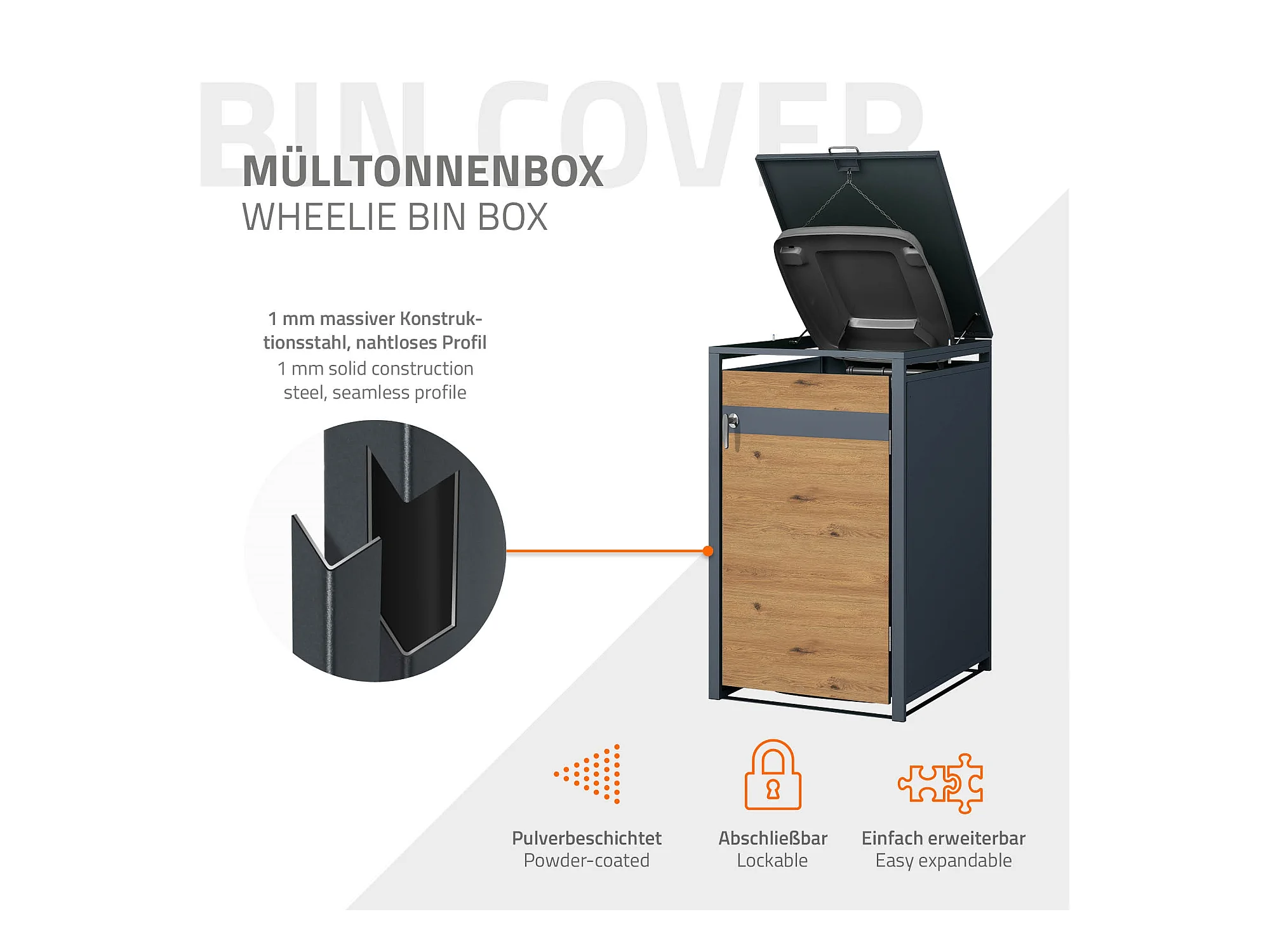 Abri pour 1 poubelle 68x80x116,3 cm capacité de 60L à 240L anthracite/aspect chêne acier avec couvercle rabattable/1 porte résistant aux intempéries