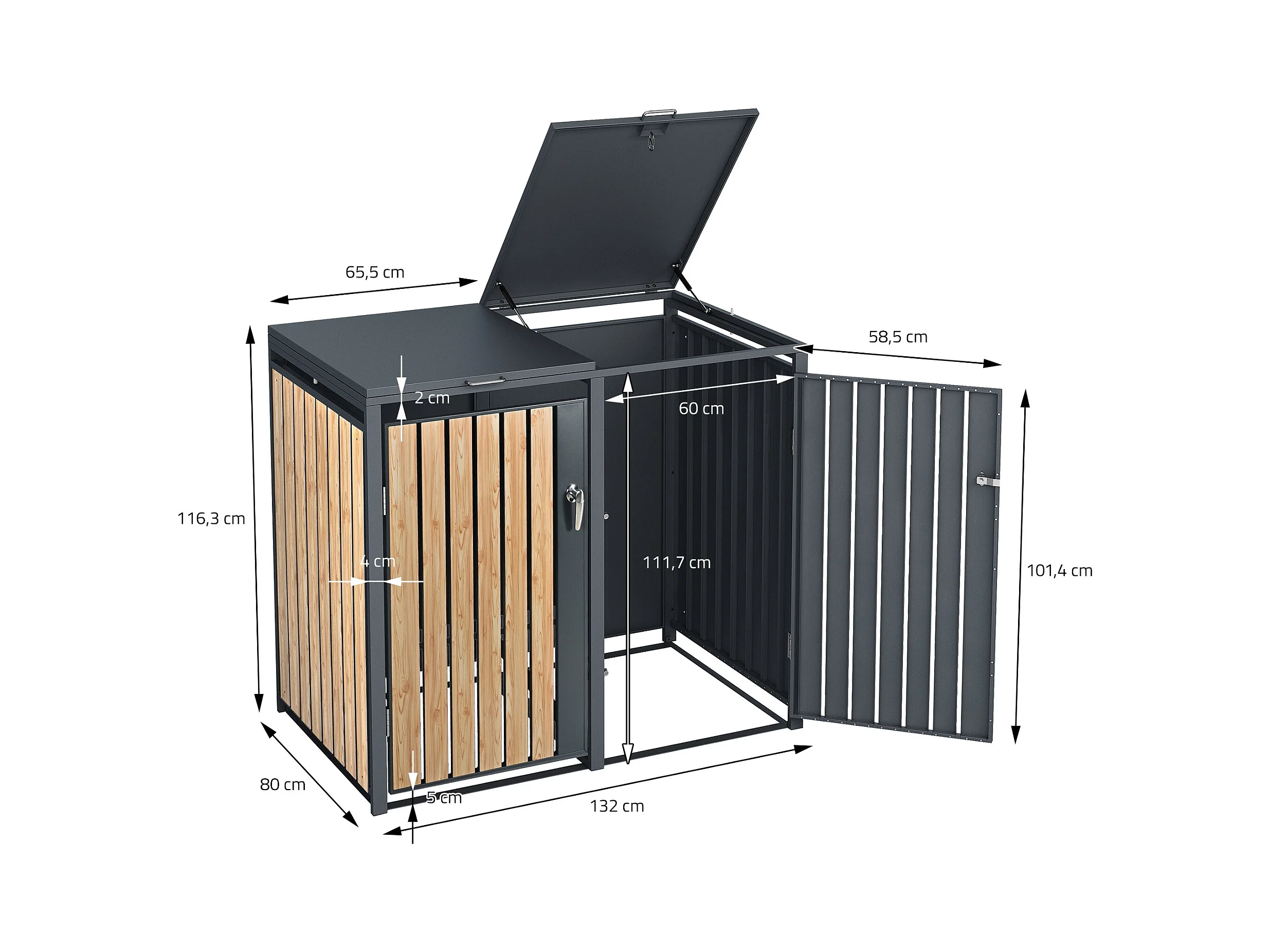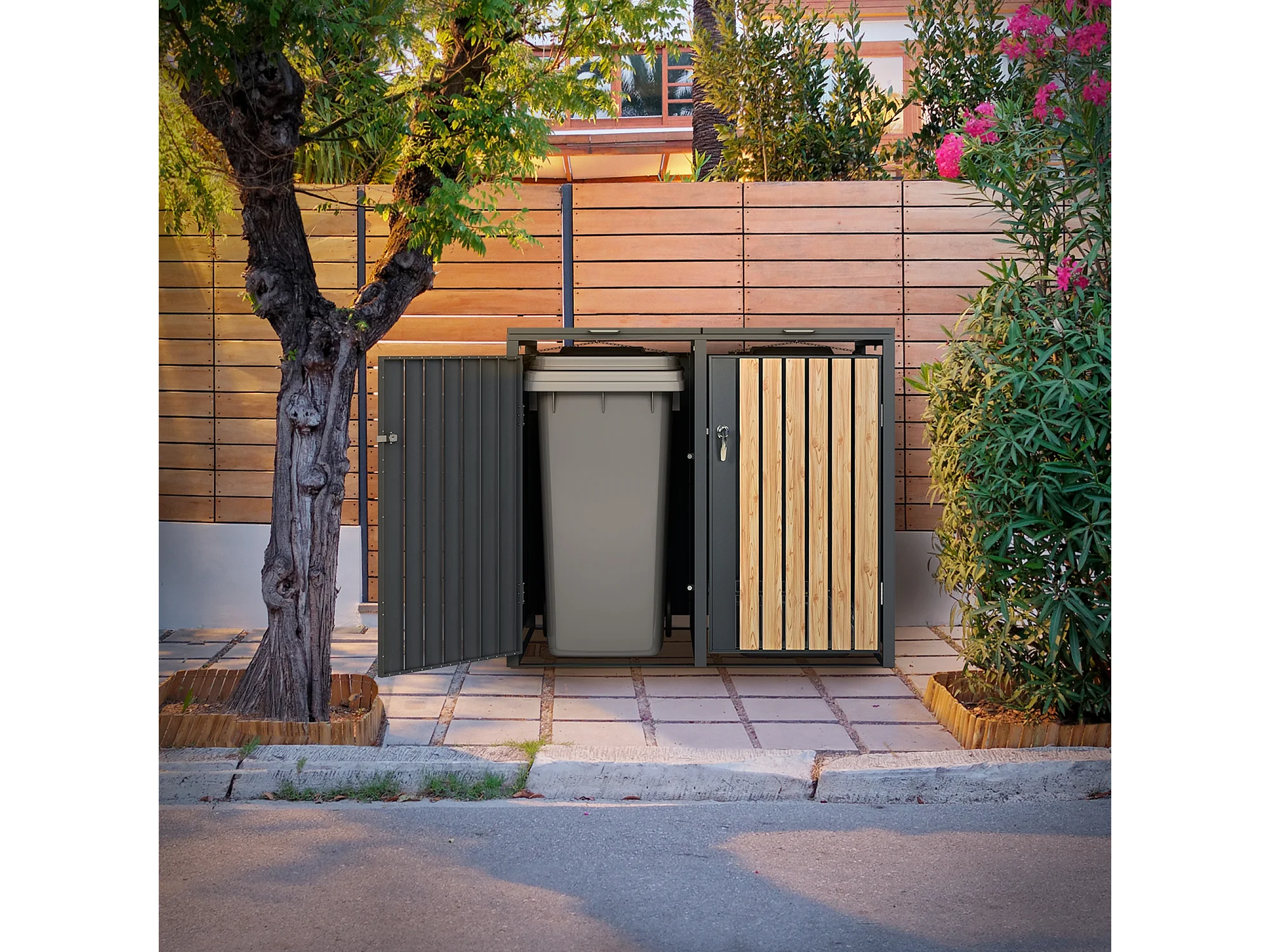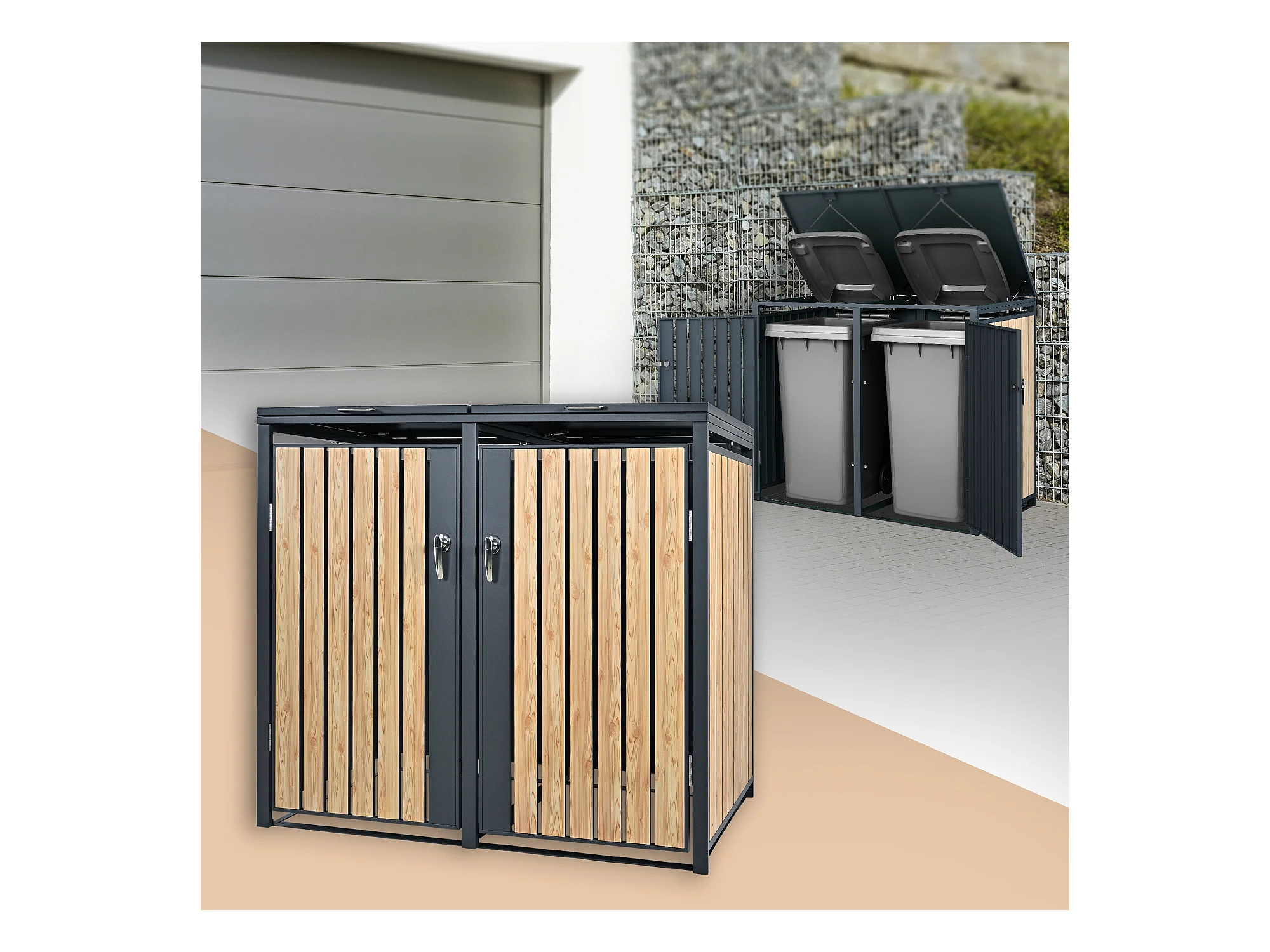 Abri pour 2 poubelles 132x80x116,3 cm capacité de 60L à 240L anthracite/aspect mélèze acier couvercle rabattable/2 portes résistant aux intempéries