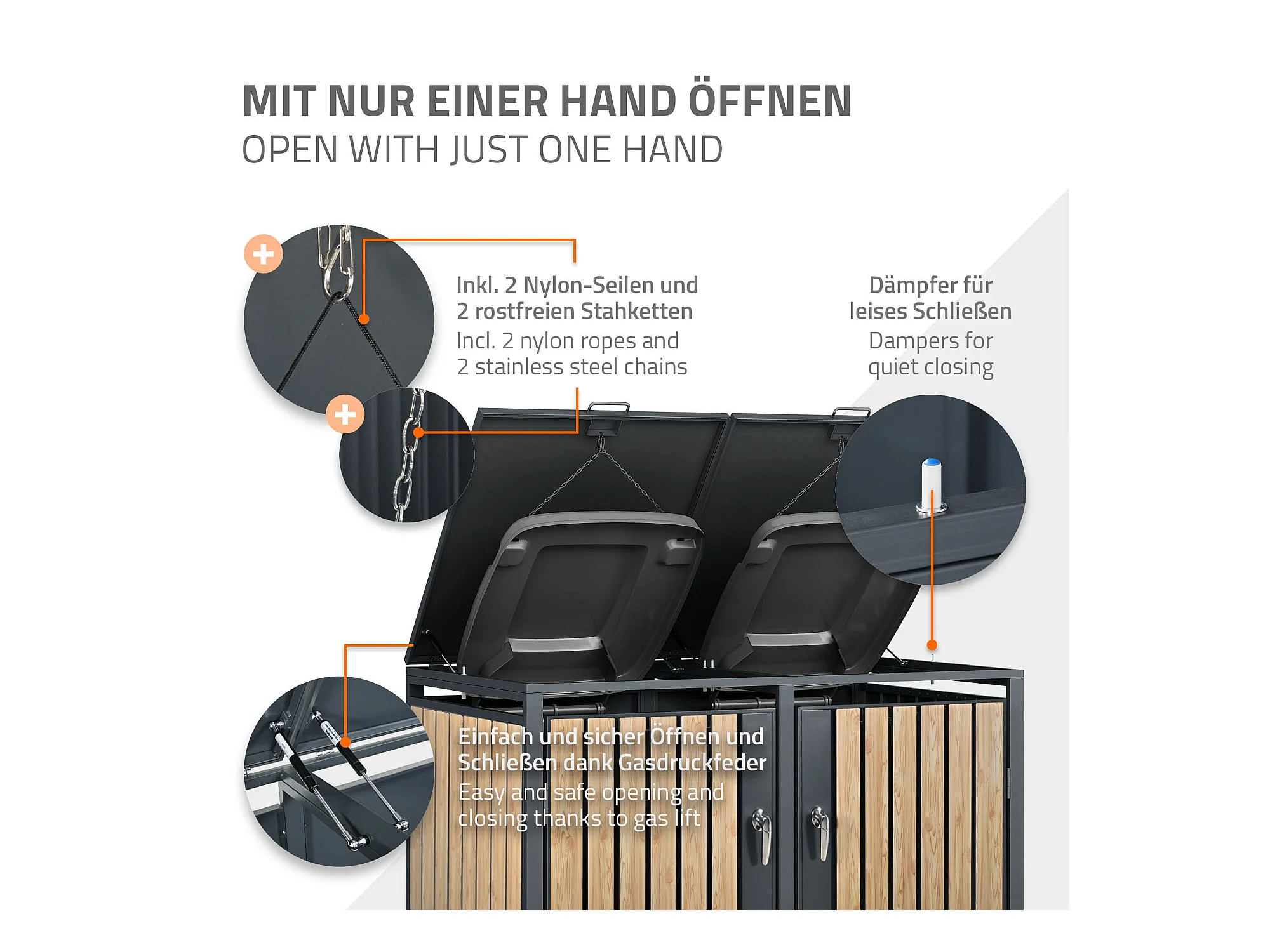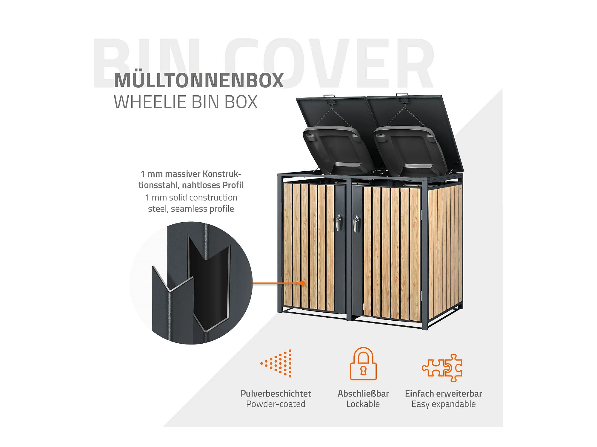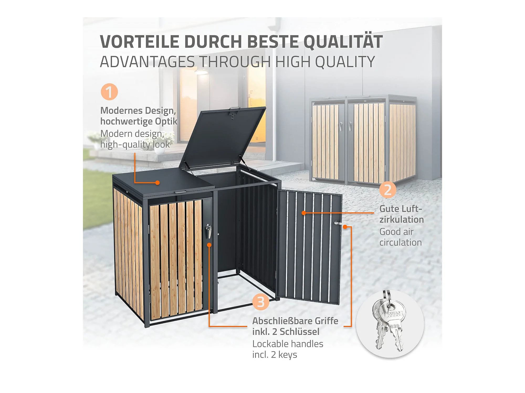 Abri pour 2 poubelles 132x80x116,3 cm capacité de 60L à 240L anthracite/aspect mélèze acier couvercle rabattable/2 portes résistant aux intempéries