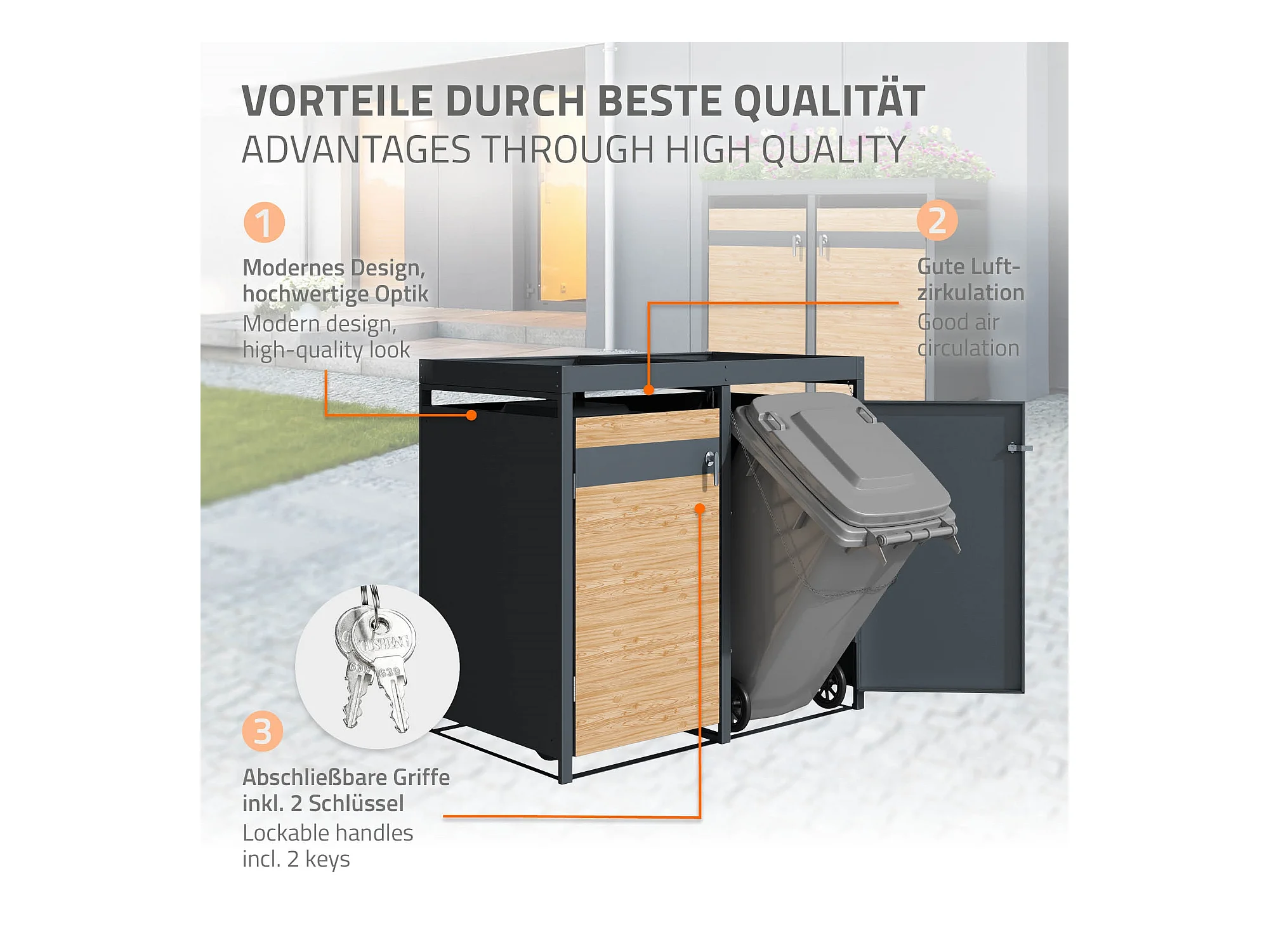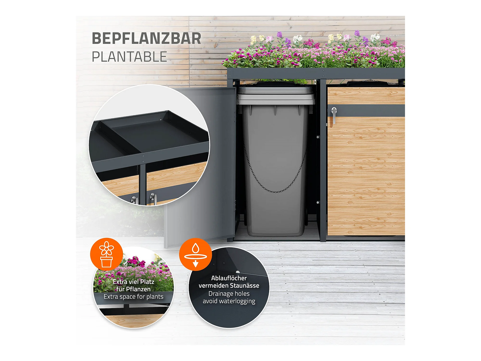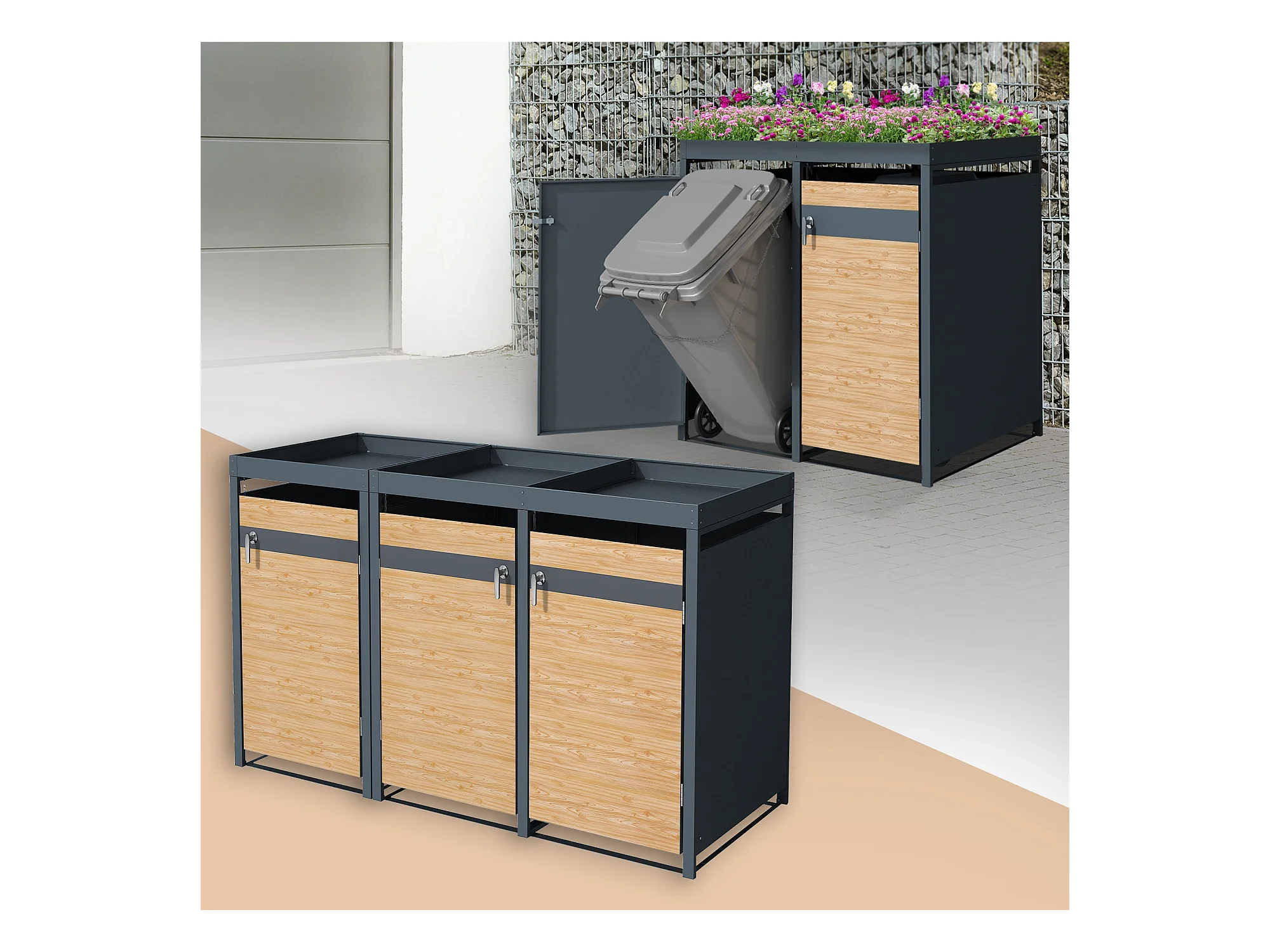 Abri pour 3 poubelles 200x80x124 cm capacité de 60L à 240L anthracite/aspect mélèze en acier avec toit pour plantes/3 portes résistant aux intempéries