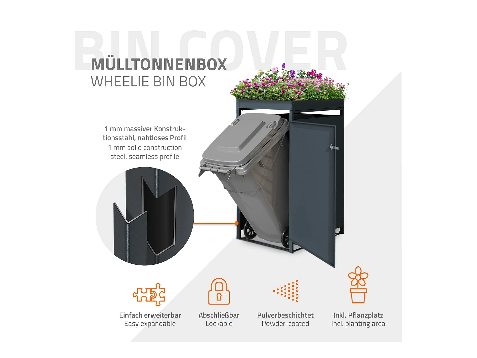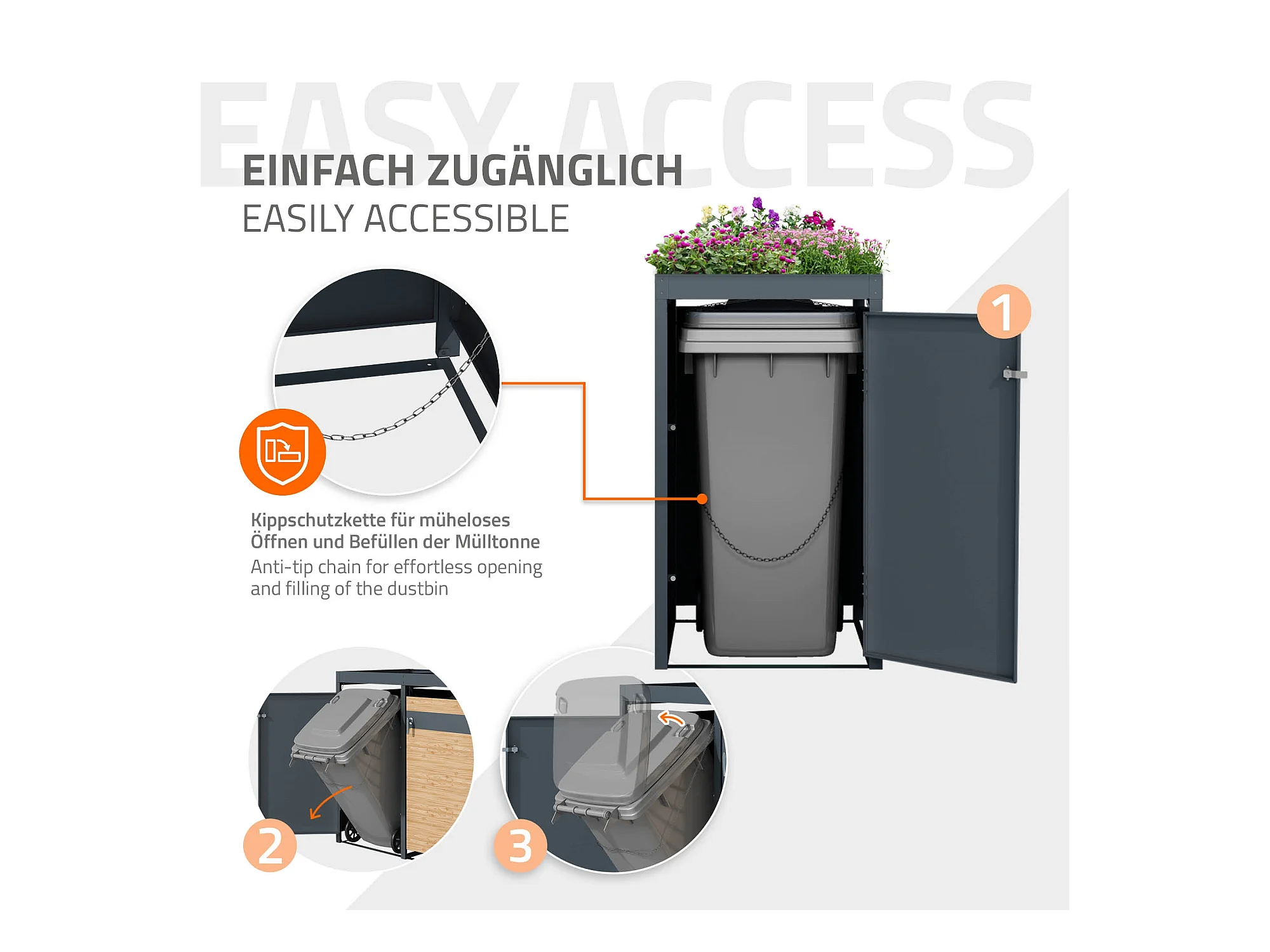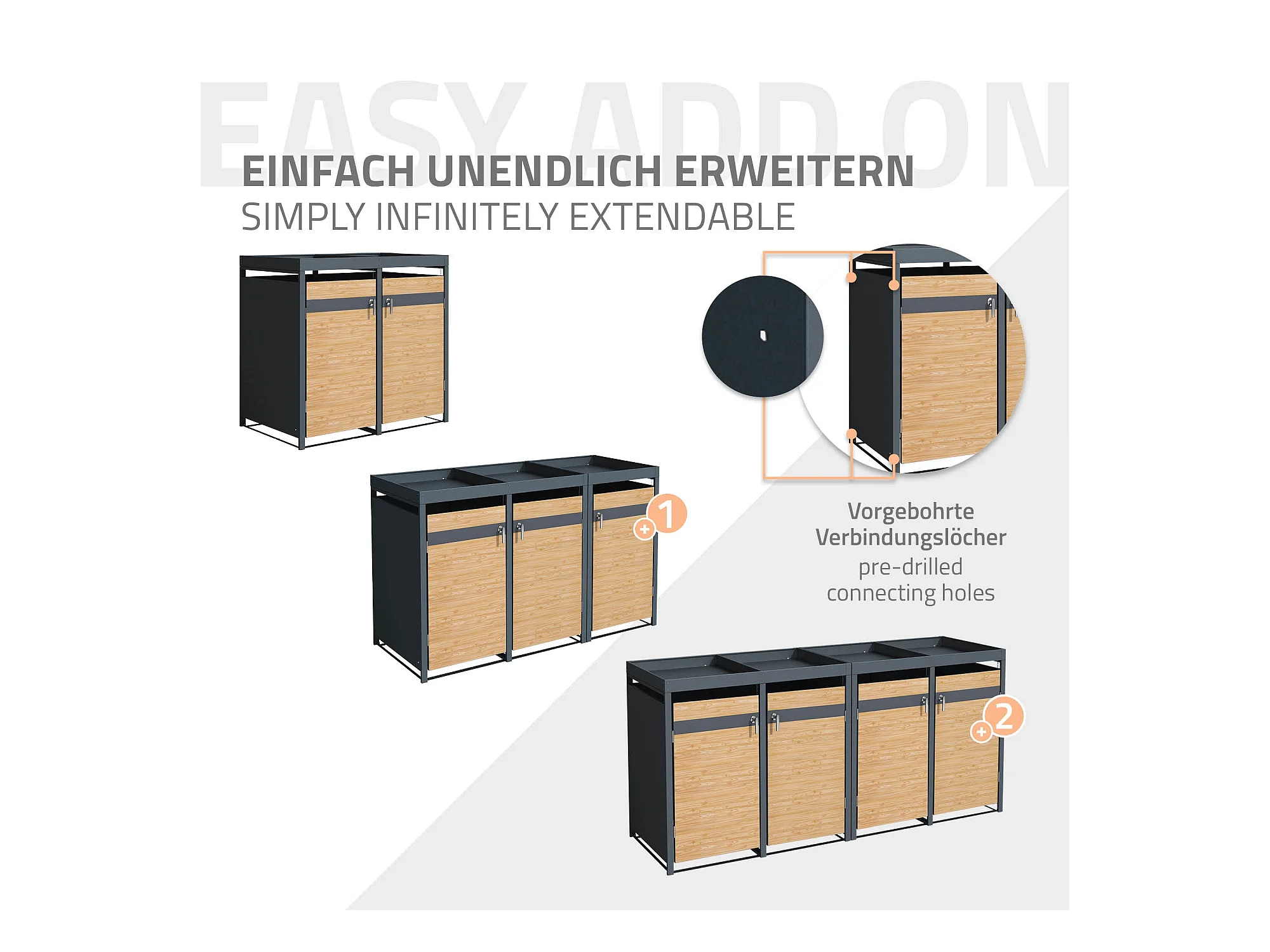 Abri pour 3 poubelles 200x80x124 cm capacité de 60L à 240L anthracite/aspect mélèze en acier avec toit pour plantes/3 portes résistant aux intempéries