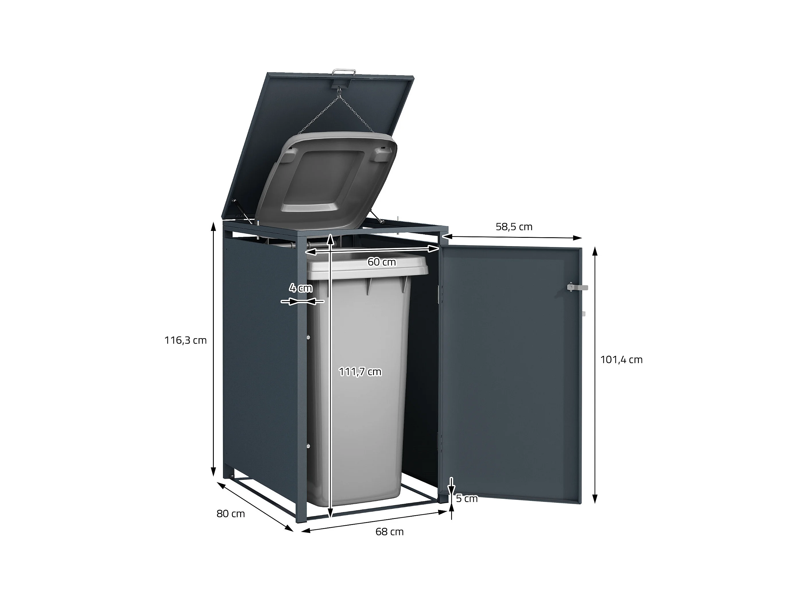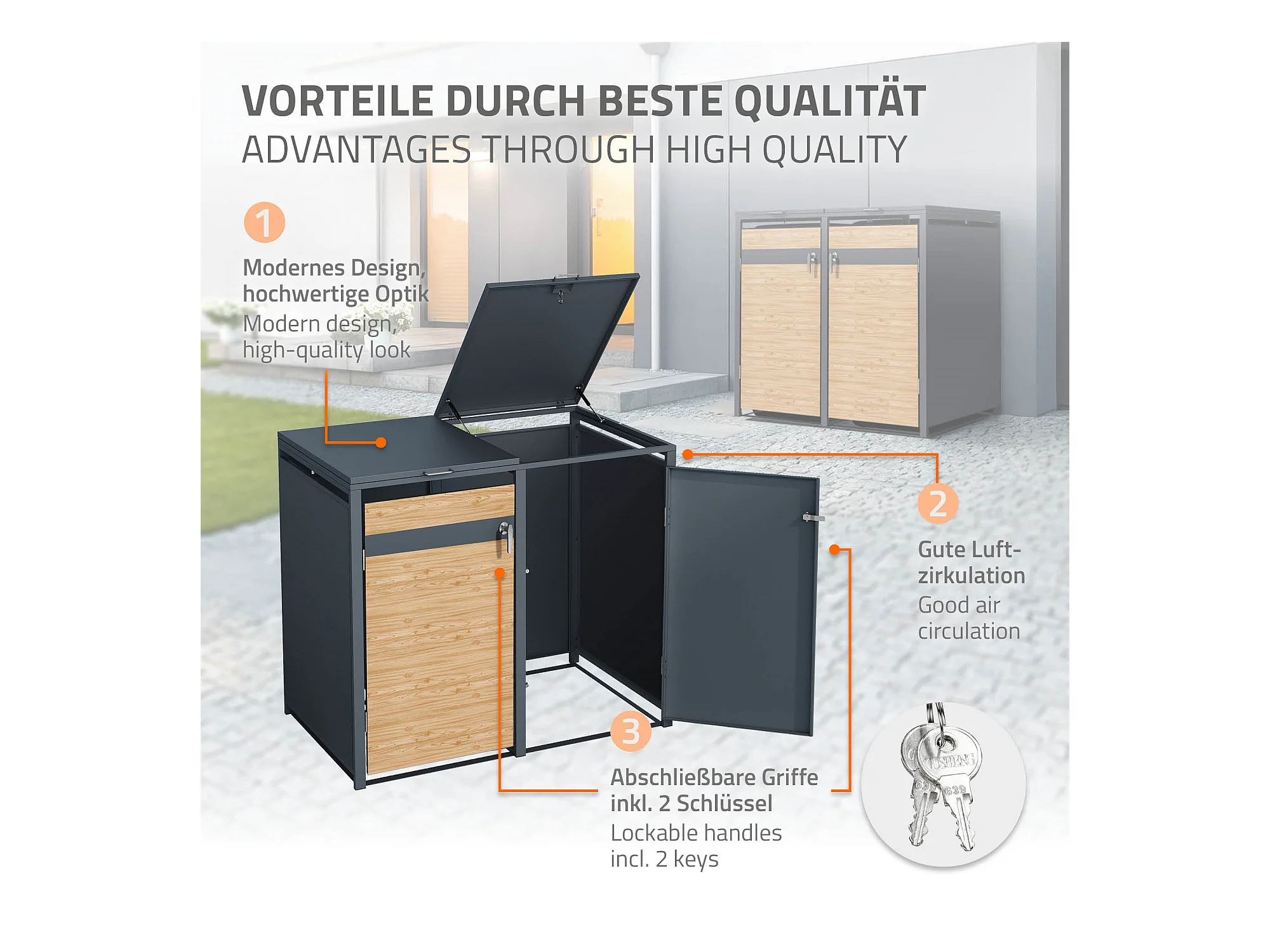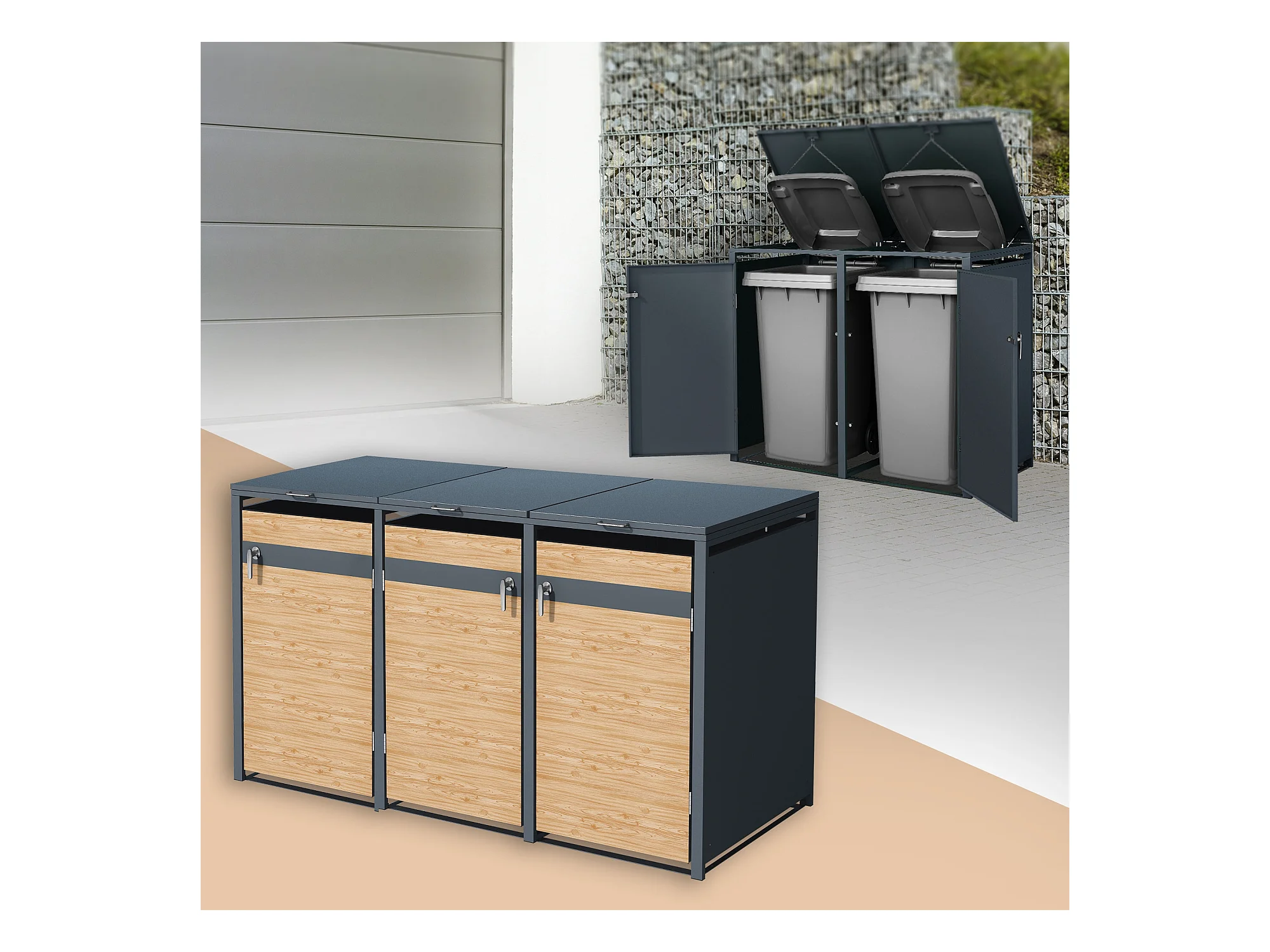 Abri pour 3 poubelles 200x80x116,3 cm capacité de 60L à 240L anthracite/aspect mélèze acier couvercle rabattable/3 portes résistant aux intempéries