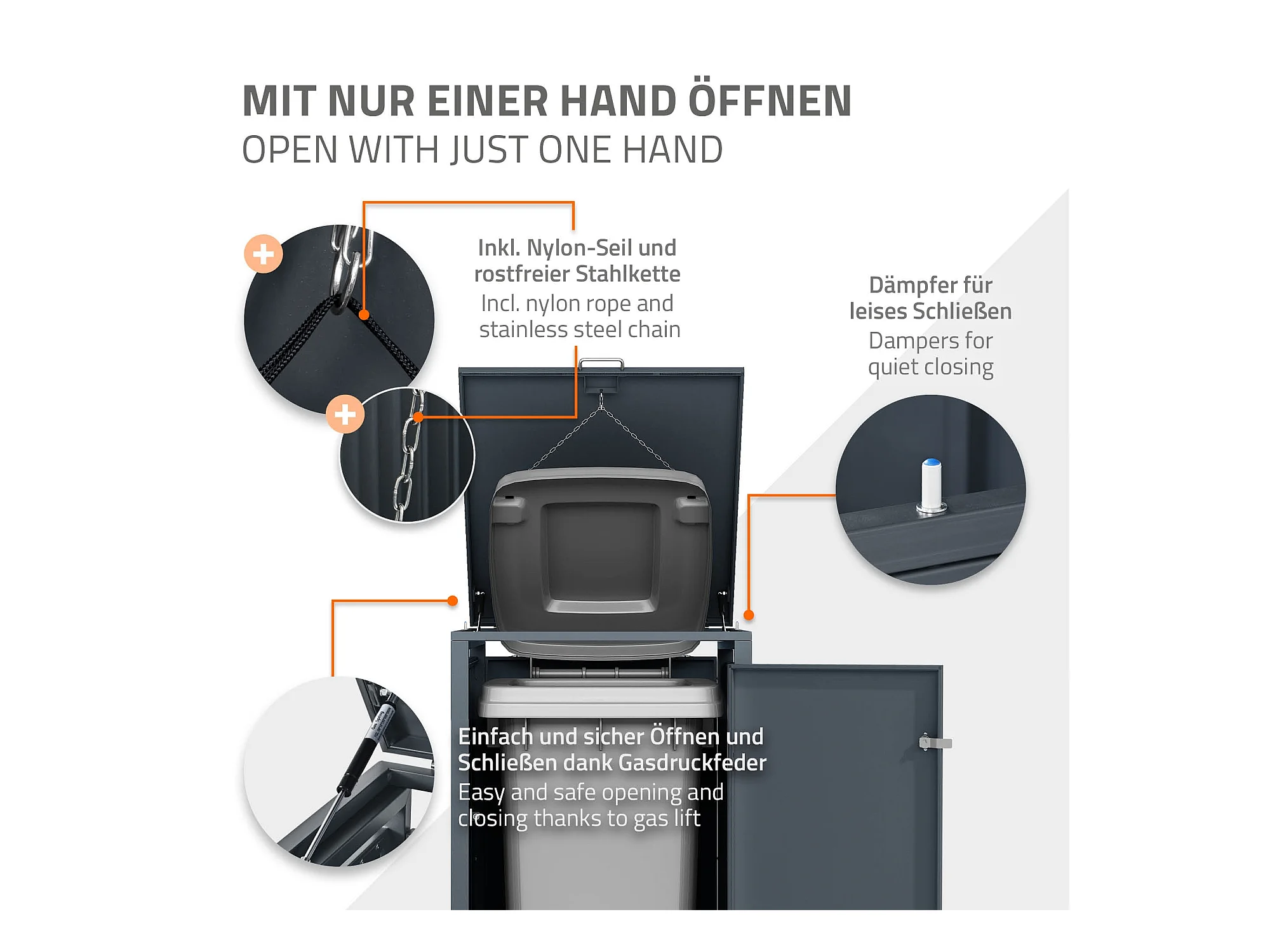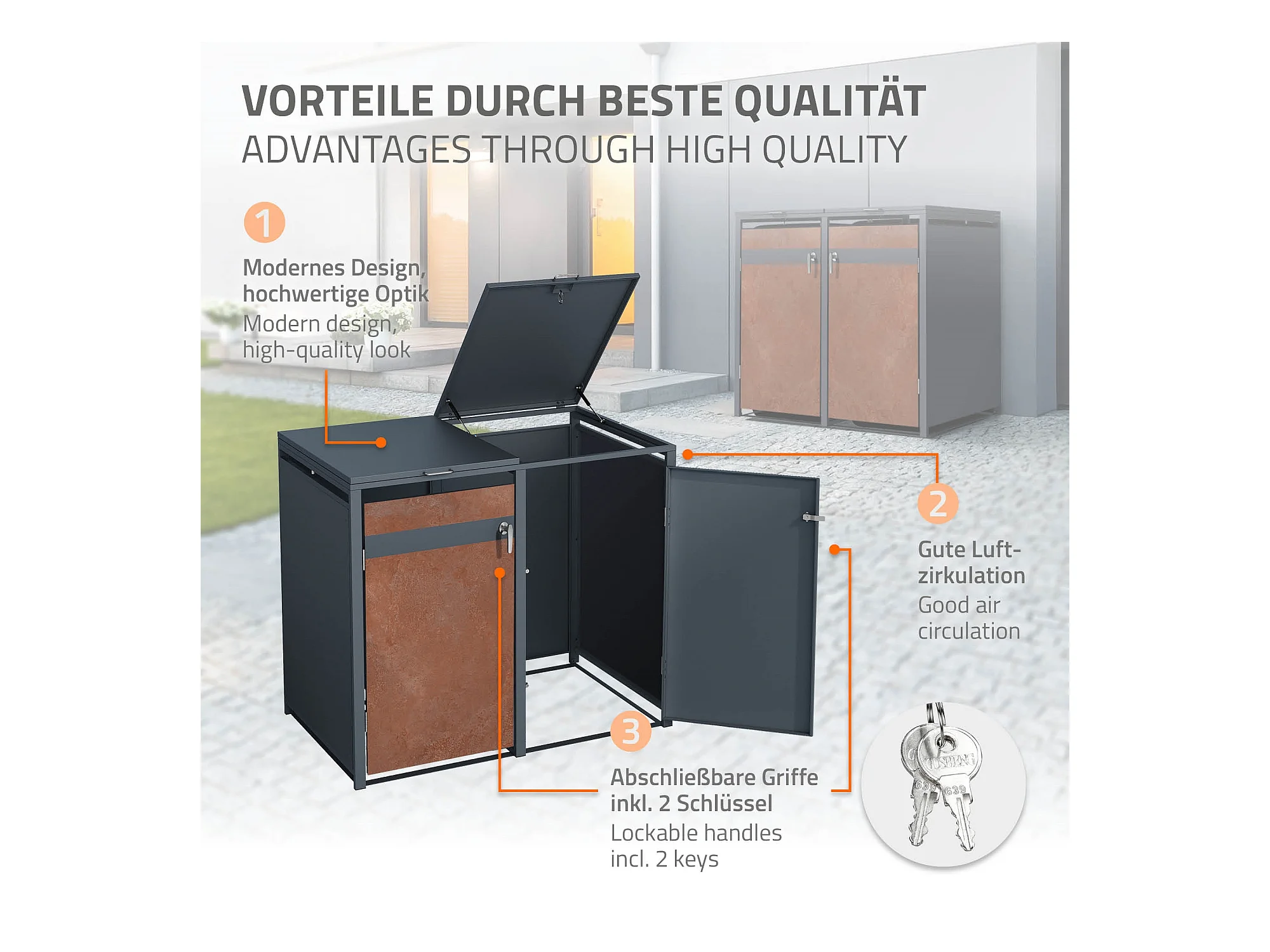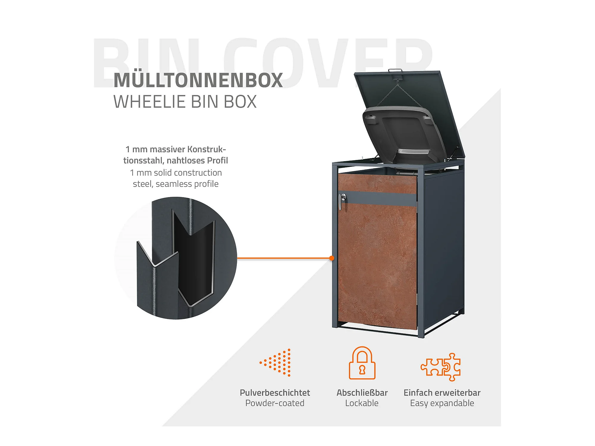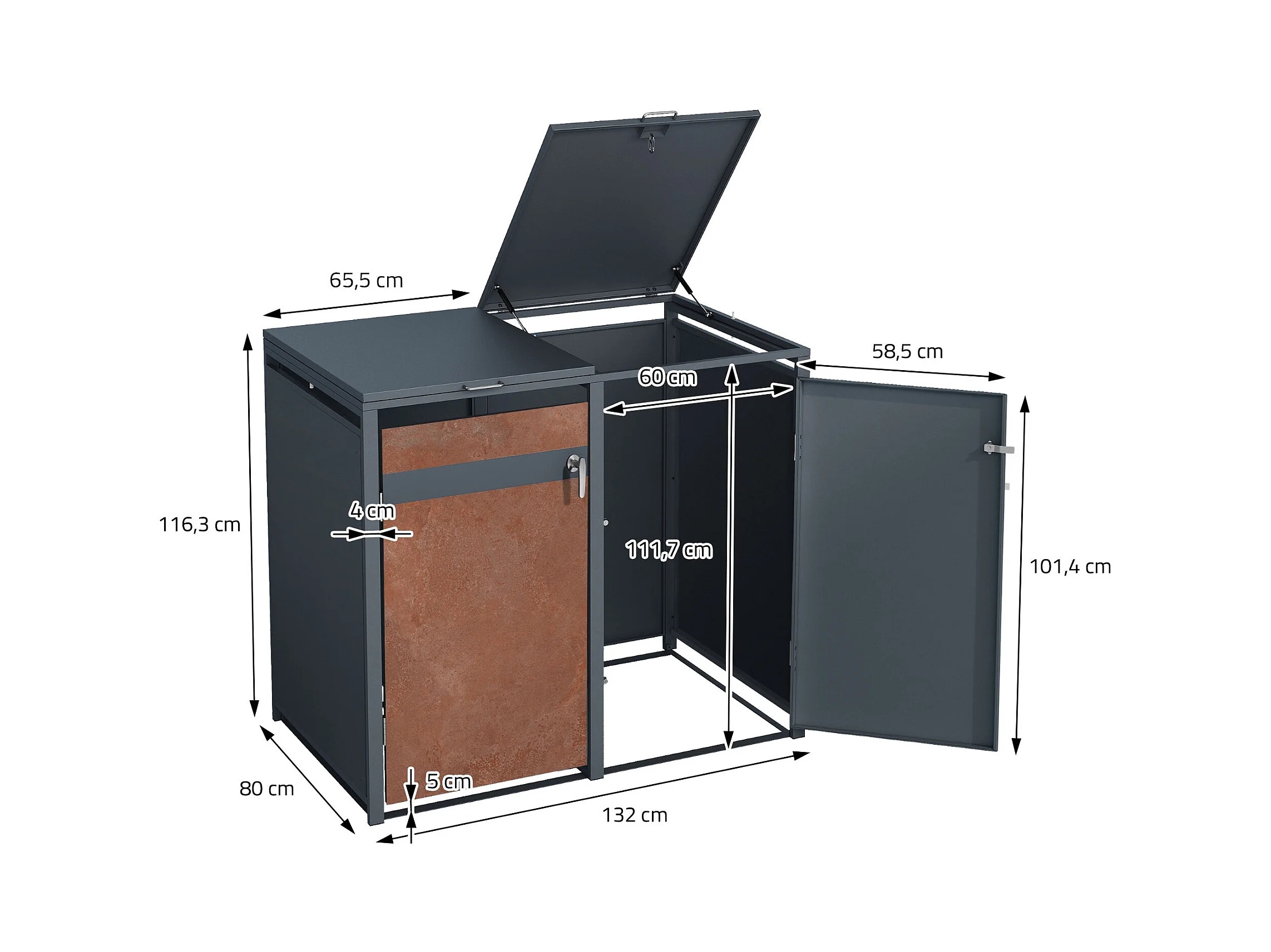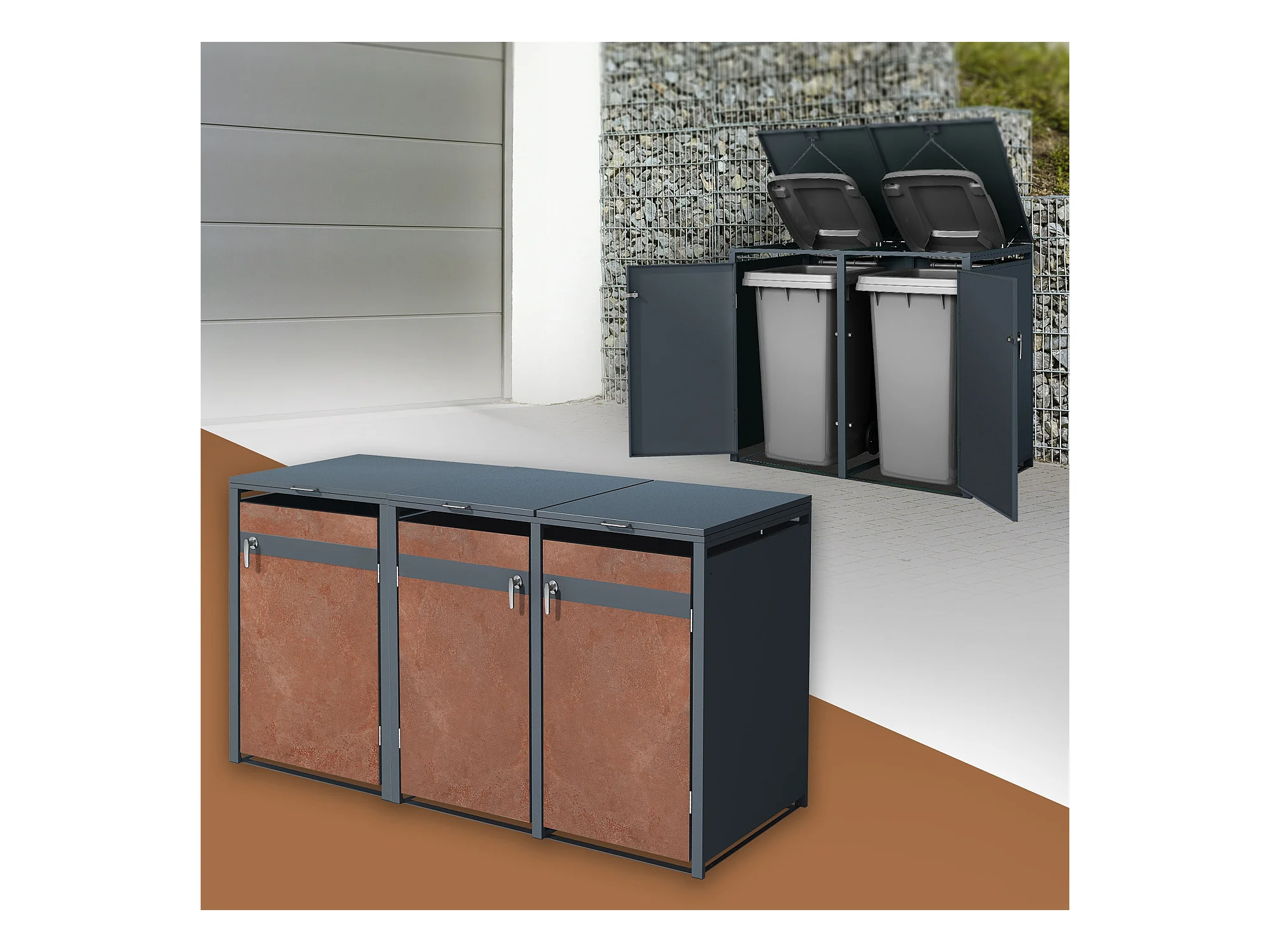 Abri pour 3 poubelles 200x80x116,3 cm capacité de 60L à 240L anthracite/aspect rouillé acier couvercle rabattable/3 portes résistant aux intempéries