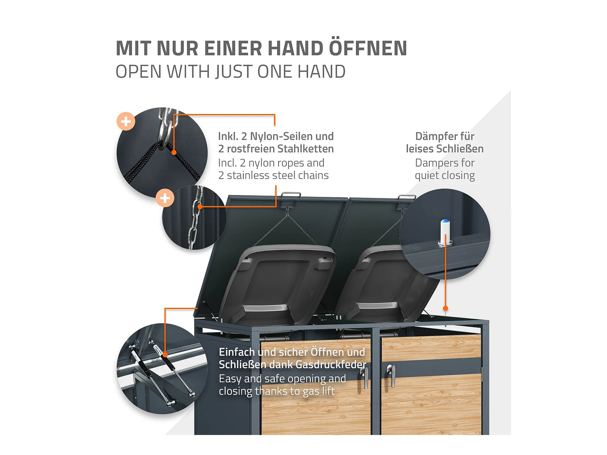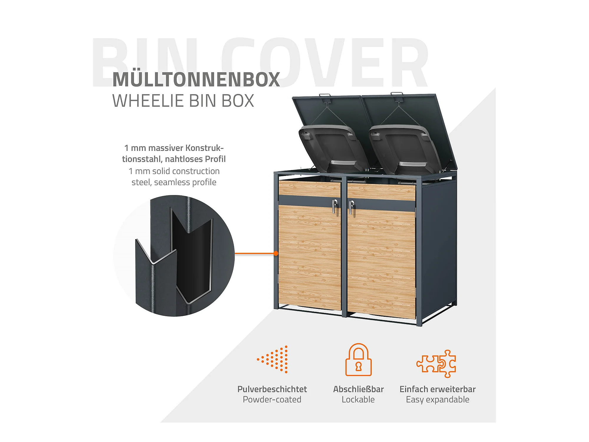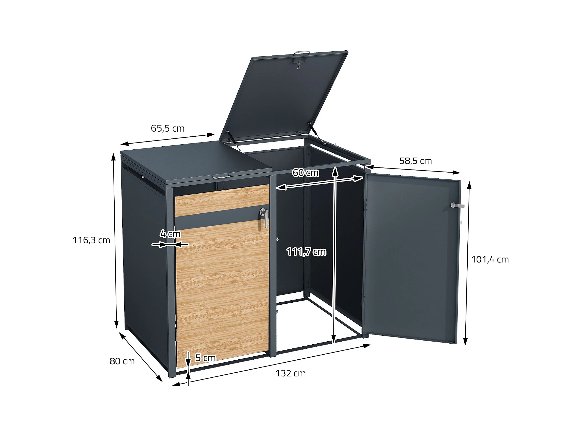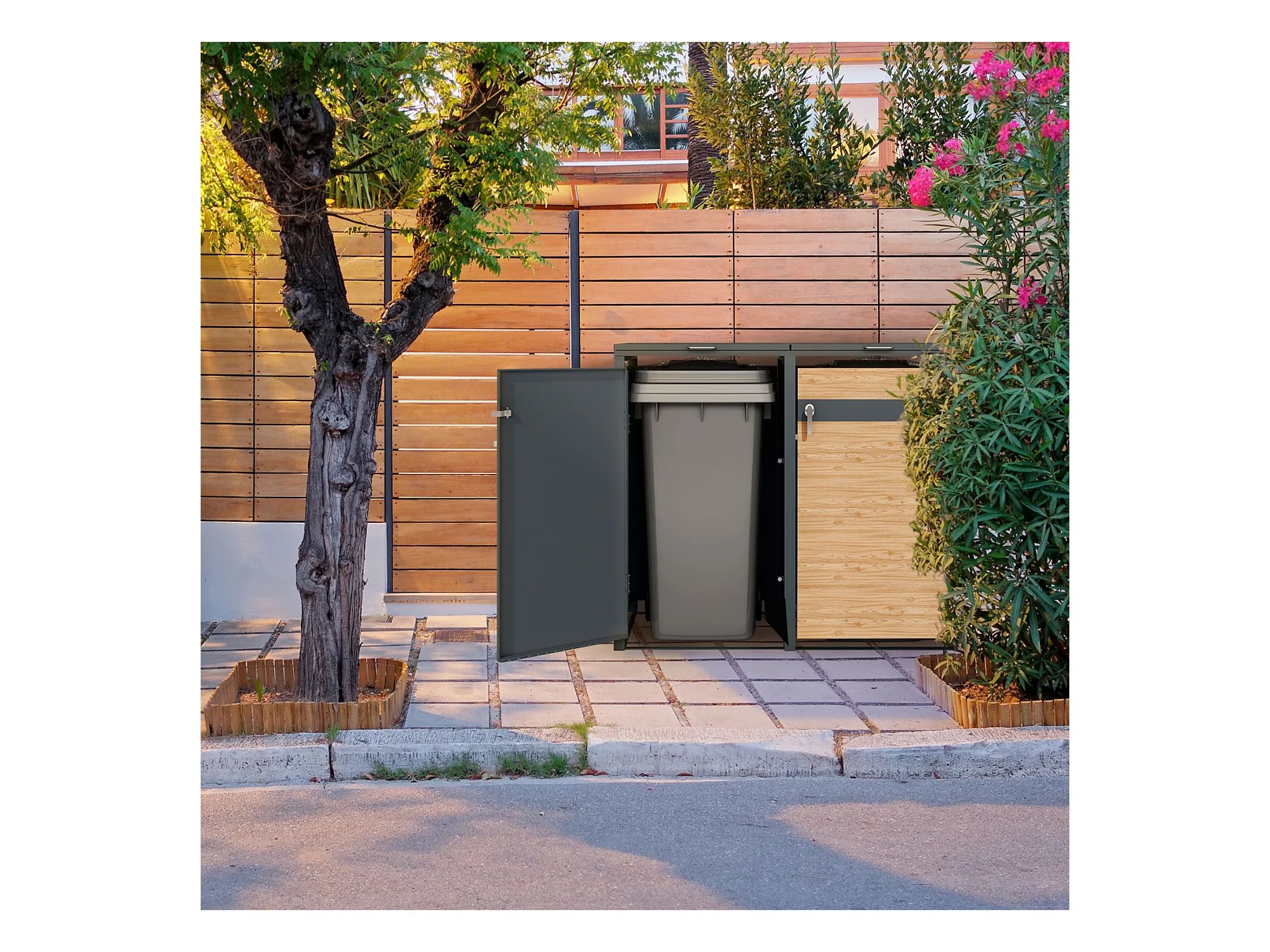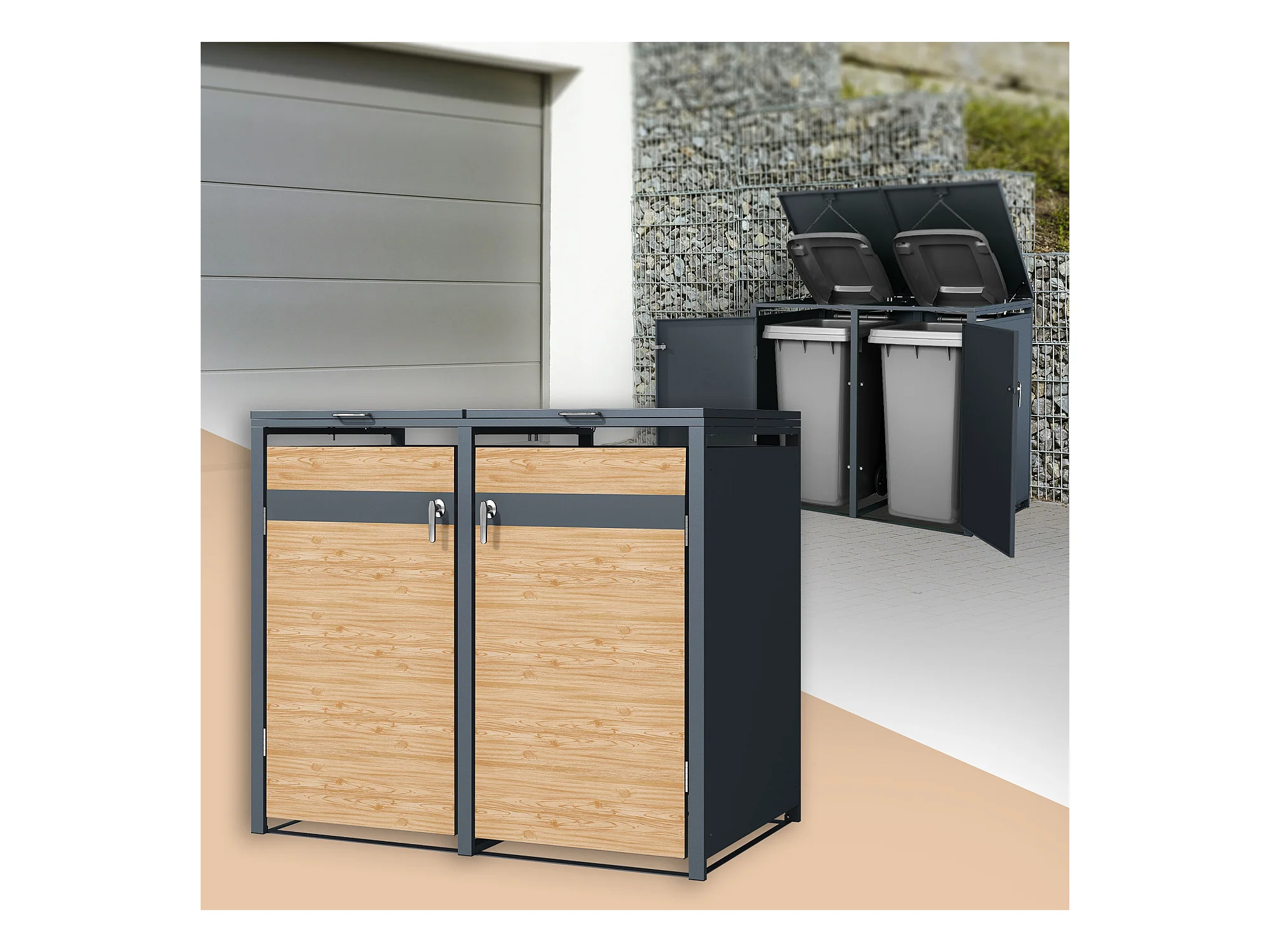 Abri pour 2 poubelles 132x80x116,3 cm capacité de 60L à 240L anthracite/aspect mélèze acier couvercle rabattable/2 portes résistant aux intempéries