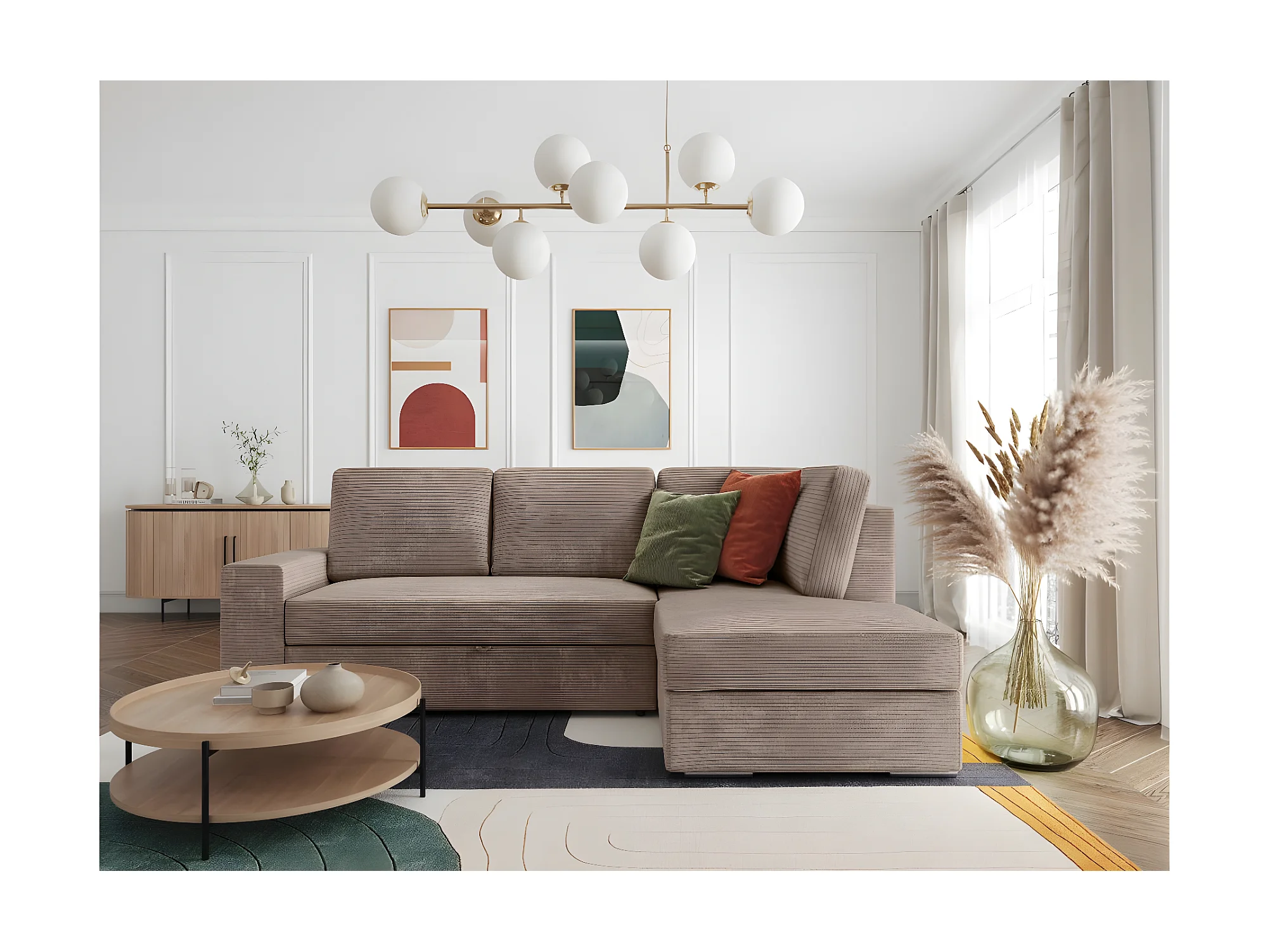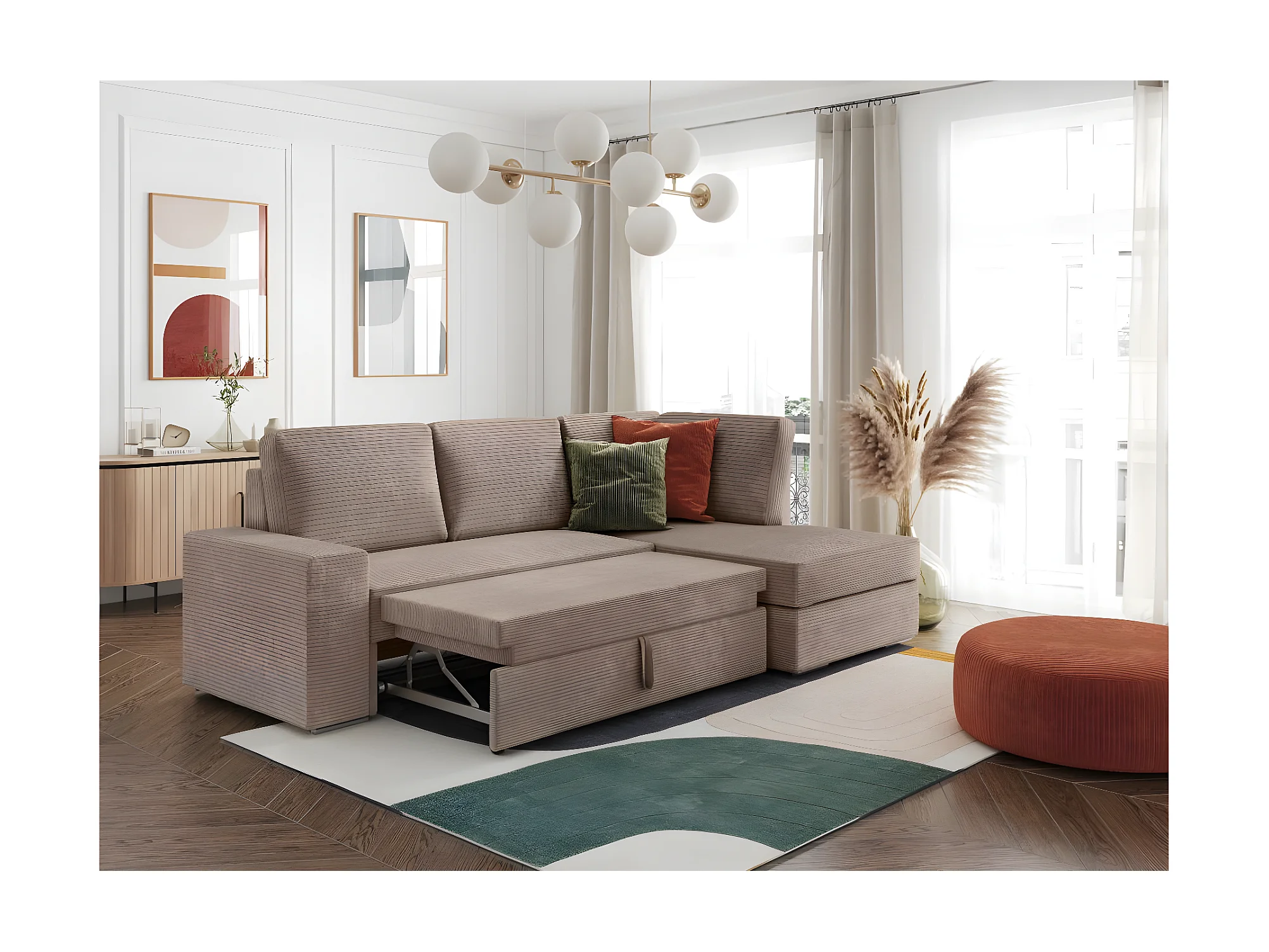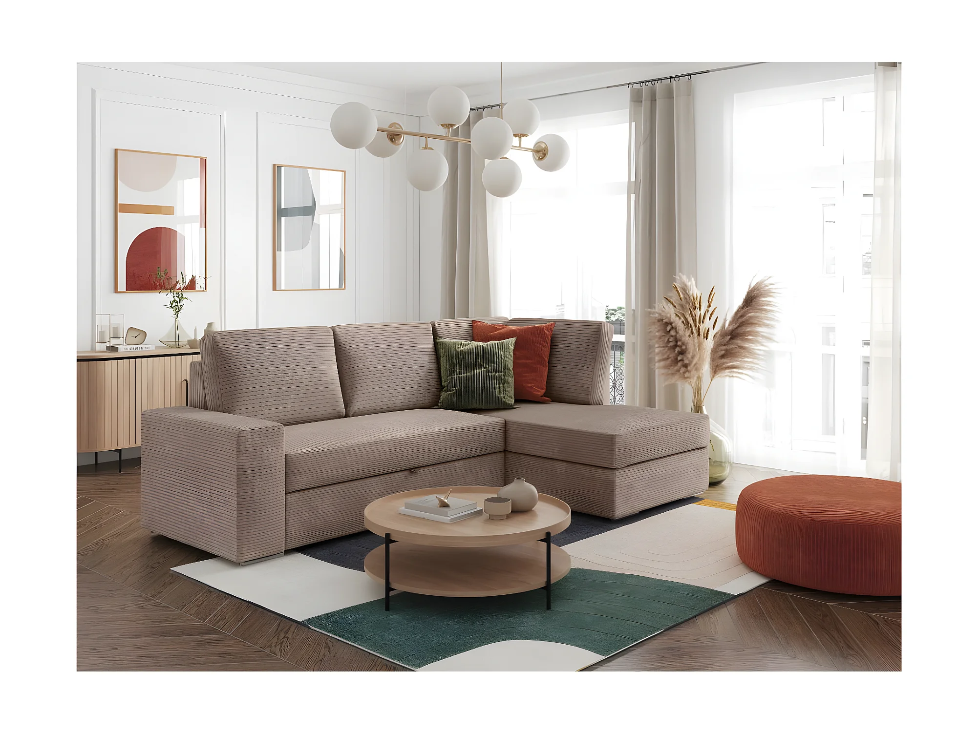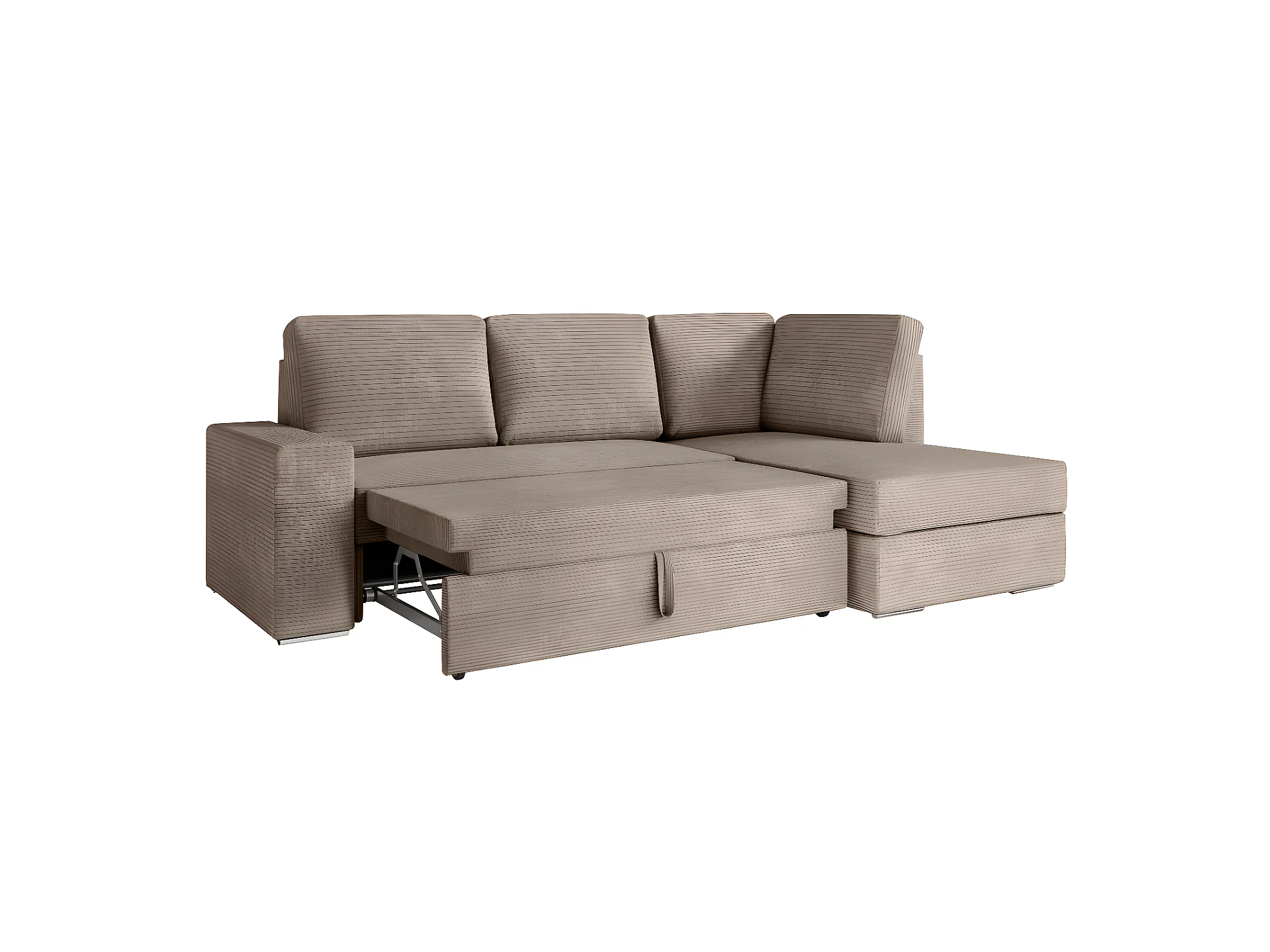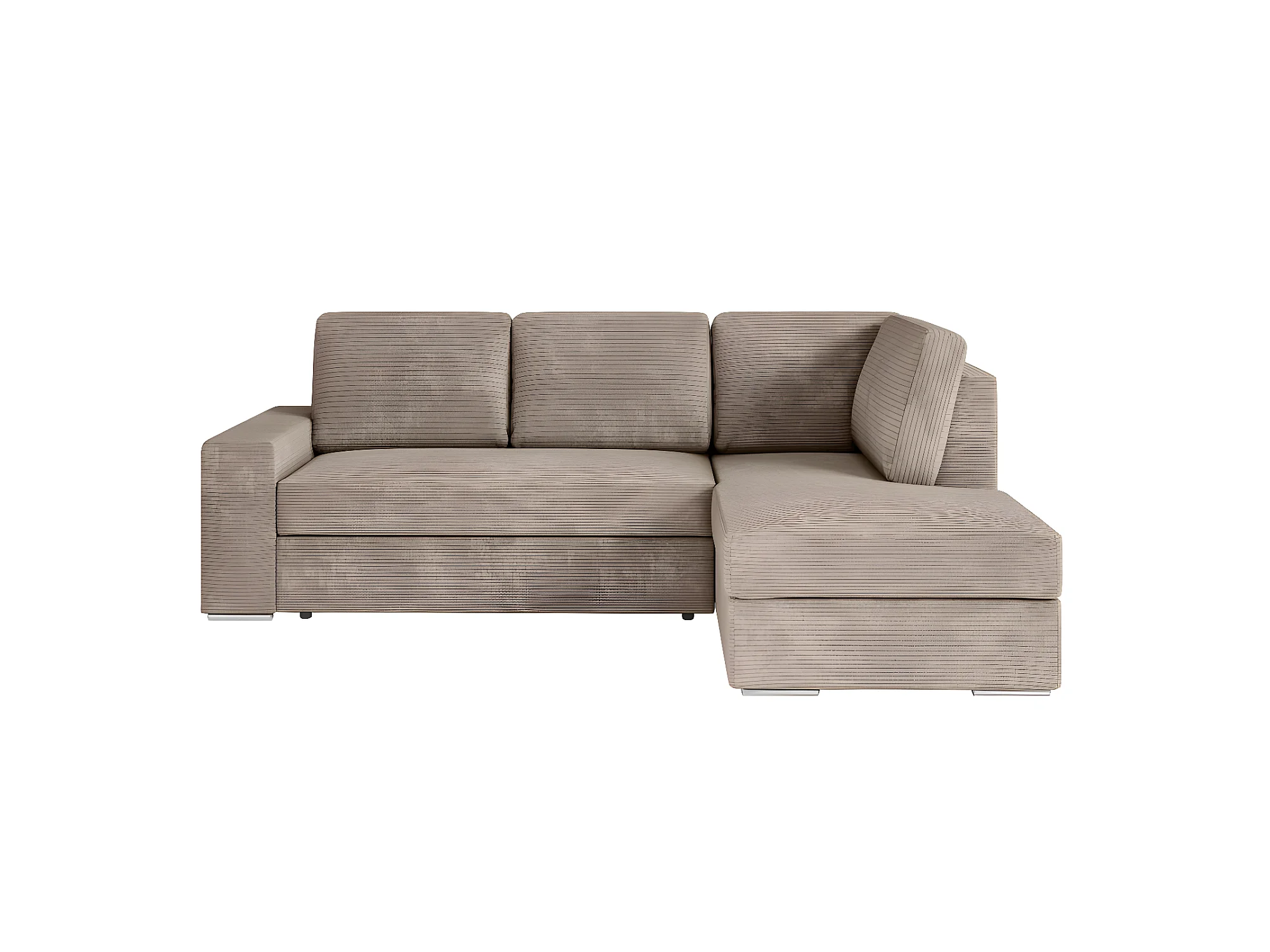 Canapé d'angle droit 3 places convertible Aden avec coffre en velours côtelé - Taupe - L246 x P174 x H96cm - Loungitude