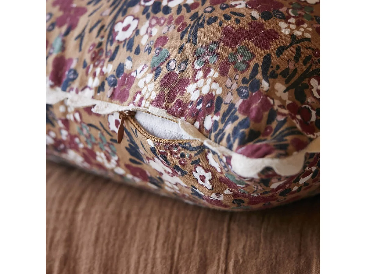Lot 2 coussins 40 x 40 cm en gaze de coton camel et fleuri - ISABELA 1