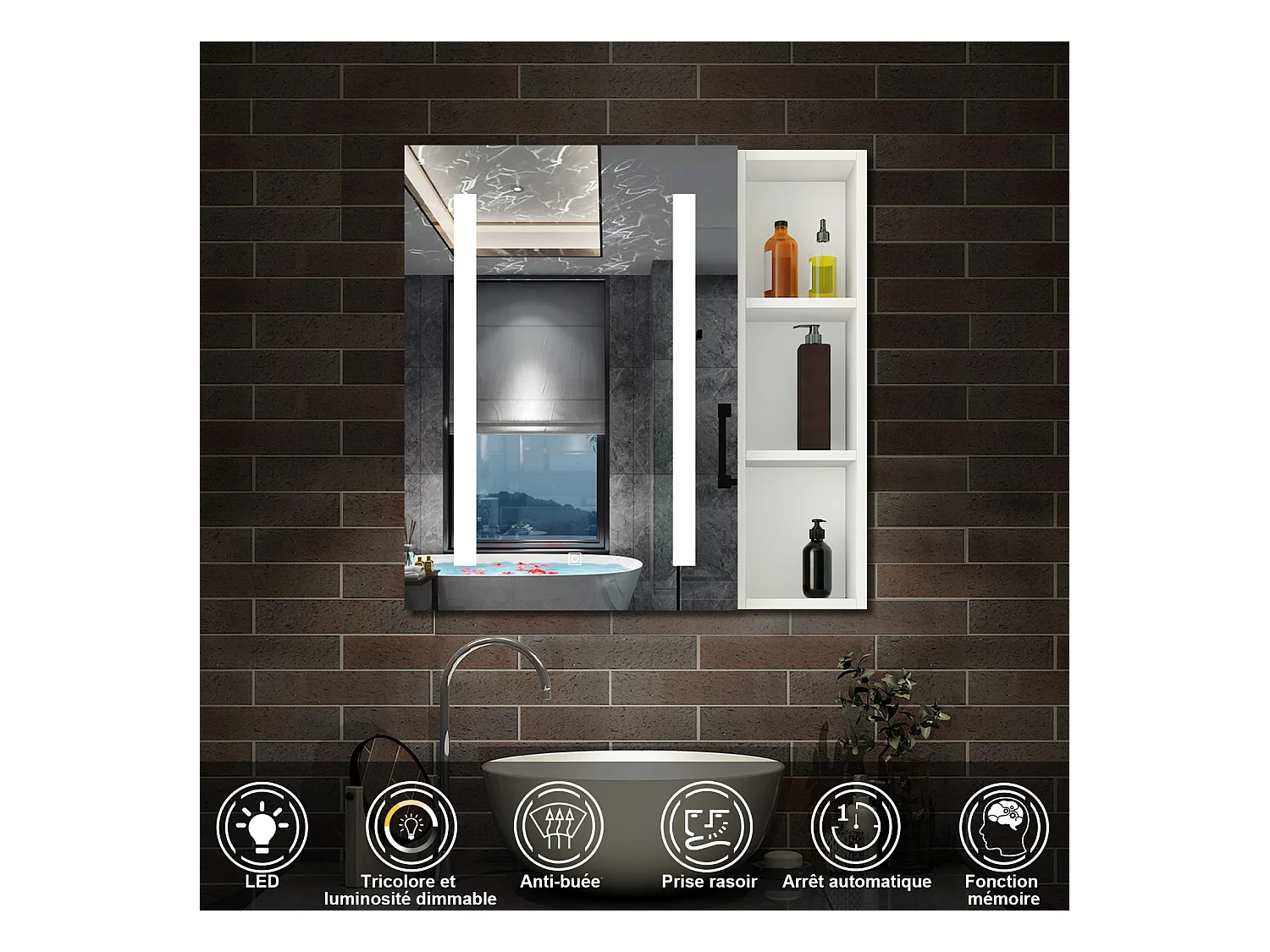 AICA Armoire murale de salle de bain LED, 70x40cm avec Prise Rasoir+Anti-Buée + Tricolore + Dimmable +armoire latérale, Blanc
