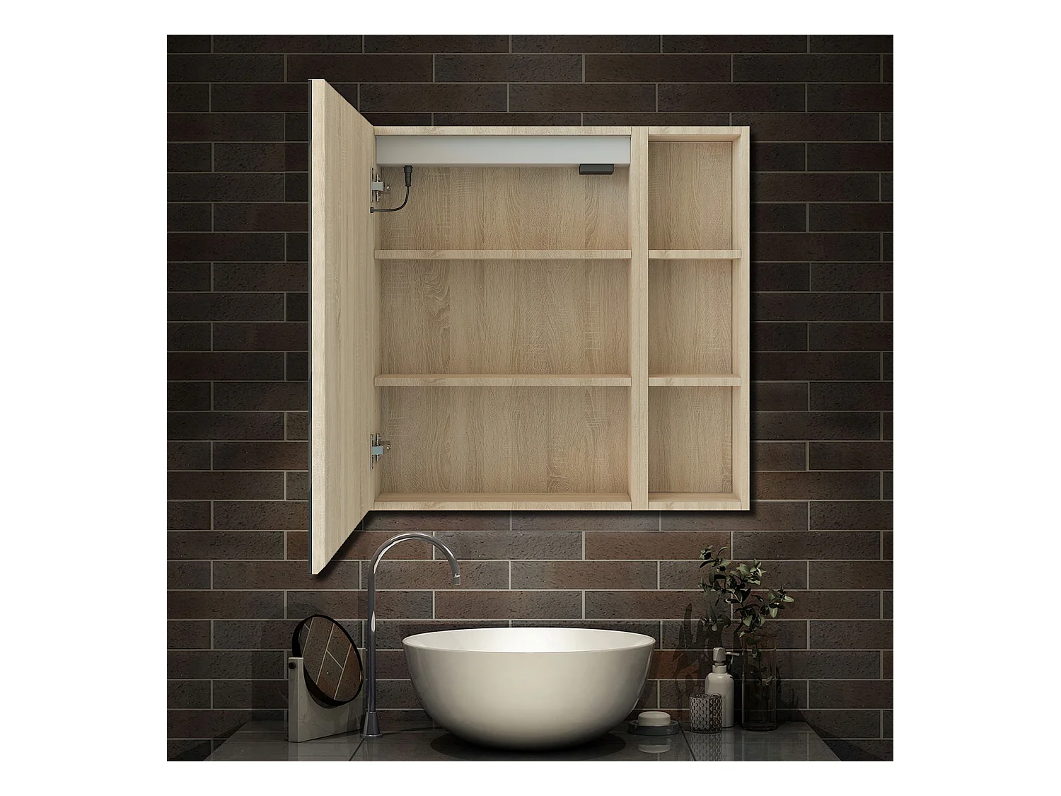 AICA Armoire murale de salle de bain LED, 70x50cm avec Prise Rasoir+Anti-Buée + Tricolore + Dimmable +armoire latérale, Chêne