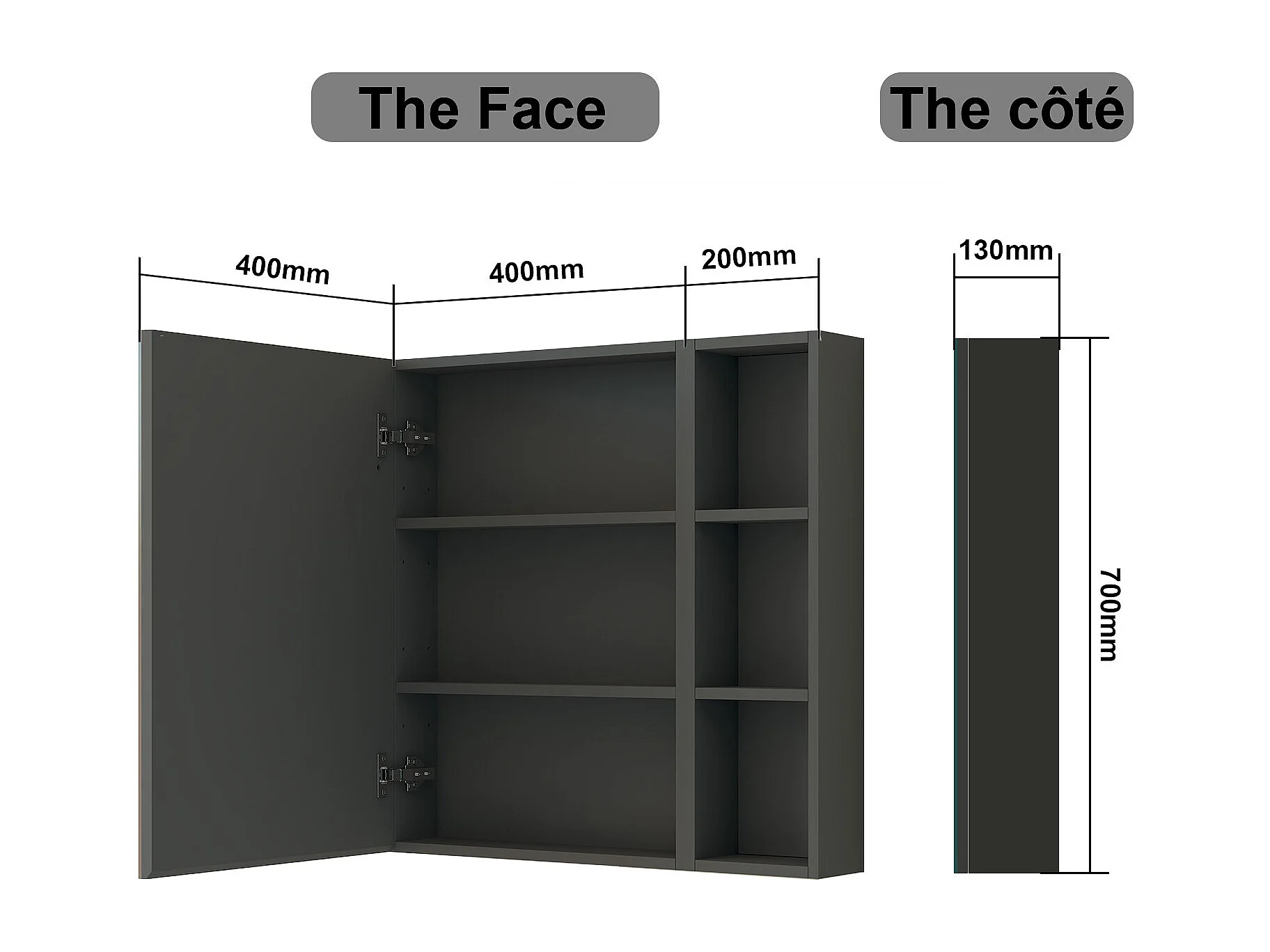 AICA Armoire murale salle de bain, 3 Niveaux placard rangement + 3 étagères latérales ouvertes(70x40x13 cm + 70x20x13 cm), Armoire de toilette sans LED, Anthracite