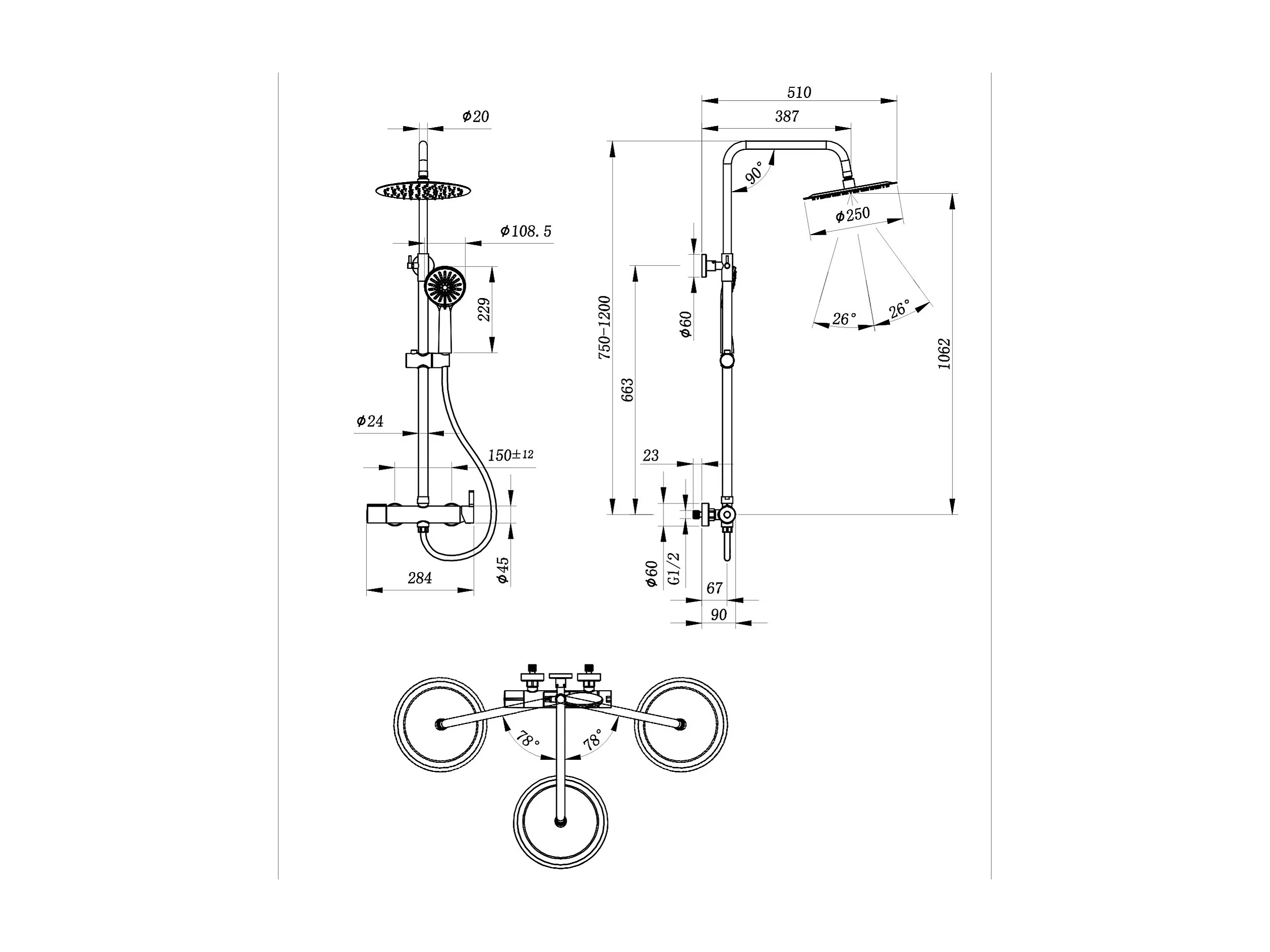 Colonne de douche AICA avec douche de tête ronde 250 mm, douchette 3 fonctions, hauteur réglable 750-1200 mm