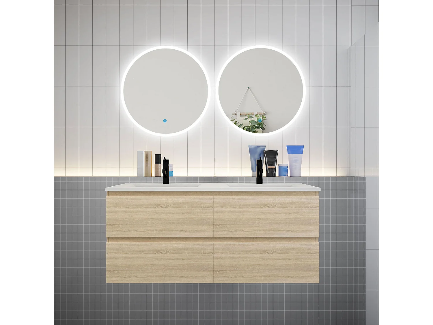 AICA Ensemble meuble de salle de bain double Vasque L.120cm 4 tiroirs + lavabo + 2*LED Miroirs Rond 60cm, Chêne