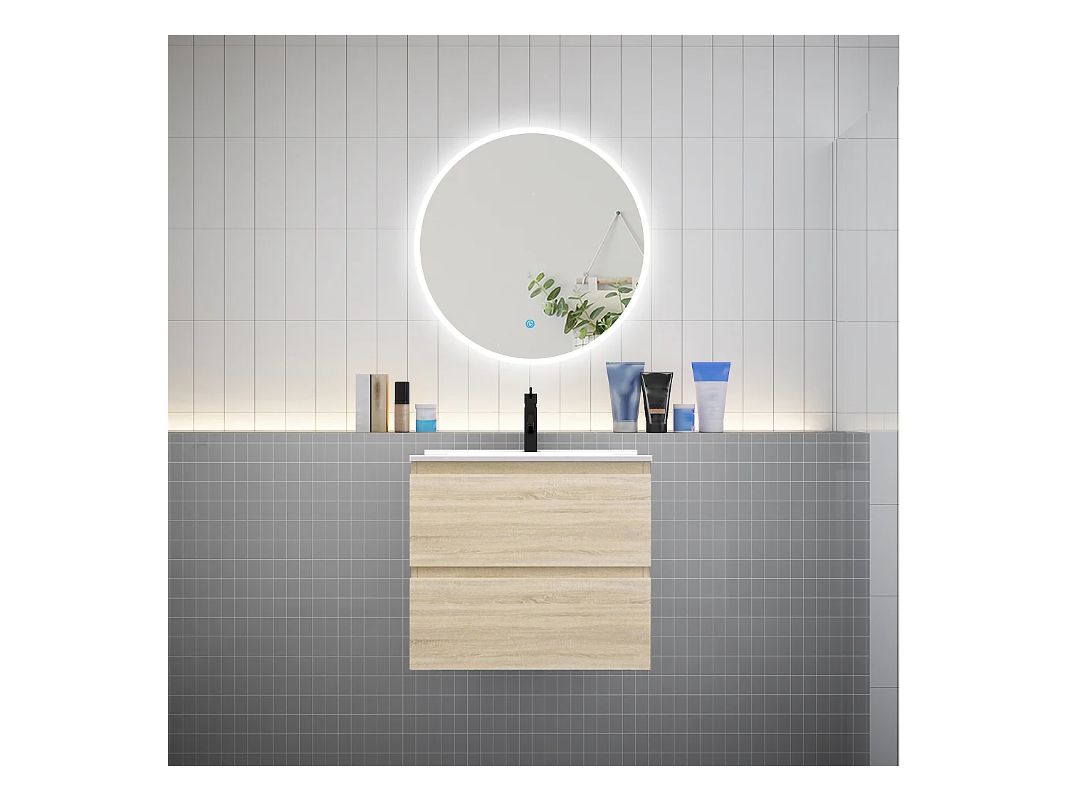 AICA Ensemble meuble de salle de bain Vasque L.60cm 2 tiroirs + lavabo + LED Miroir Rond 70cm, Chêne