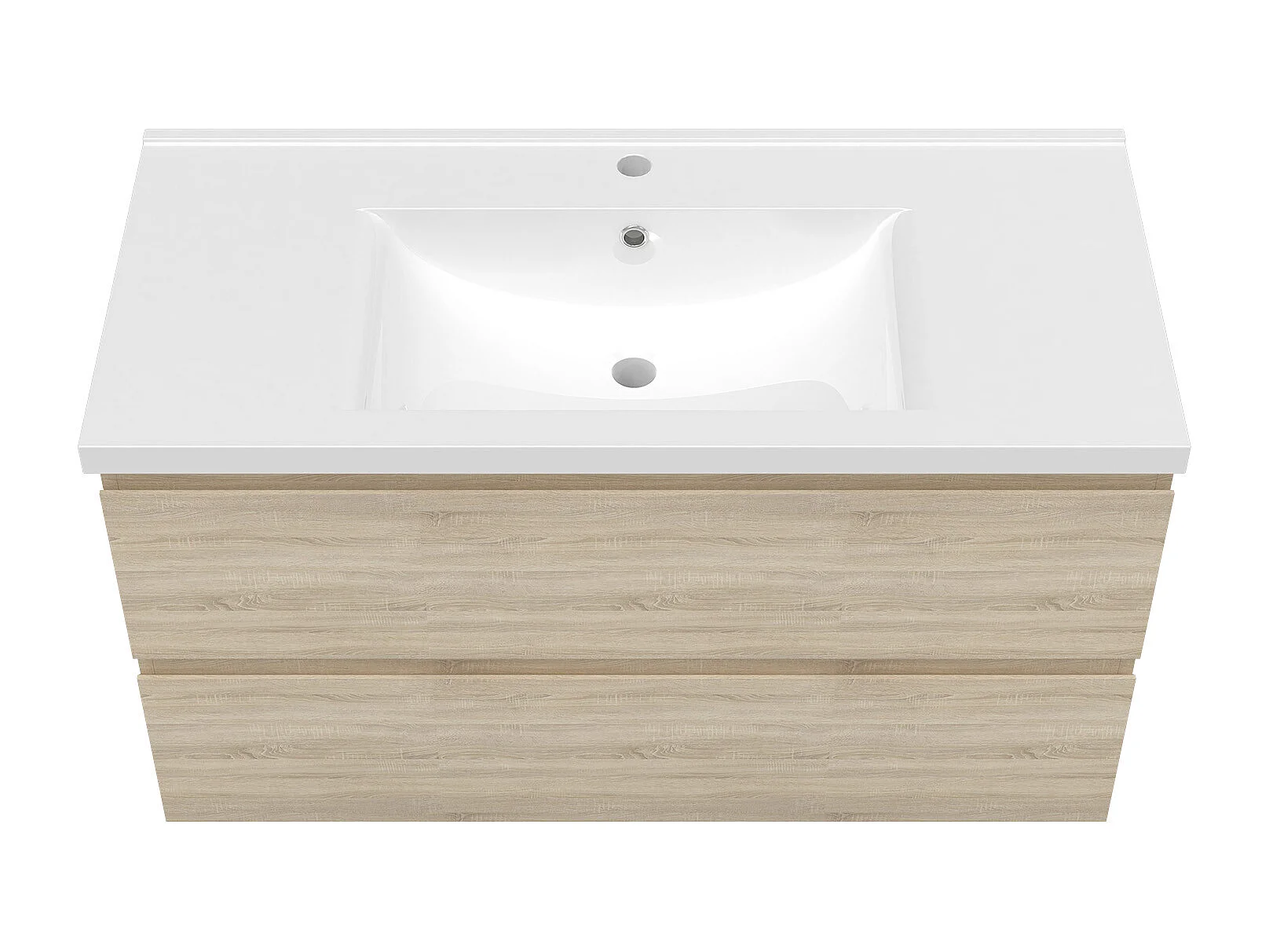 AICA Ensemble meuble de salle de bain Vasque L.99cm 2 tiroirs + lavabo + LED Miroir Rond 100cm + 2*Colonne, Chêne