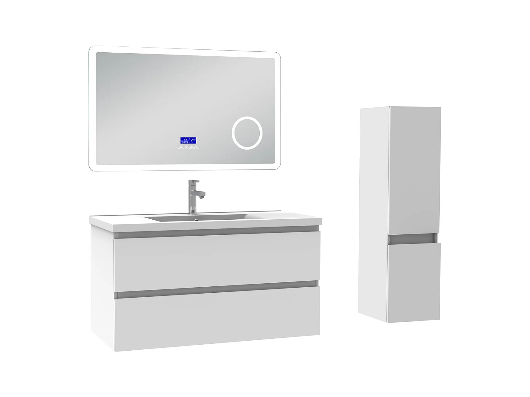 AICA Ensemble meuble Salle de Bain 100cm blanc avec colonne, simple vasque et Led miroir dimmable avec 3 couleurs, Bluetooth et 3X grossissement.