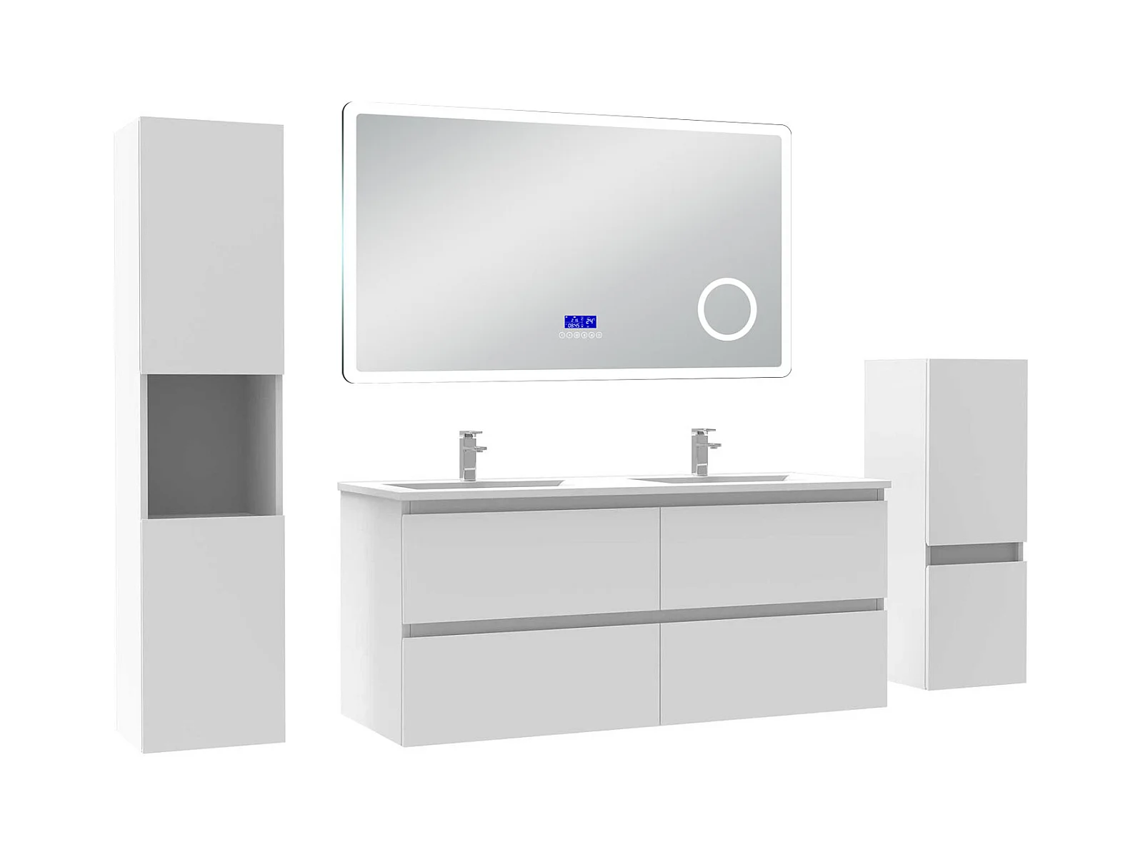 AICA Ensemble meuble Salle de Bain 120cm blanc avec 2 colonnes, simple vasque et Led miroir dimmable avec 3 couleurs, Bluetooth et 3X grossissement.