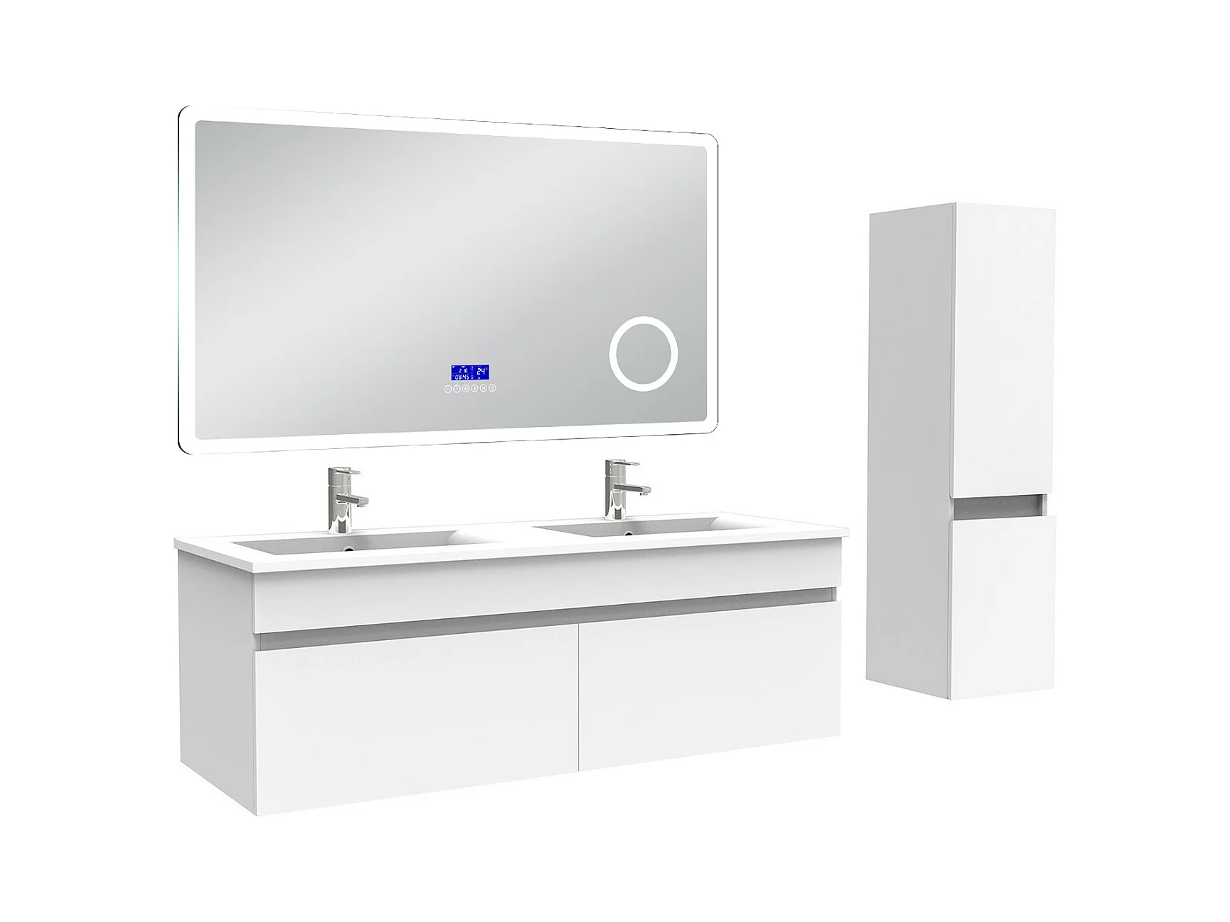 AICA Ensemble meuble Salle de Bain 120cm blanc avec colonne, double vasque et Led miroir dimmable avec 3 couleurs, Bluetooth et 3X grossissement.