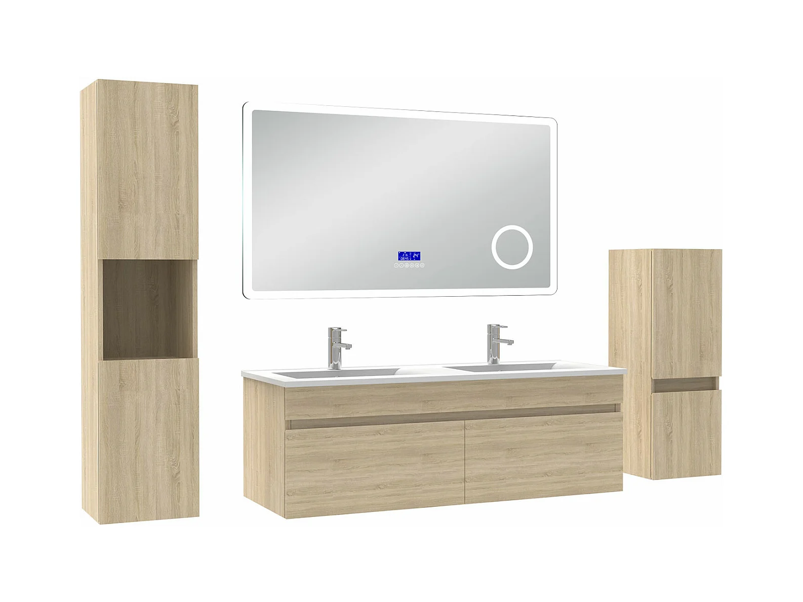 AICA Ensemble meuble Salle de Bain Chêne Wotan 120cm avec 2 colonnes, double vasque et Led miroir dimmable avec 3 couleurs, Bluetooth et 3X grossissement.