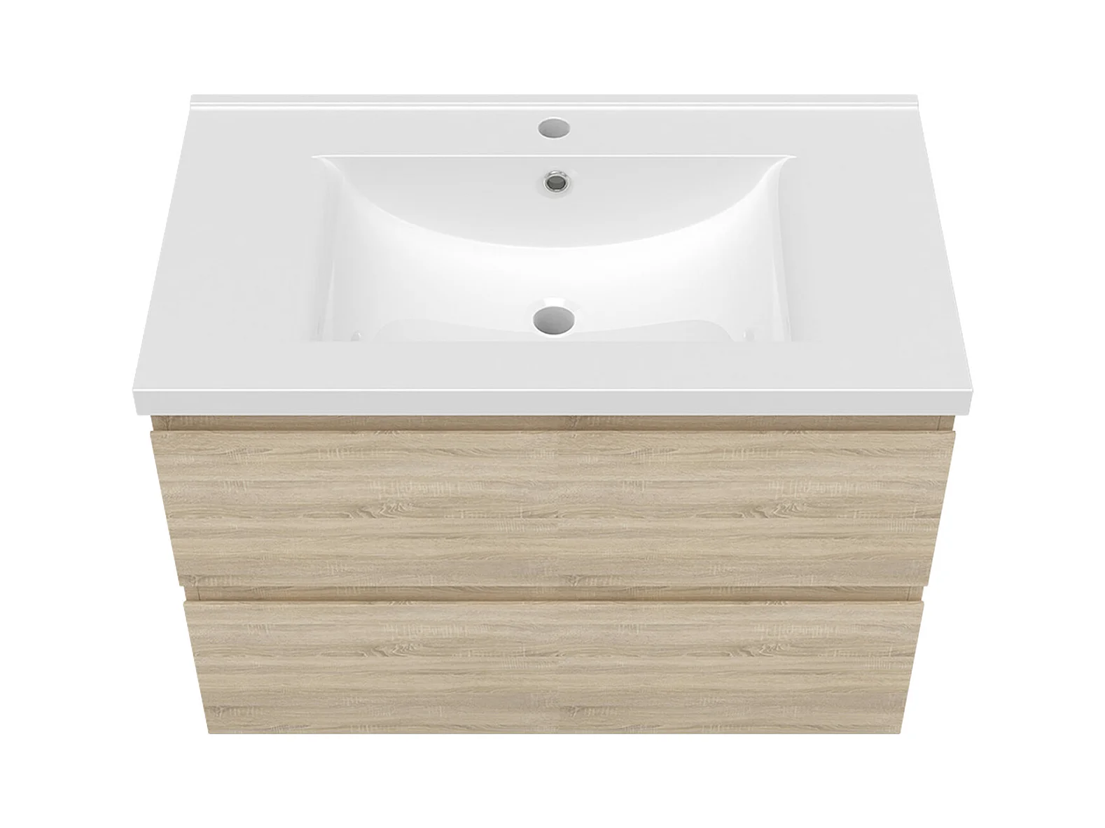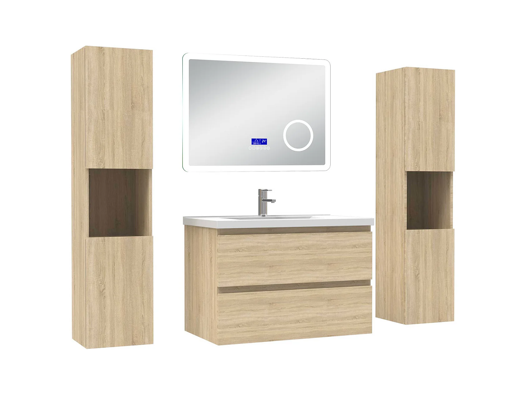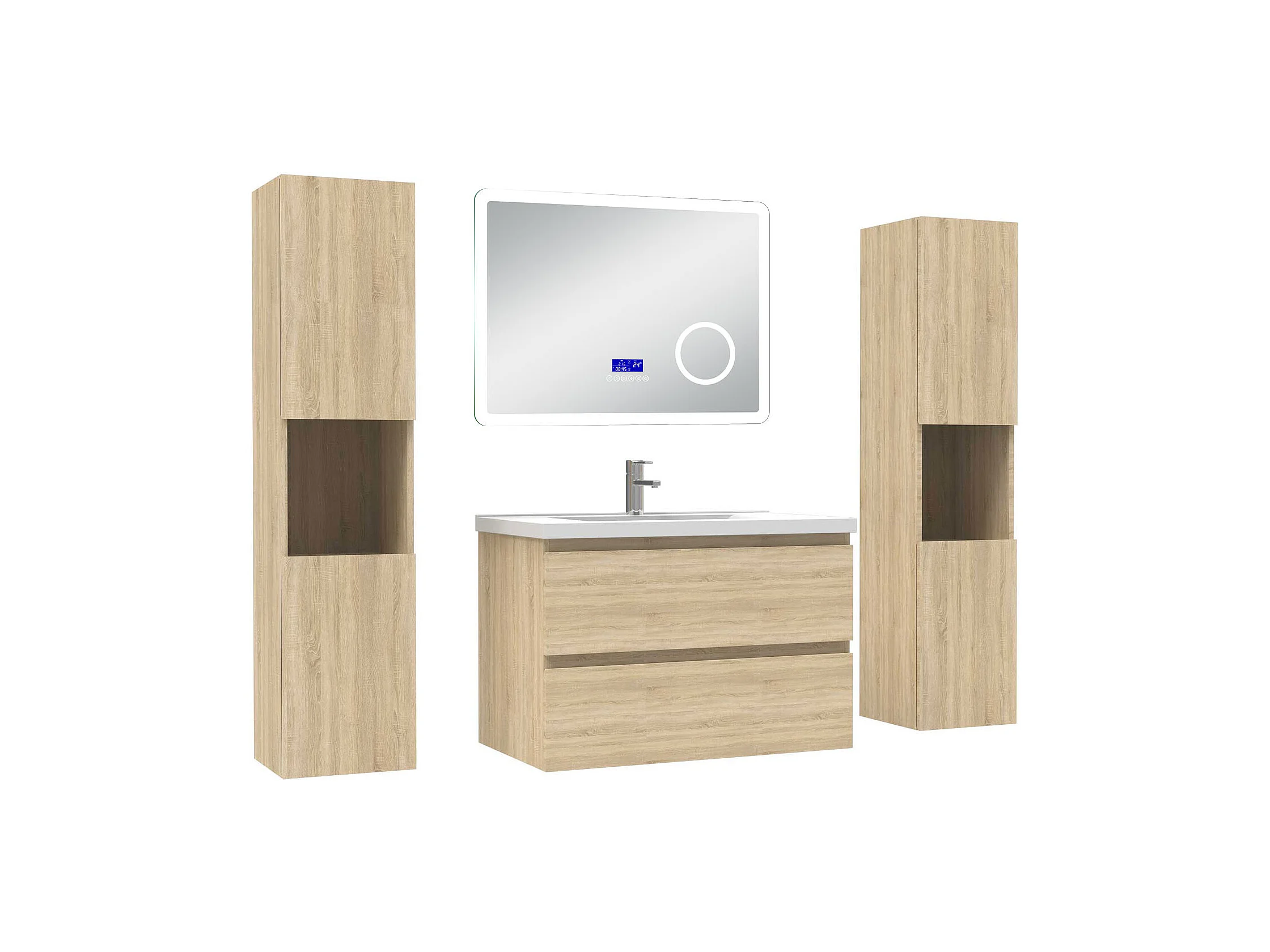 AICA Ensemble meuble Salle de Bain Chêne Wotan 80cm avec 2 colonnes, simple vasque et Led miroir dimmable avec 3 couleurs, Bluetooth et 3X grossissement.