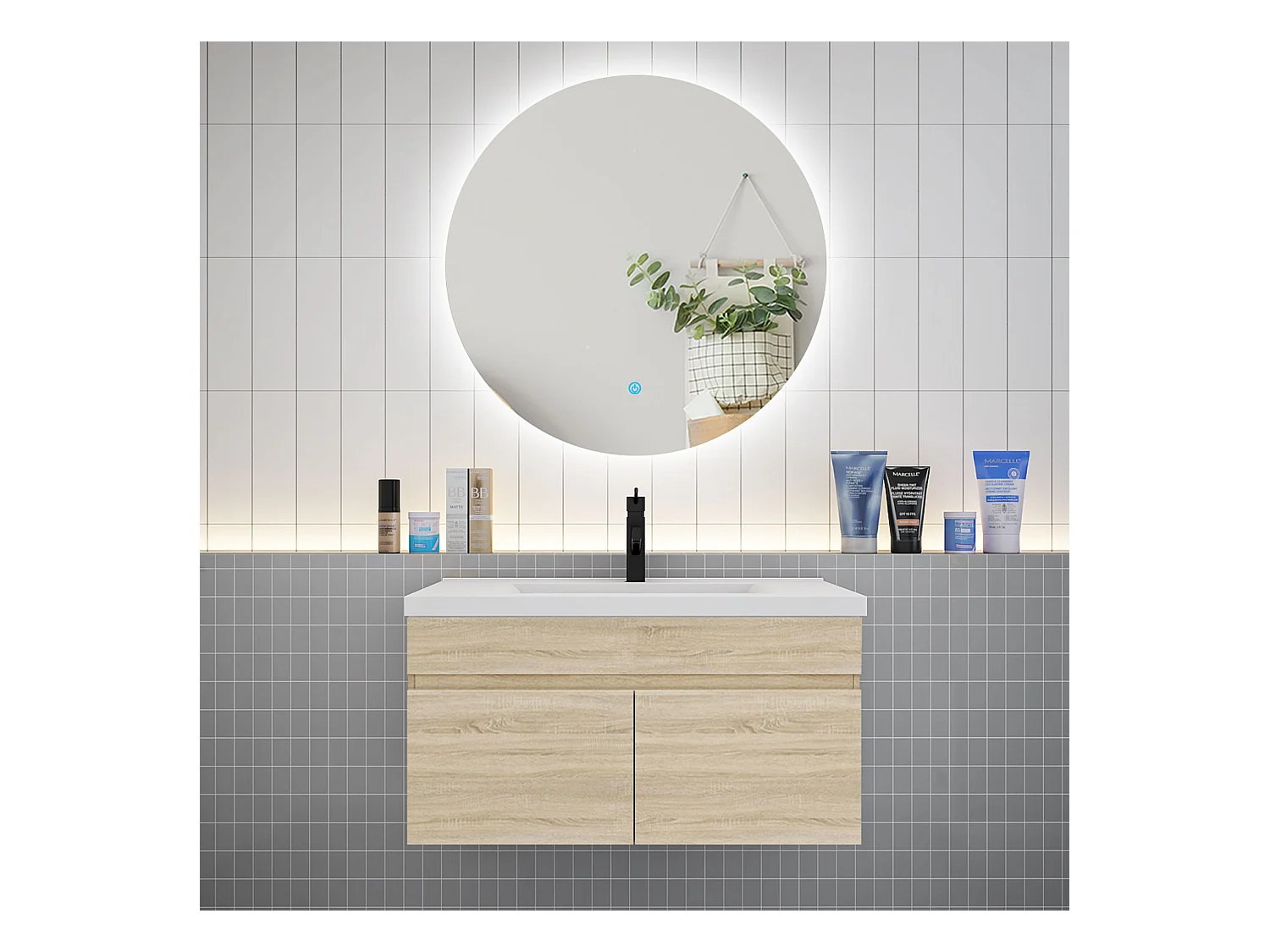 AICA Ensemble meuble Salle de Bain L.80cm Chêne + vasque + Miroir LED Rond 80cm