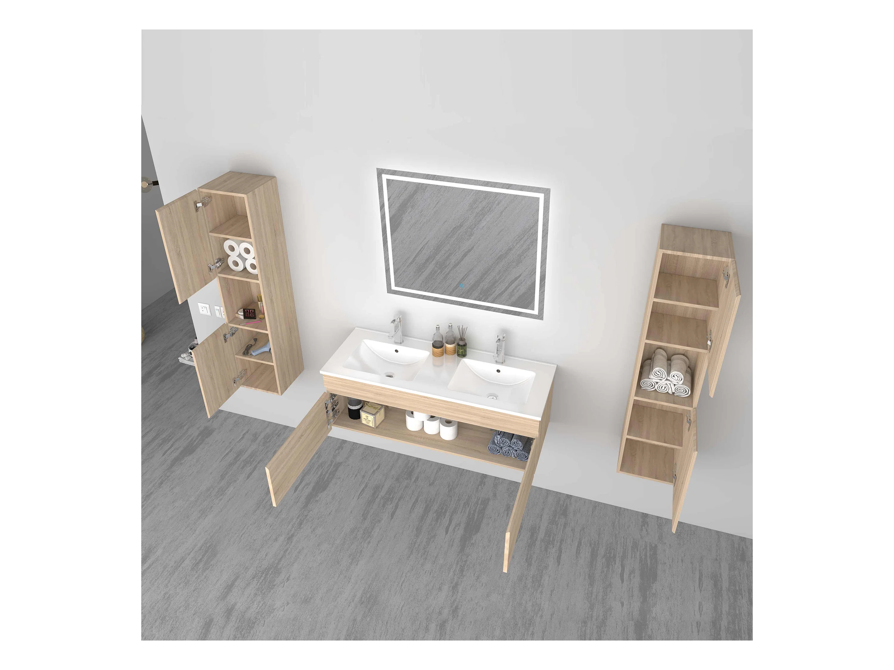 AICA Ensemble meuble Salle de Bain vasque L.120cm Chêne 2 Portes + 2 Colonne + Miroir LED 100 x 80 cm