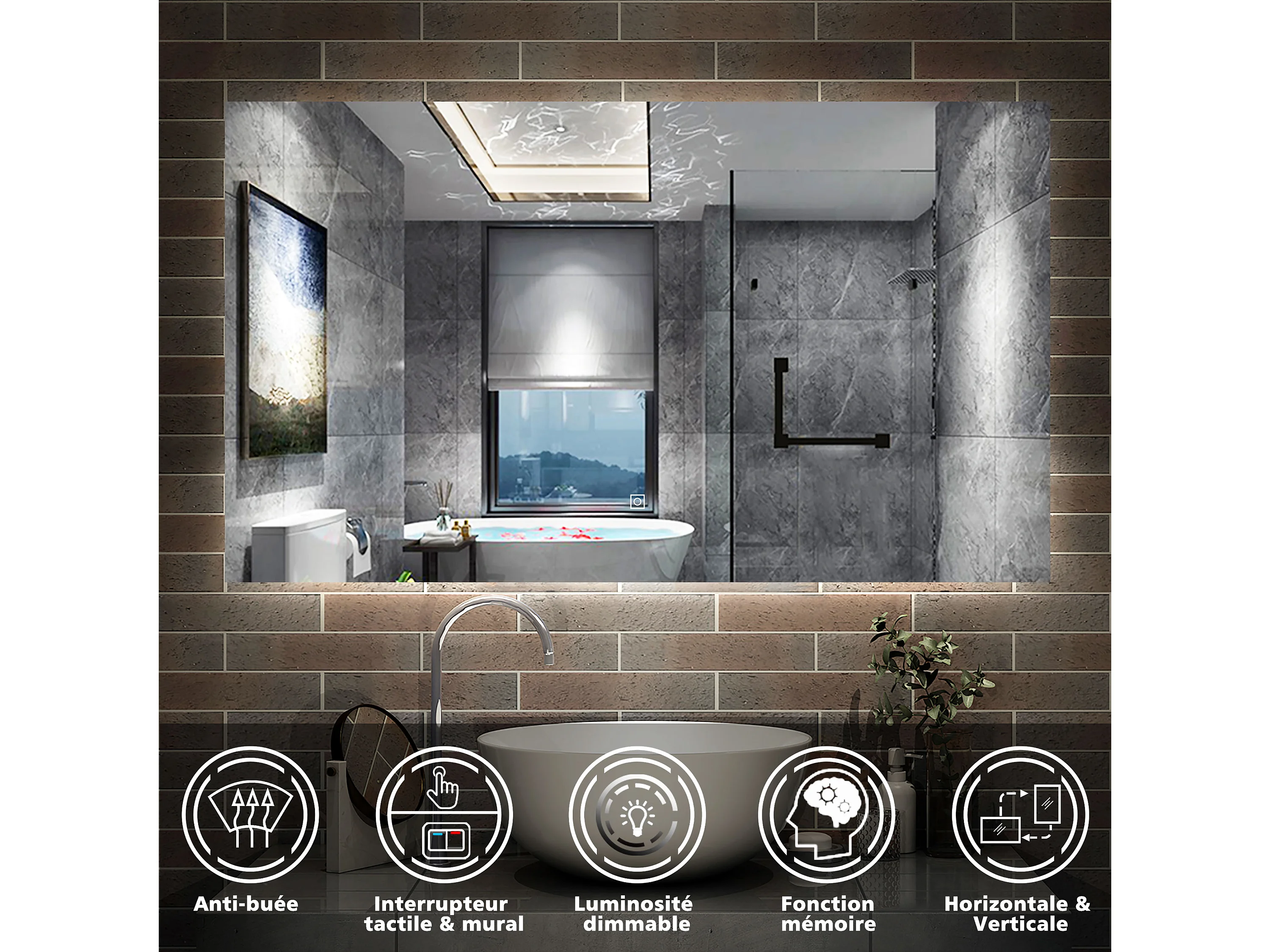 Miroir LED 90x70cm avec Anti-buée + Dimmable, Mural Miroir salle de bain