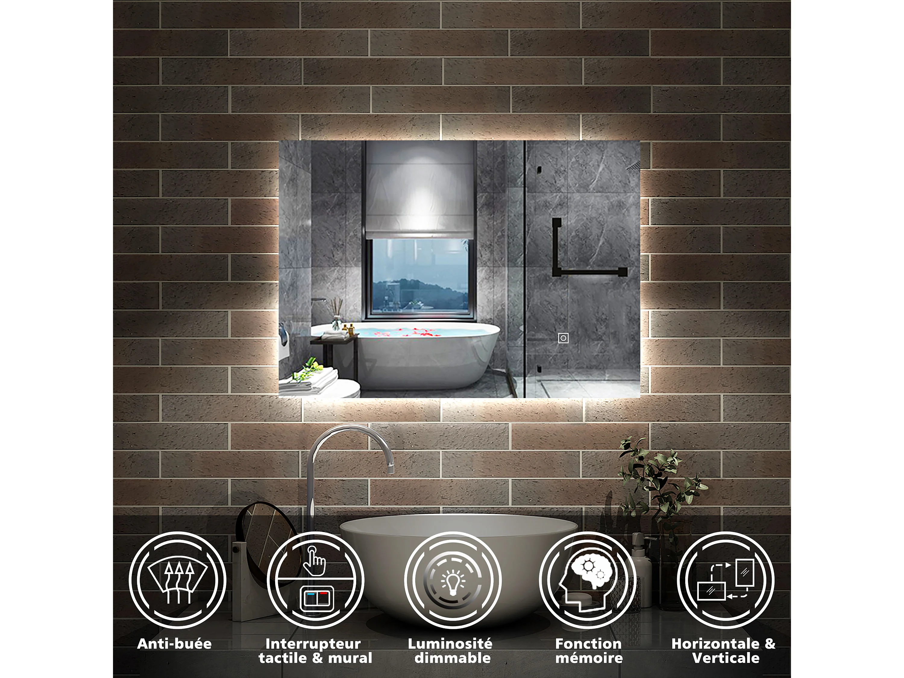 Miroir LED 80x60cm avec Anti-buée + Dimmable, Mural Miroir salle de bain