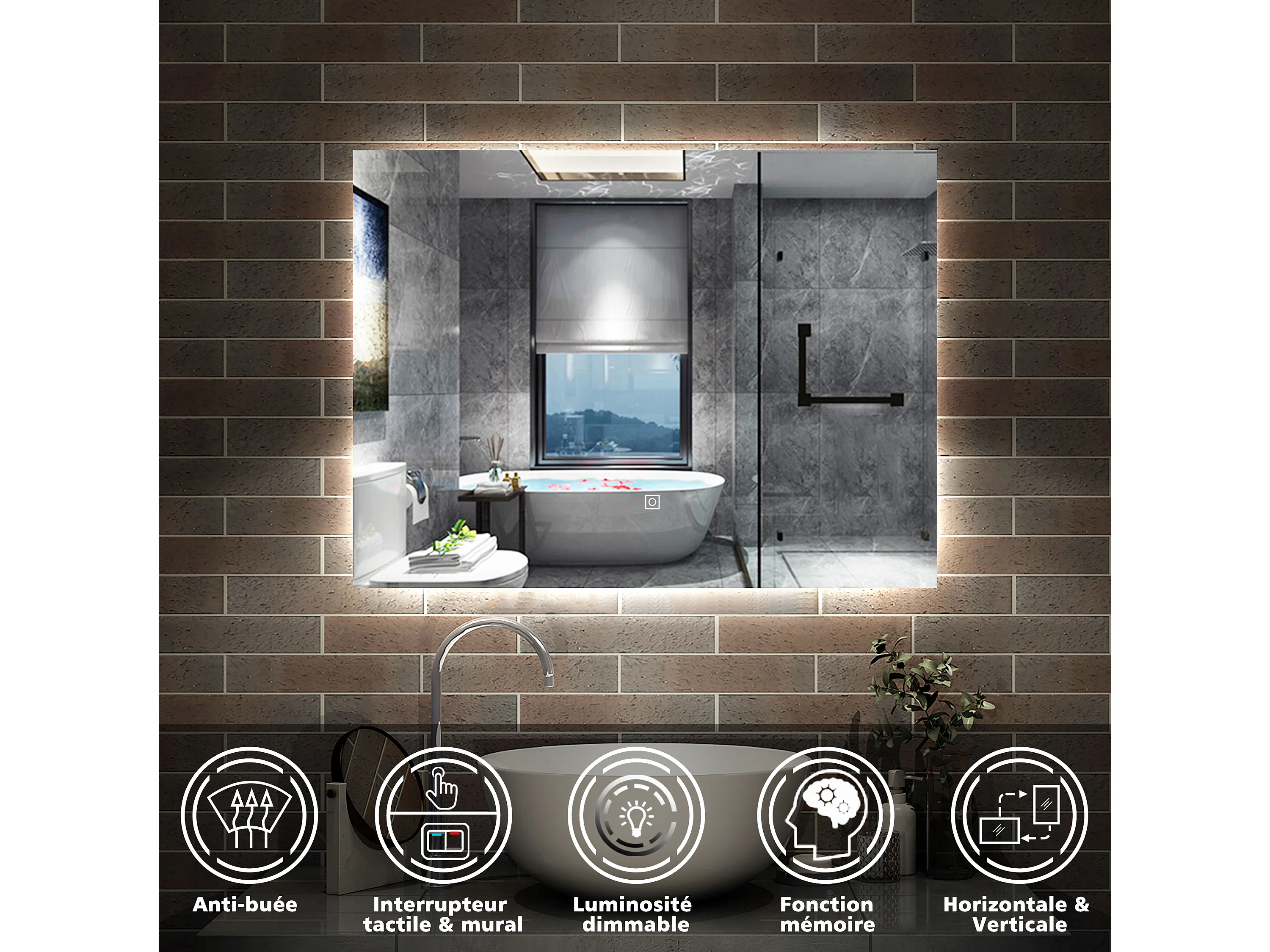 AICA Miroir de salle de bain à LED 80x60cm, Dimmable et Mémoire, miroir lumineux , Anti-Buée