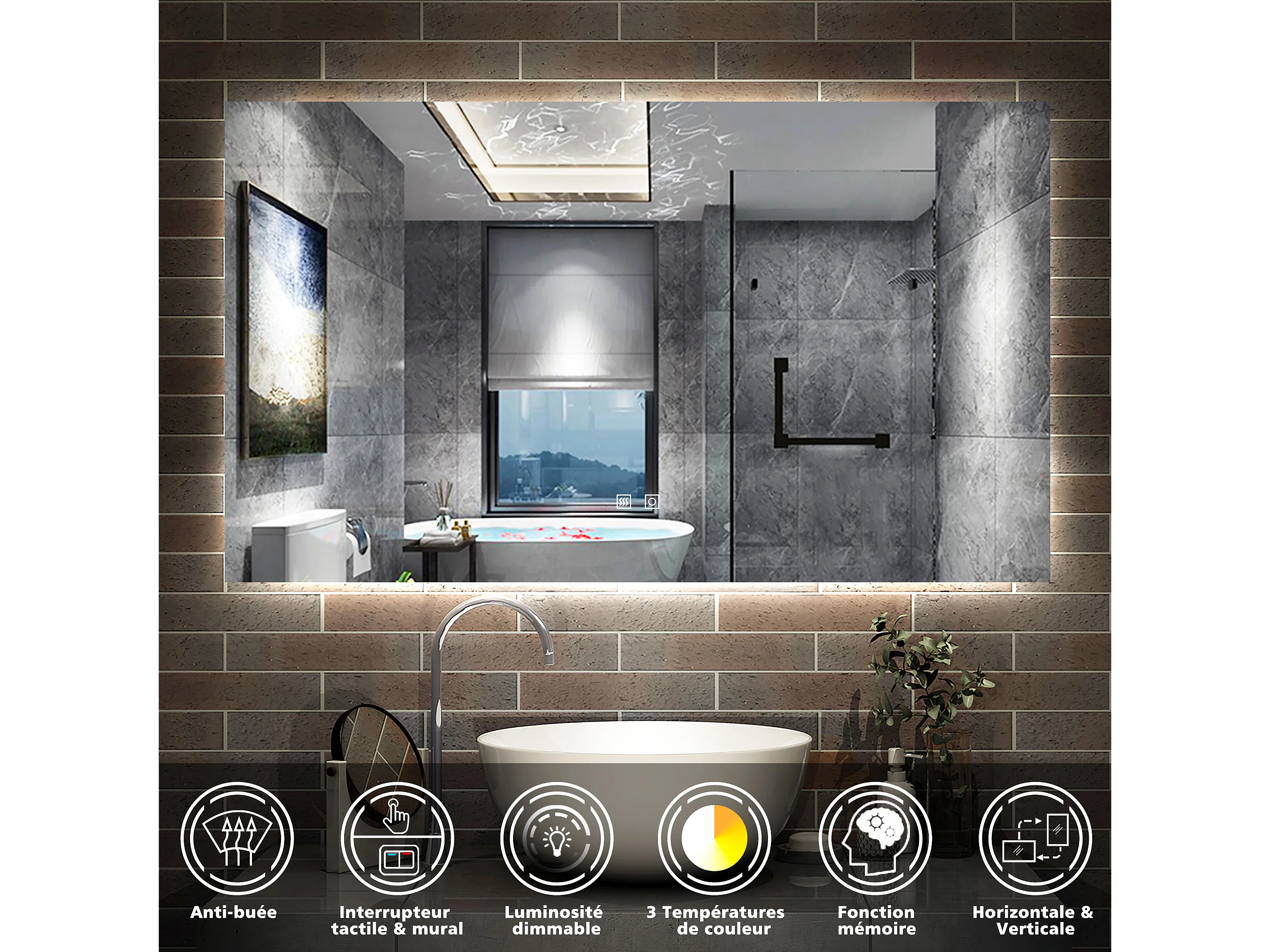 AICA Miroir de salle de bain rétro-éclairé 100x60cm, 3 Colours et Anti-Buée et Mémoire et Dimmable