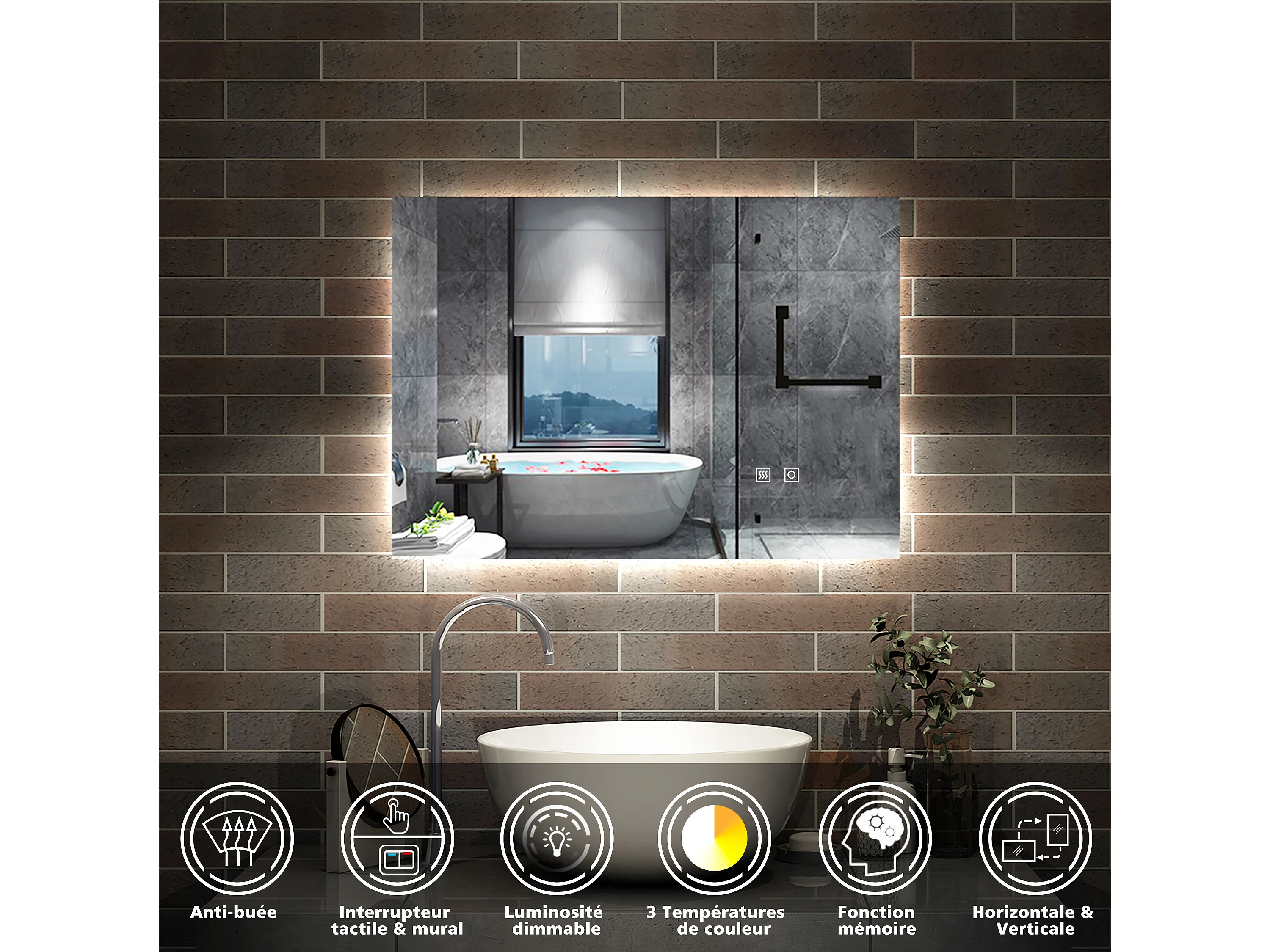 Miroir LED 90x70cm avec Anti-buée + Dimmable, Mural Miroir salle de bain