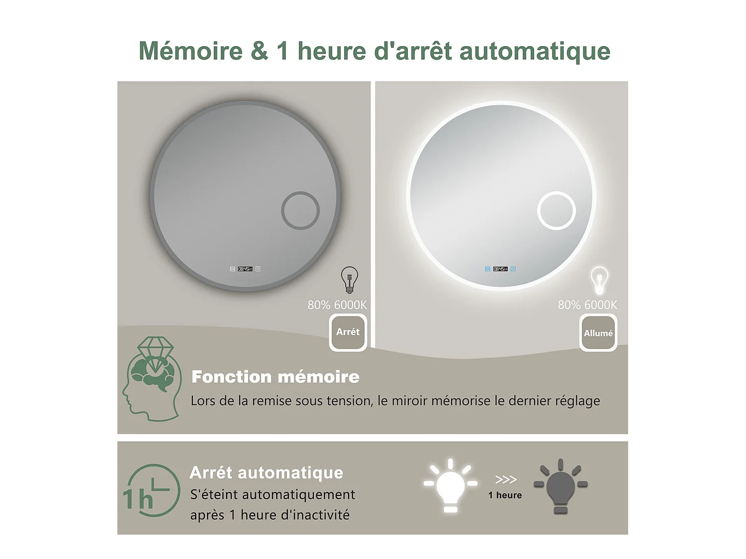 AICA LED Miroir lumineux rond 80cm anti-buée + dimmable + mémoire miroir salle de bain