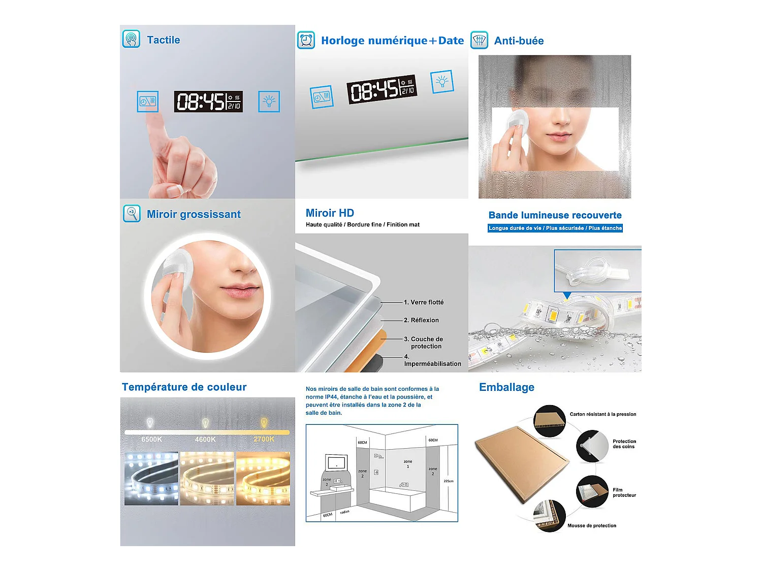 AICA Miroir LED Rond 80cm Tricolore + Dimmable + Horloge + Fonction Mémoire + Anti-Buée