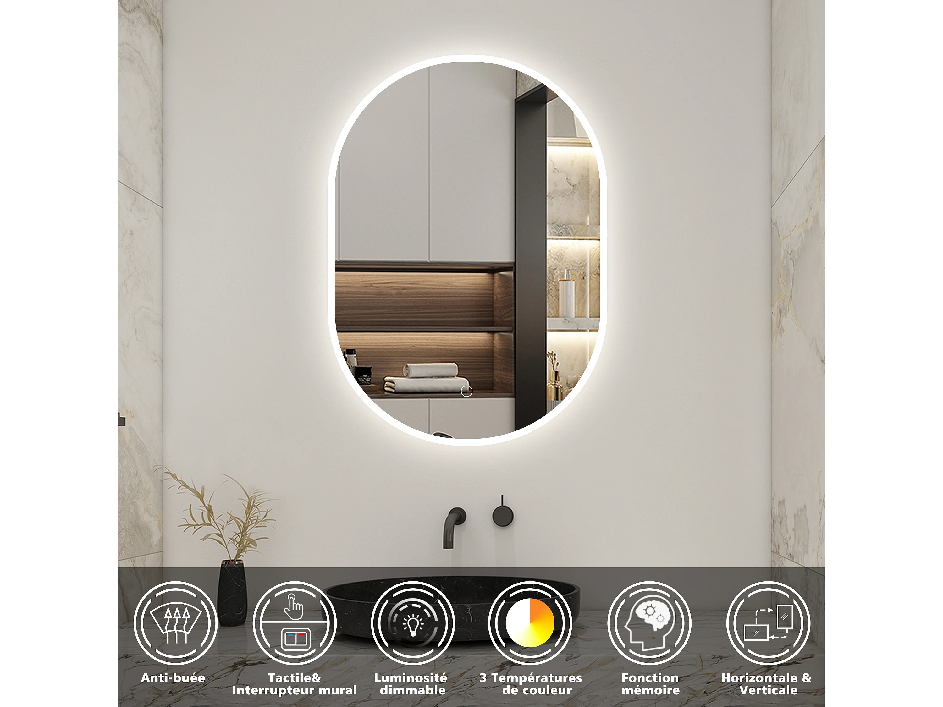 Miroir salle de bain LED ovale 45x90cm anti buée et LED 3 couleurs