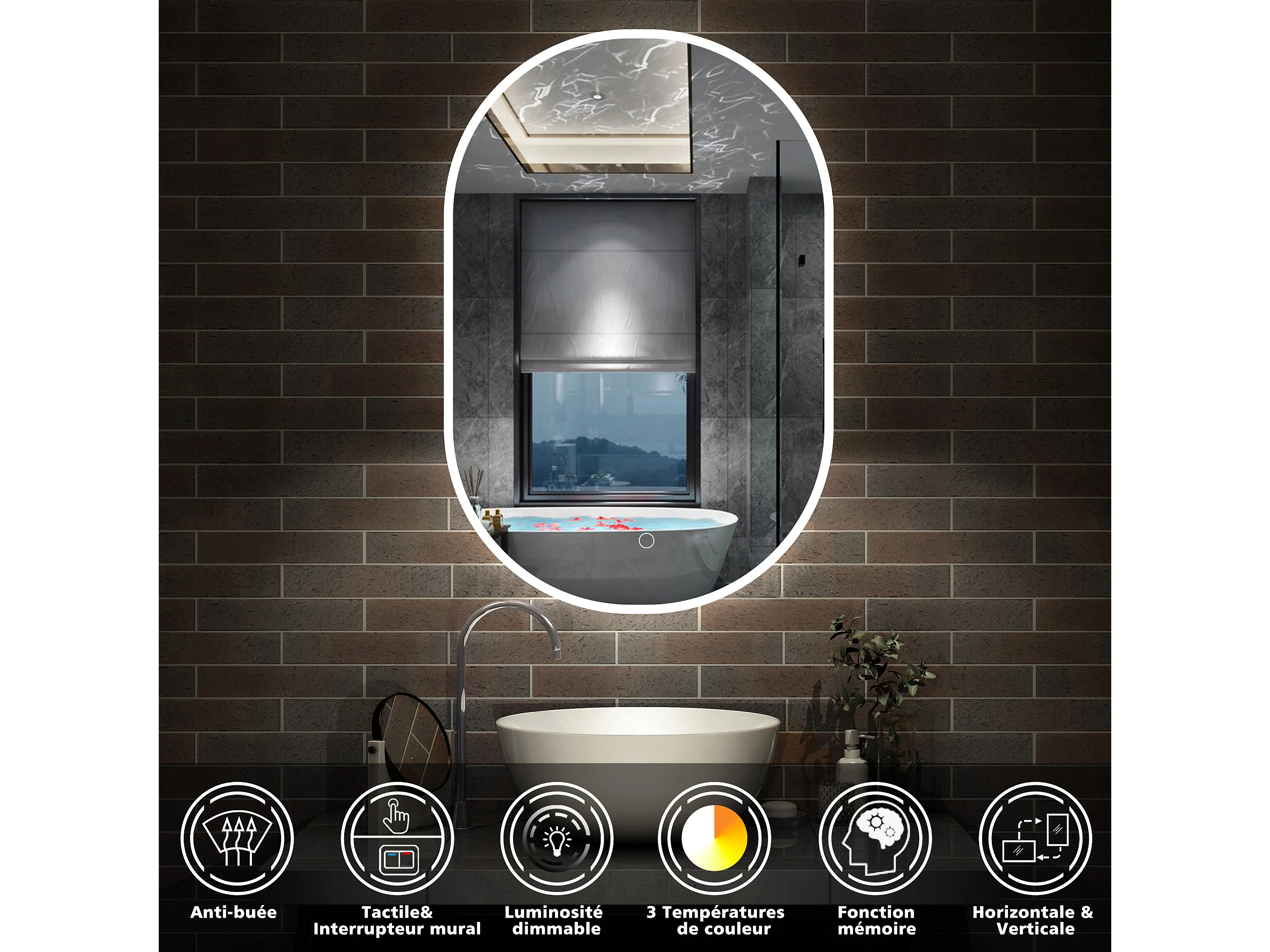 AICA Miroir de salle de bain ovale 50x90cm, mémoire et dimmable et anti-buée, IP44, CE // IP44