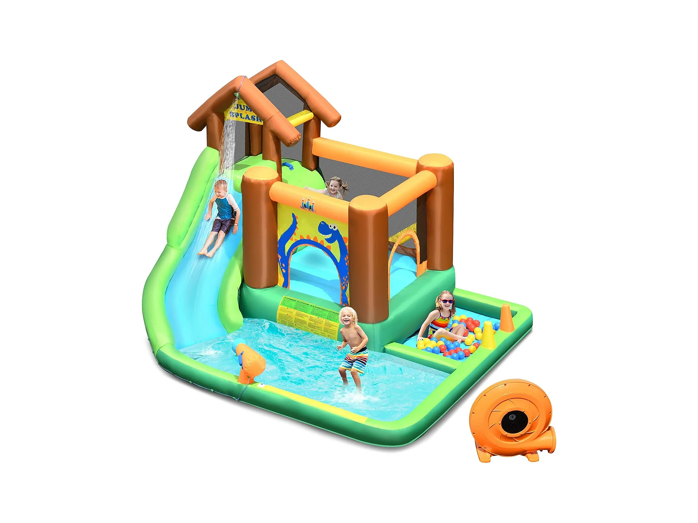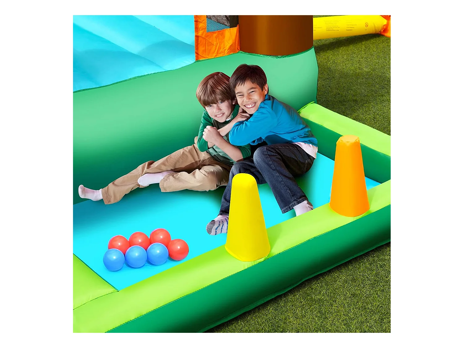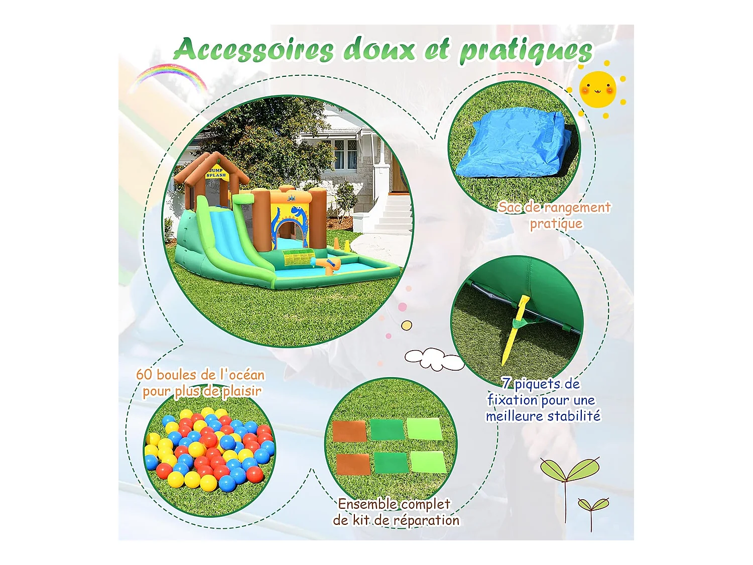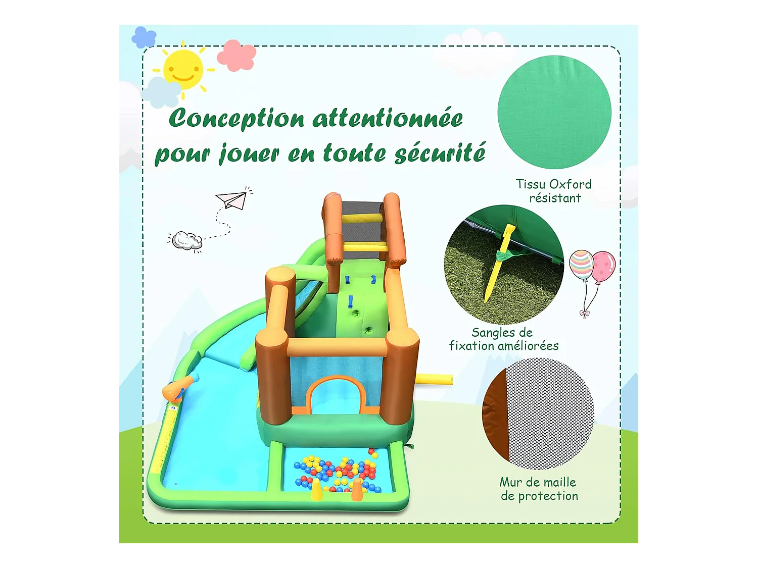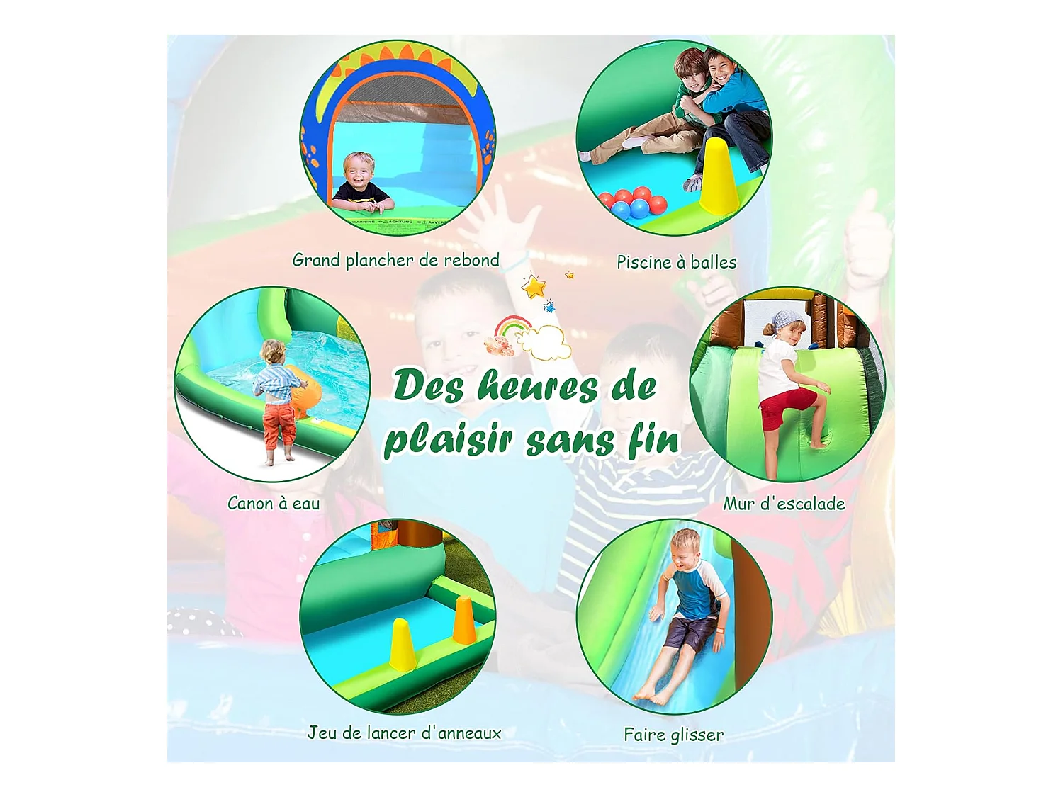 Aire de Jeux Gonflable Enfant avec Souffleur 610W Pataugeoire Mur d'Escalade Canon à Eau Trampoline Intégré Balles Colorées