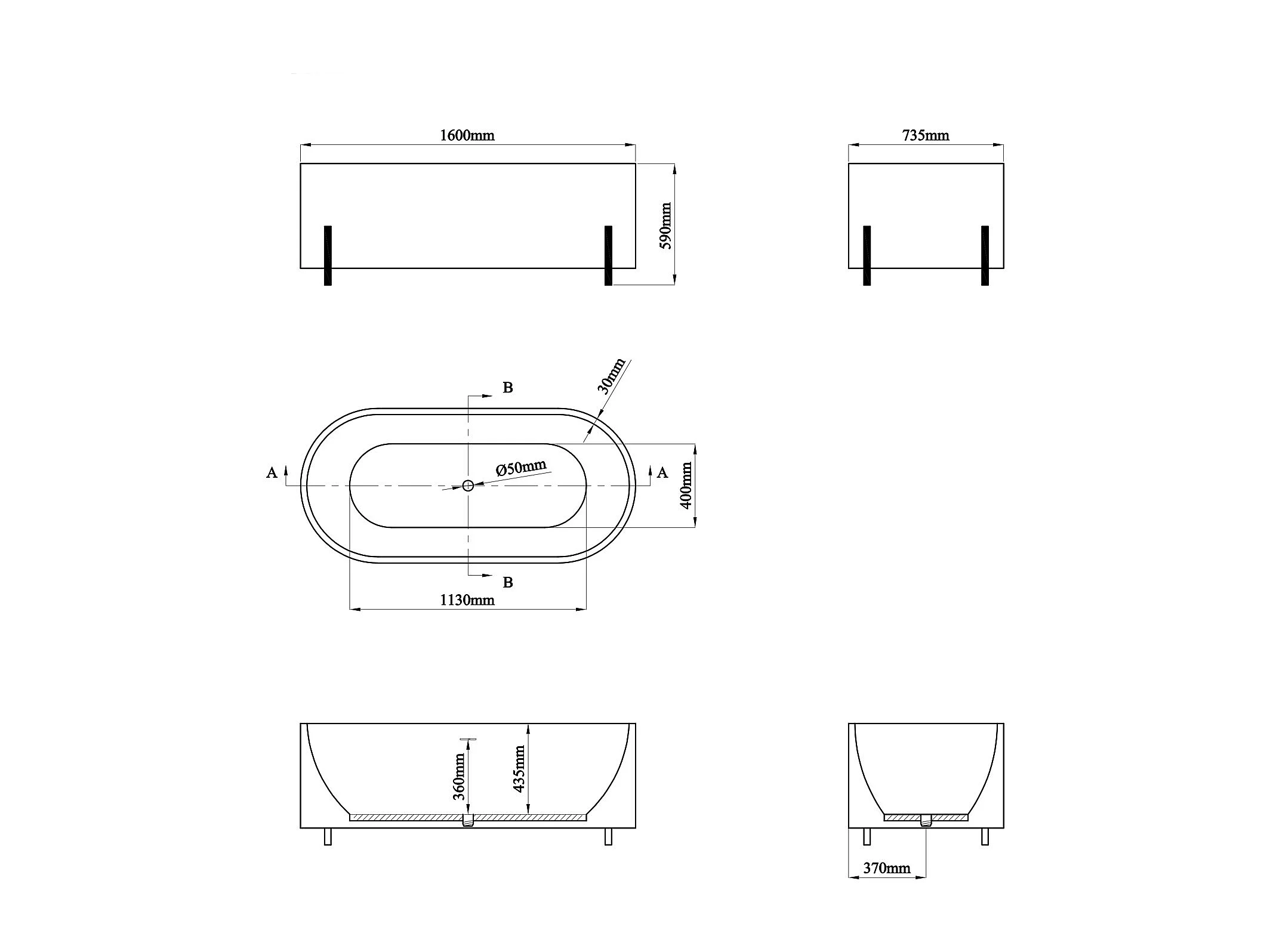 Baignoire îlot ovale blanche avec pieds dorés - 160 x 73,5 x 59 cm - ALONSA