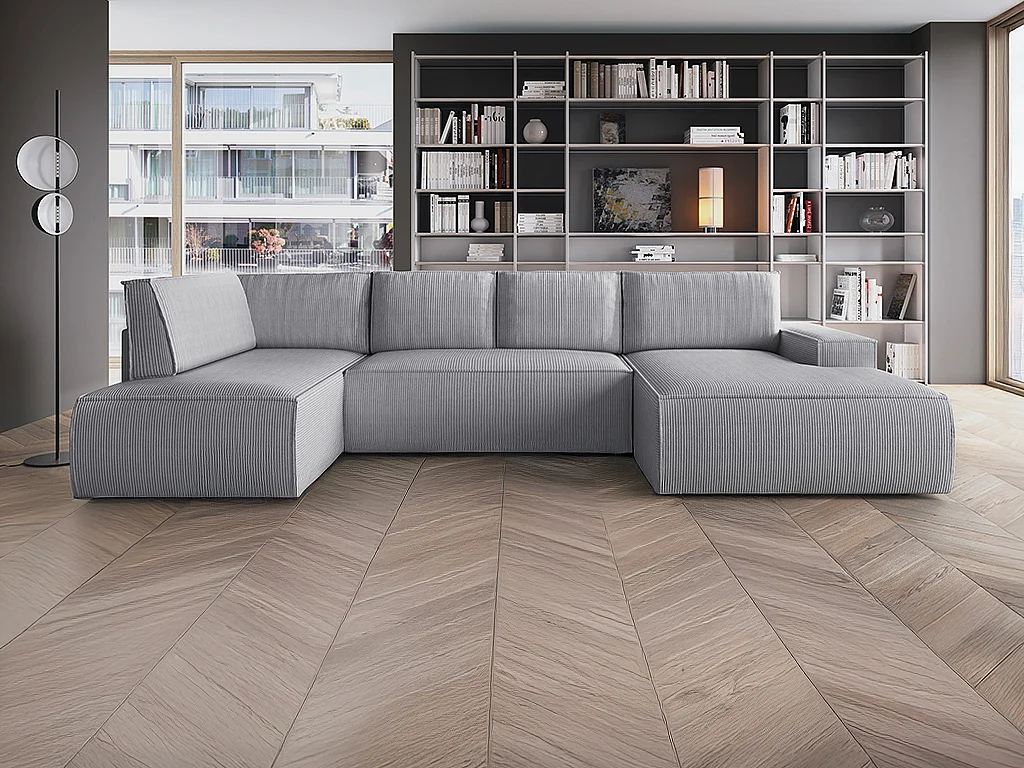Grand canapé d'angle droit panoramique convertible en velours côtelé gris clair AMELIA