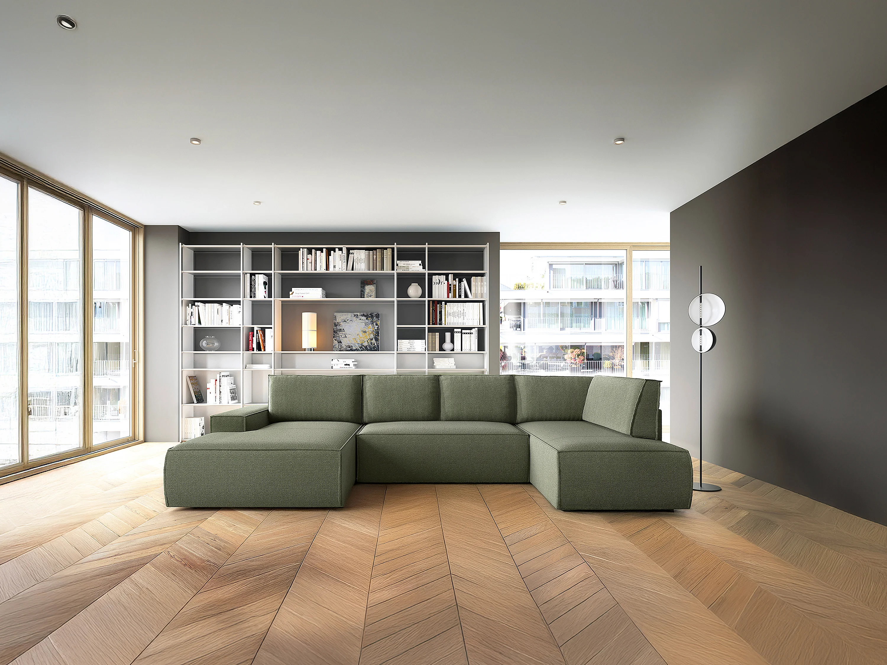Grand canapé d'angle gauche panoramique convertible en tissu texturé vert AMELIA
